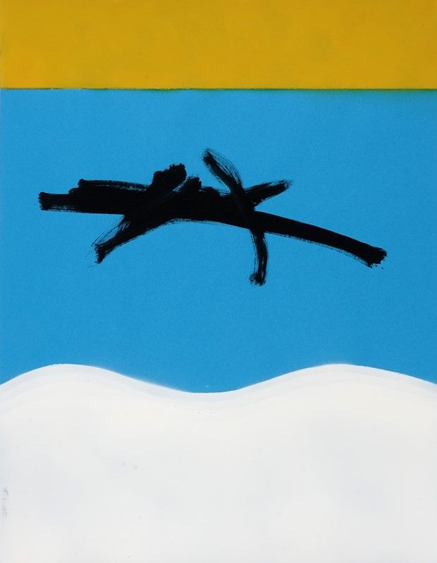 Tempera e colore smaltato su carta greve azzurra. cm 42x54,5. Firma a matita in basso a destra.