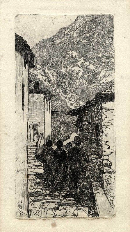 Acquaforte su zinco. mm 178x89. Foglio: mm 370x247. Baboni-malesci, XXIV. Bonagura, 11. Franconi, 16. Timpanaro, 8. Firmata sulla lastra in basso a sinistra. Conosciuta anche con i titoli, Montagna Pistoiese, Tre figure in una strada di montagna e Paese Toscano. Esemplare in tiratura coeva.
