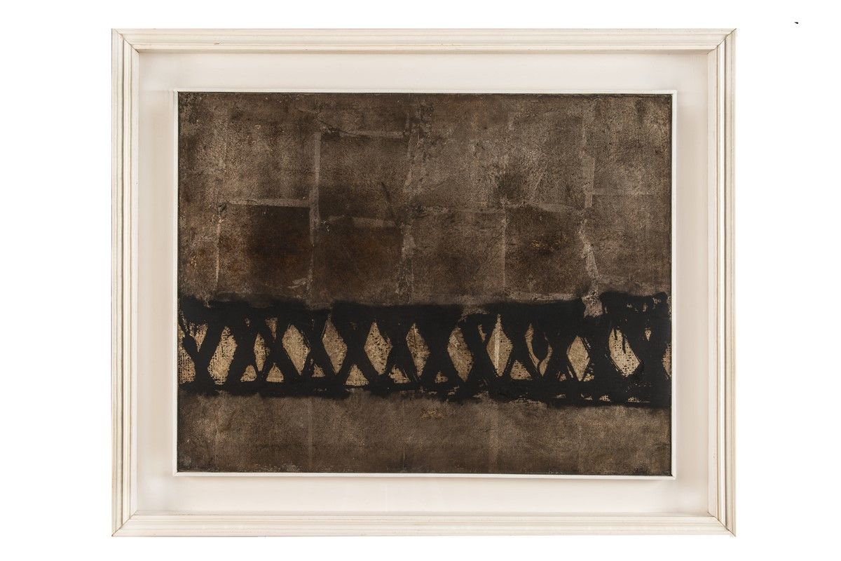 Olio, vernice metallizzata e foglia d'oro su tela. cm 50x65. Firma e data al verso. Molto raro da trovarsi in pittura.