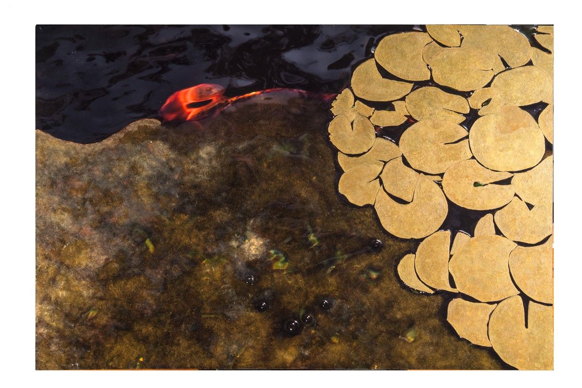 Tecnica mista su carta fotografica applicata a dibond. cm 67x100. Firme e anno di esecuzione al verso. Opera proveniente dalla serie Meditation Garden.