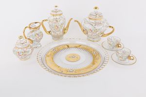 bicchiere cm 9, bottiglia cm 27, vassoio cm 33 composto da sei biccherini, una bottiglia ed un vassoio circolare; [..]