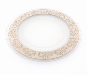 diametro cm 35 con tesa dorata percorsa da fiori recisi affiancati da volute vegetali ricurve. Iscritto lungo [..]