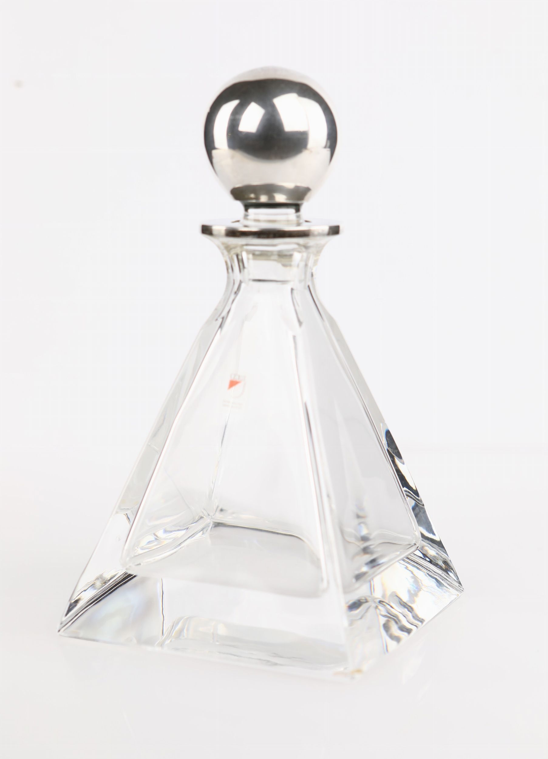 Bottiglia da liquore piramidale in cristallo con tappo rivestito in argento, Colle, [..]