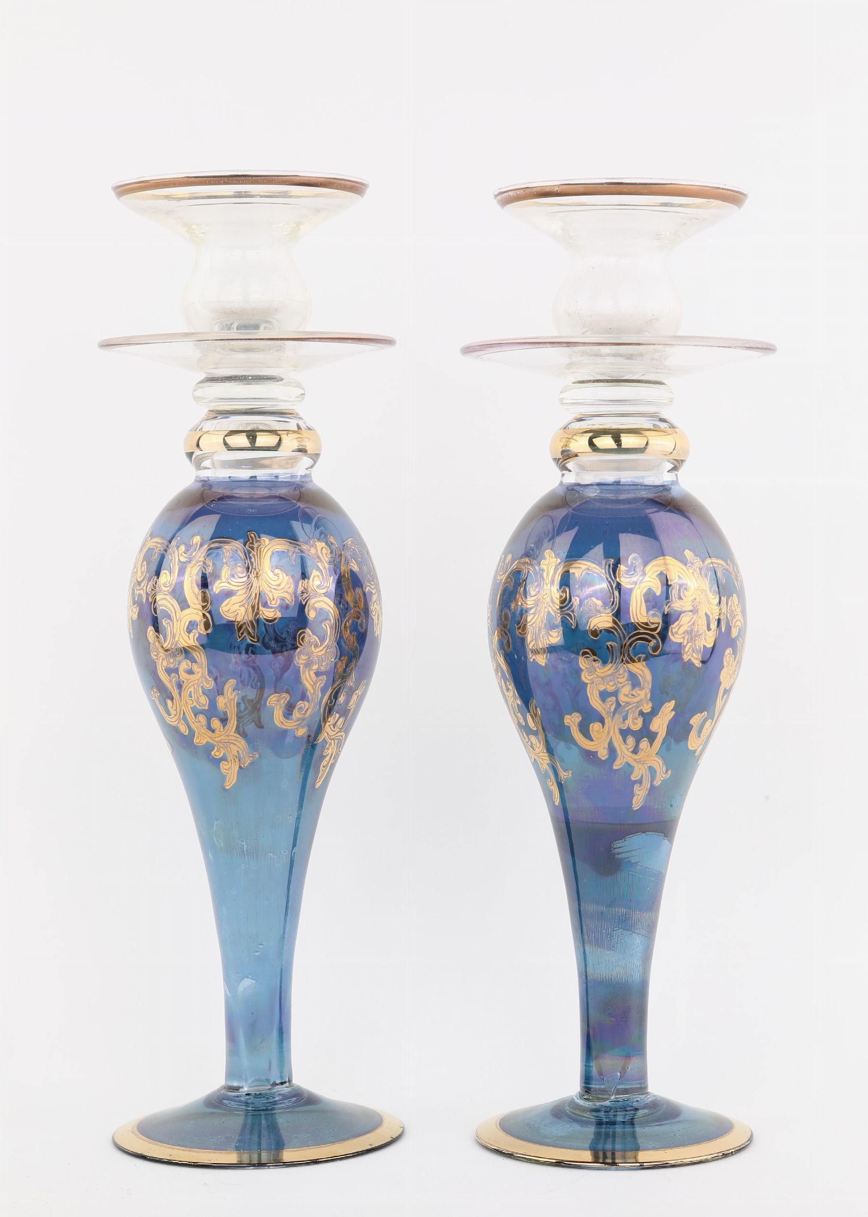Coppia di grandi candelieri in vetro blu con decorazione dorata