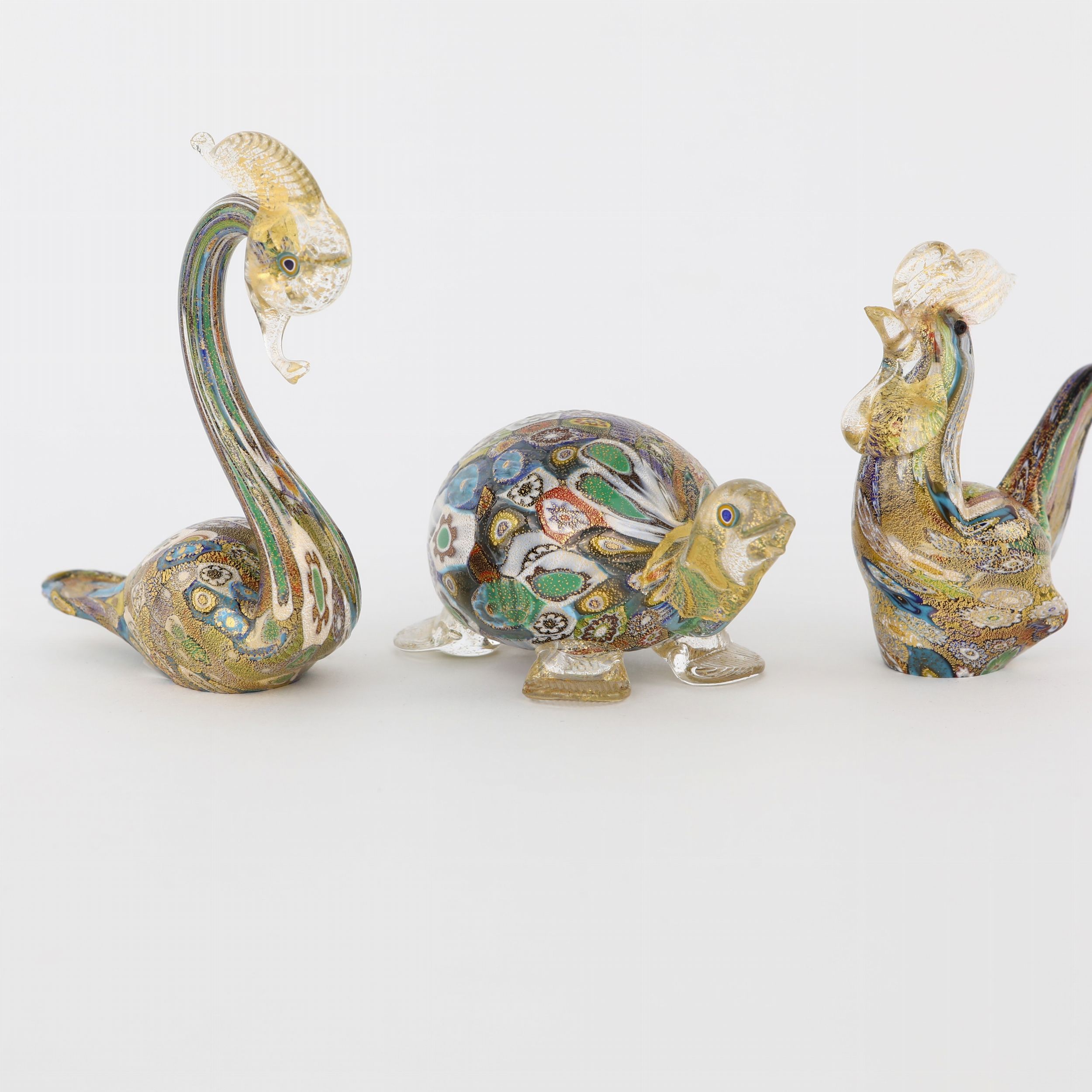 con foglia d'oro e murrine millefiori policrome, raffiguranti una tartaruga, un gallo ed un cigno; ognuno reca iscritto La Murrina 94