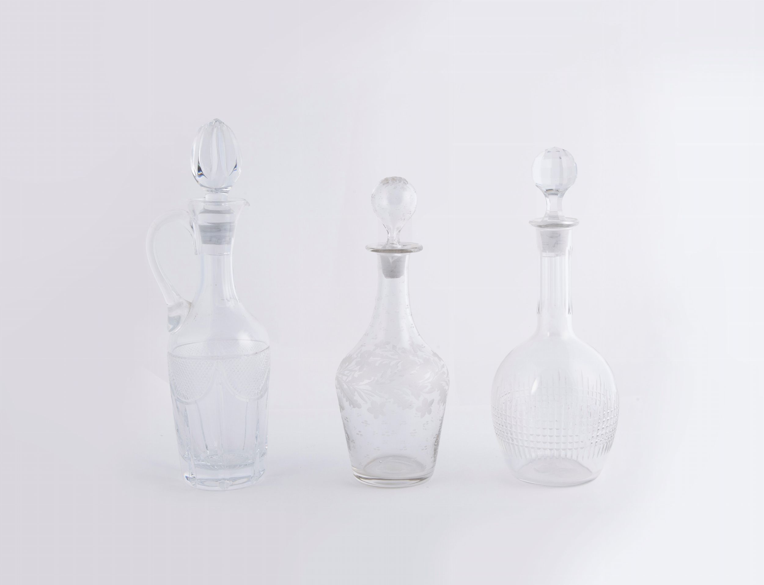 Tre bottiglie diverse con tappo ed un'oliera in vetro