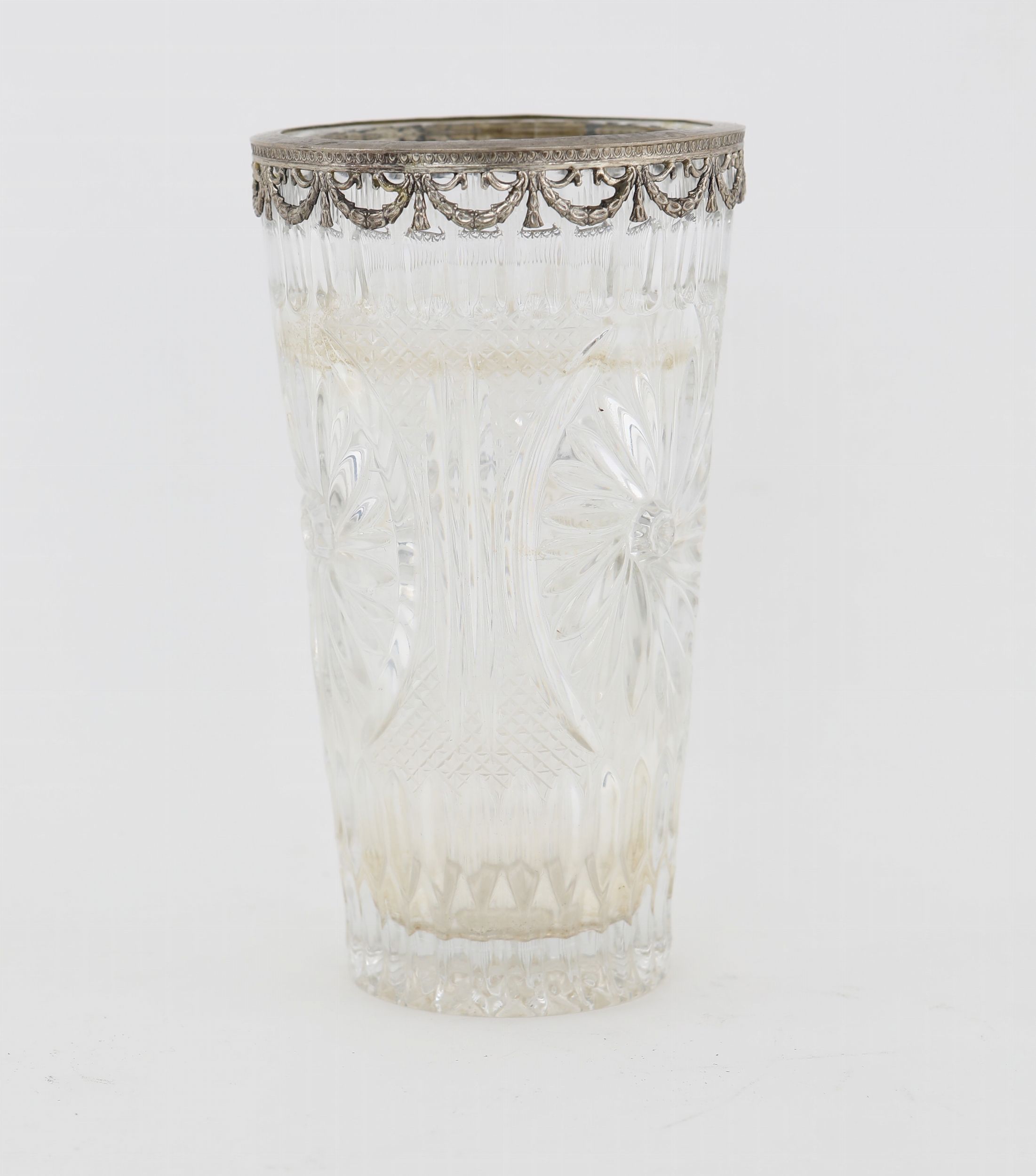 di forma cilindrica con orlo rifinito in argento cesellato con festoni sbalzati