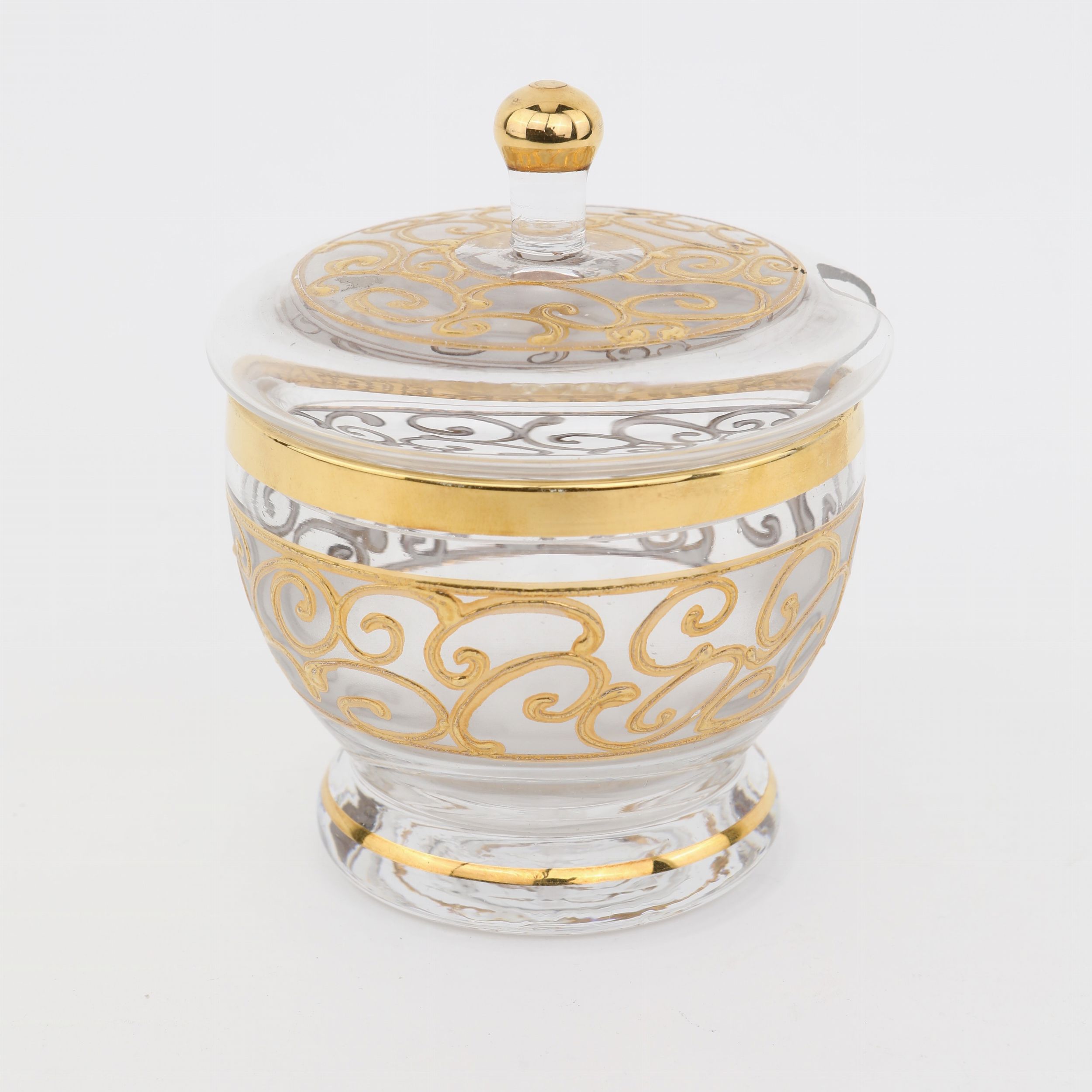 con decorazione in oro realizzata a mano in forma di motivi a ricciolo disposti lungo una fascia ornamentale; coperchio con pomolo a sfera e apertura per il cucchiaio
