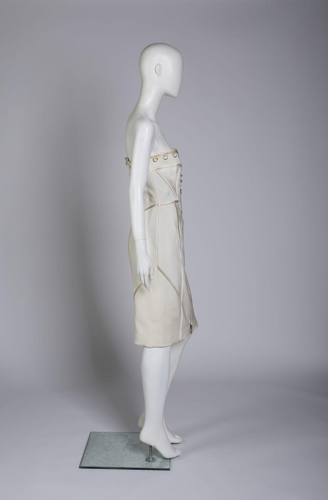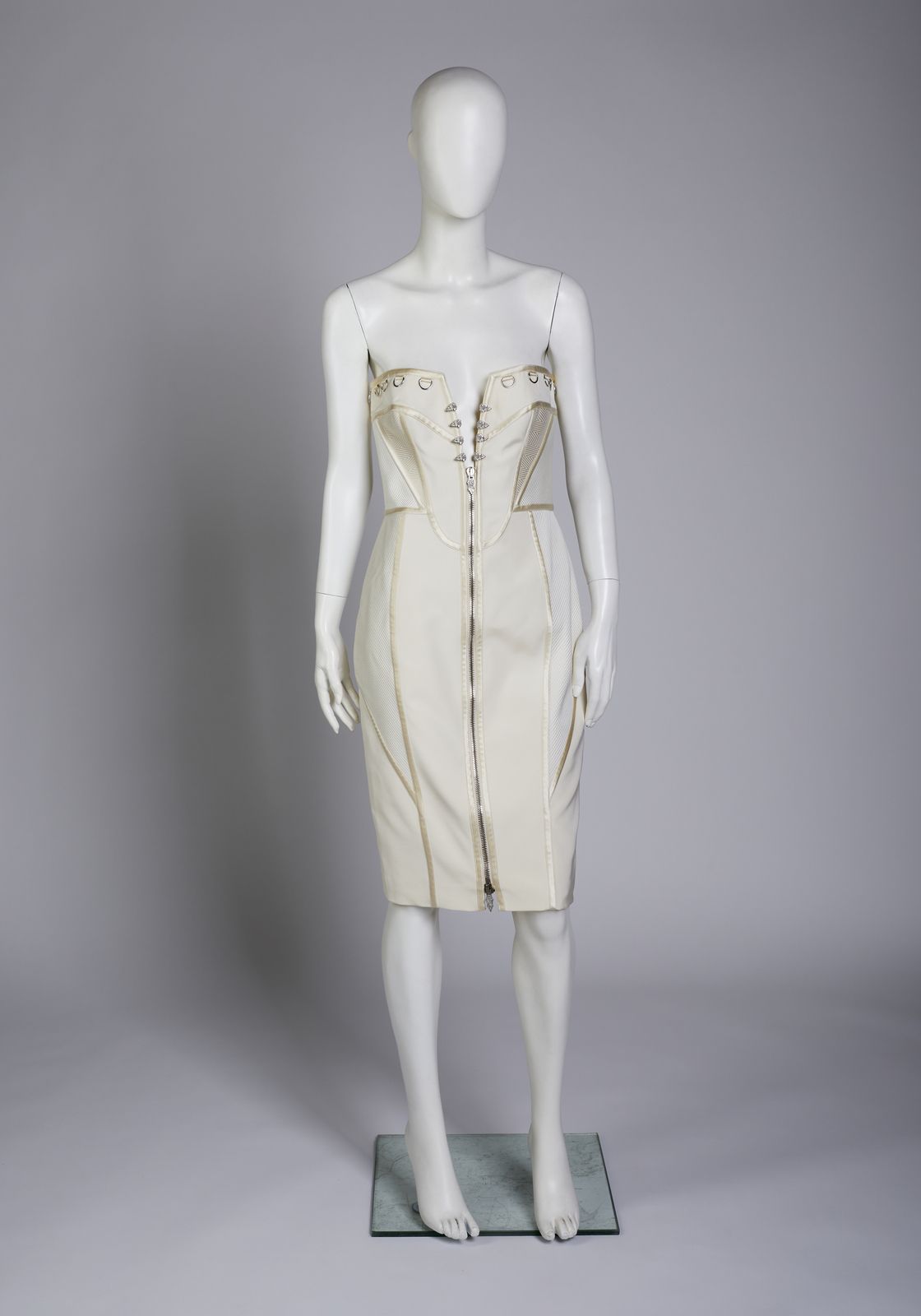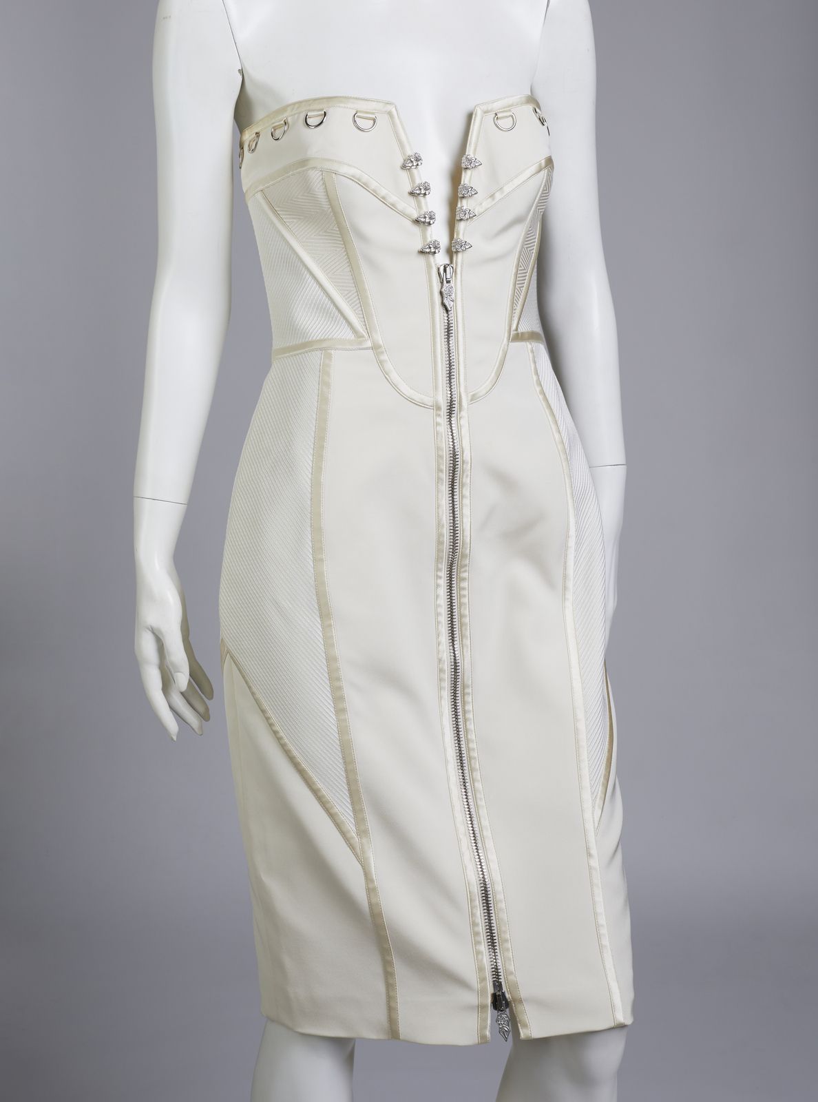 Abito Gianni Versace vintage, modello tubino al ginocchio, senza maniche, in seta e raso, color champagne e bianco puro, impreziosito da dettagli decorativi quali anelli e gancetti a tema floreale in hardware argentato, lacci effetto bustier. Chiusura a zip per l'intera lunghezza dell'abito. Etichetta Versace presente. Taglia IT 42.