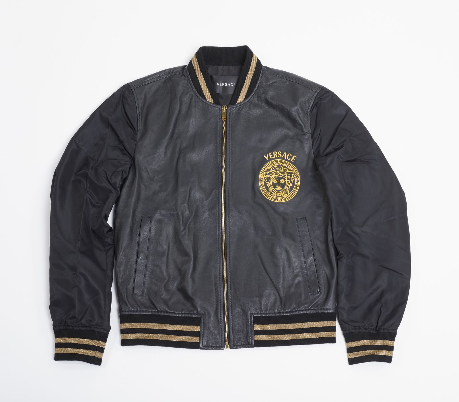 Bomber Versace in pelle (nappa) morbida nera, con maniche in tessuto tecnico nero, collo, polsi e vita bordato di tessuto stretch nero e oro, zip in hardware oro con logo Versace, splendido ricamo a punto pieno giallo oro con Medusa, greca e Versace a sinistra all'altezza del cuore, due taschine interne. Taglia 52 IT, etichetta Versace, etichetta qrcode, etichetta tessile presente.