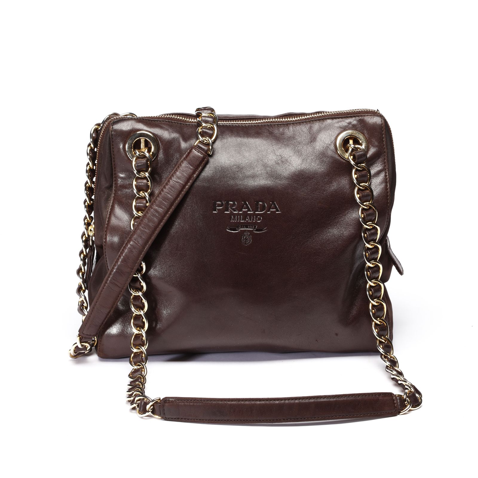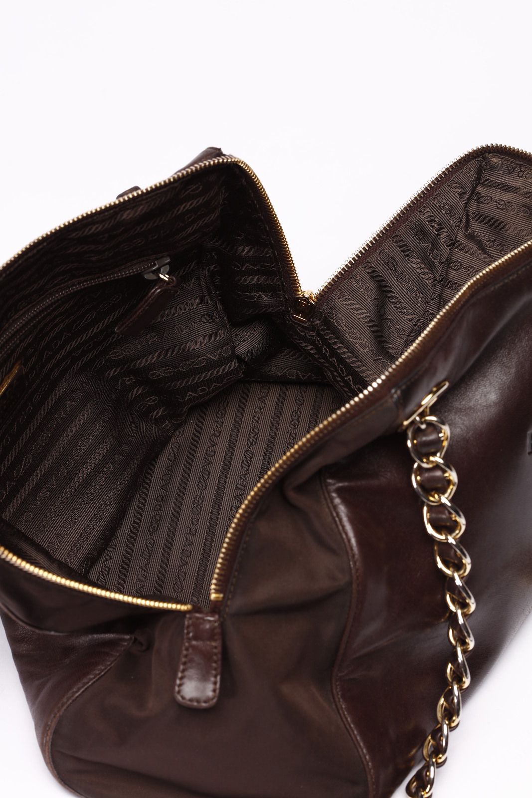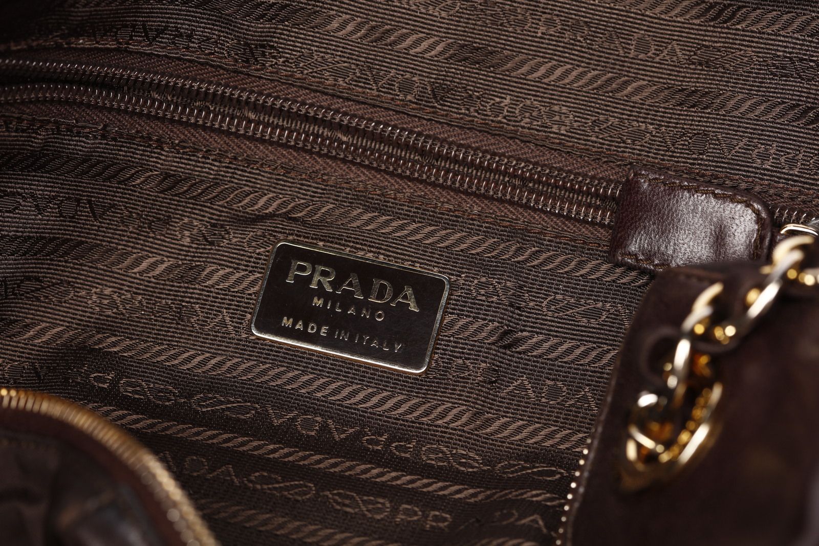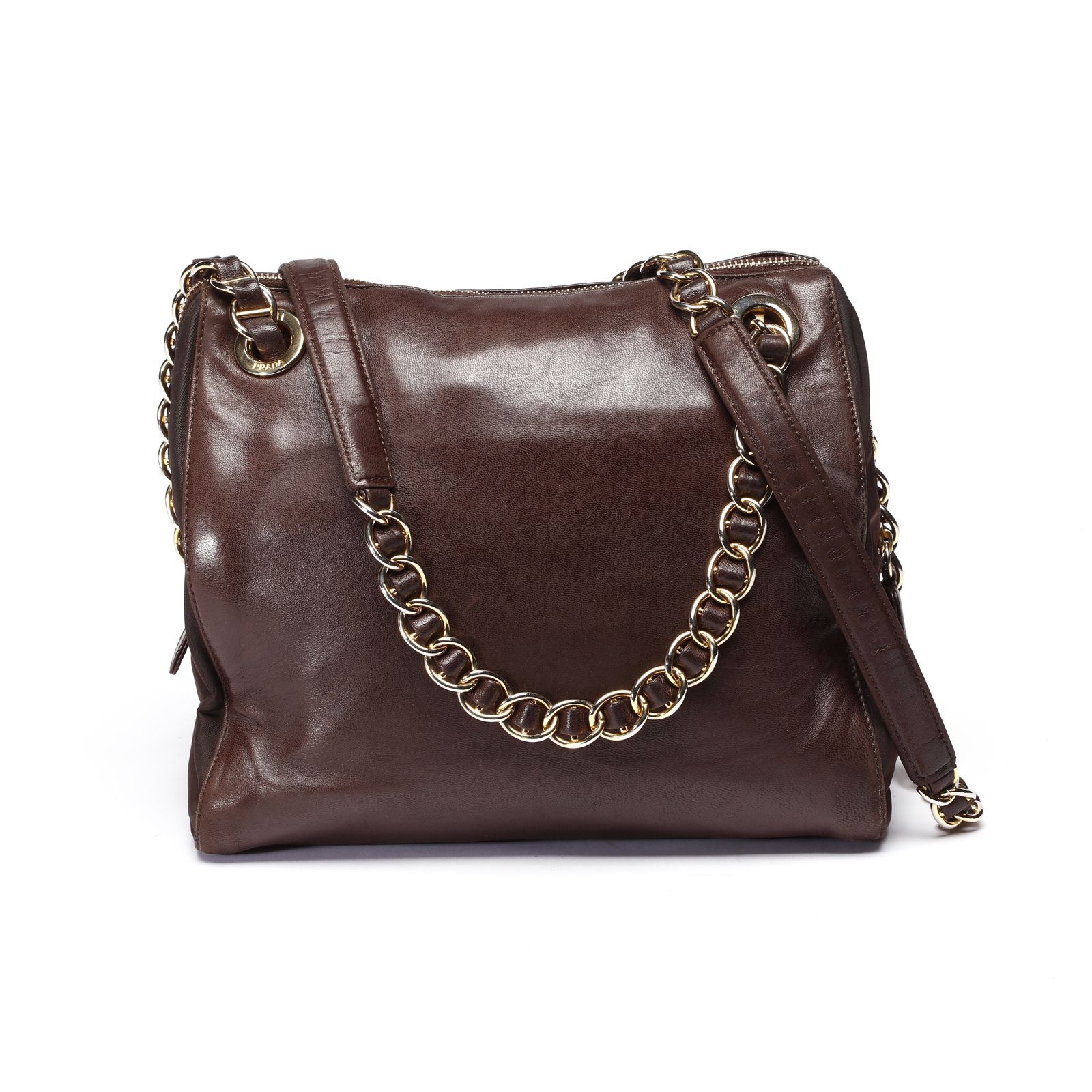 Borsa a spalla in nappa color testa di moro in pelle e tessuto city stesso colore sui fianchi. Tracolla in metallo intrecciato in pelle, hardware dorato. Chiusura a zip, internamente tessuto logo e logo. Tasca con chiusura a zip.Card con codice articolo. Anno 1999. Lievi difetti.