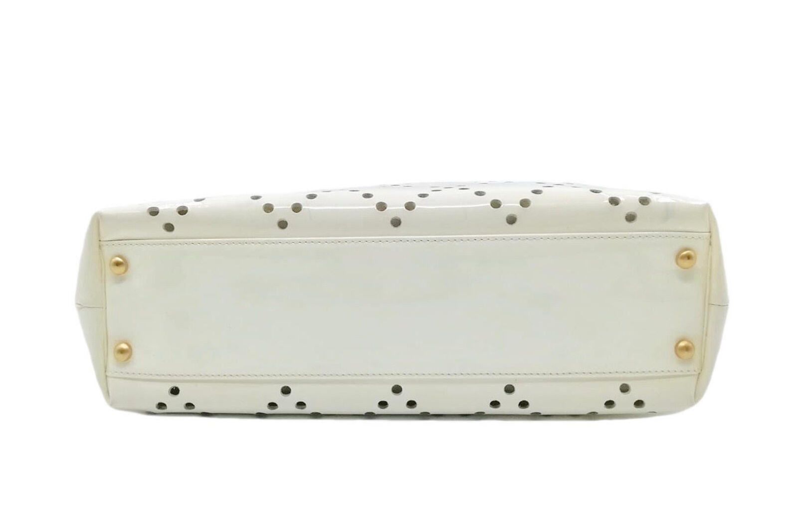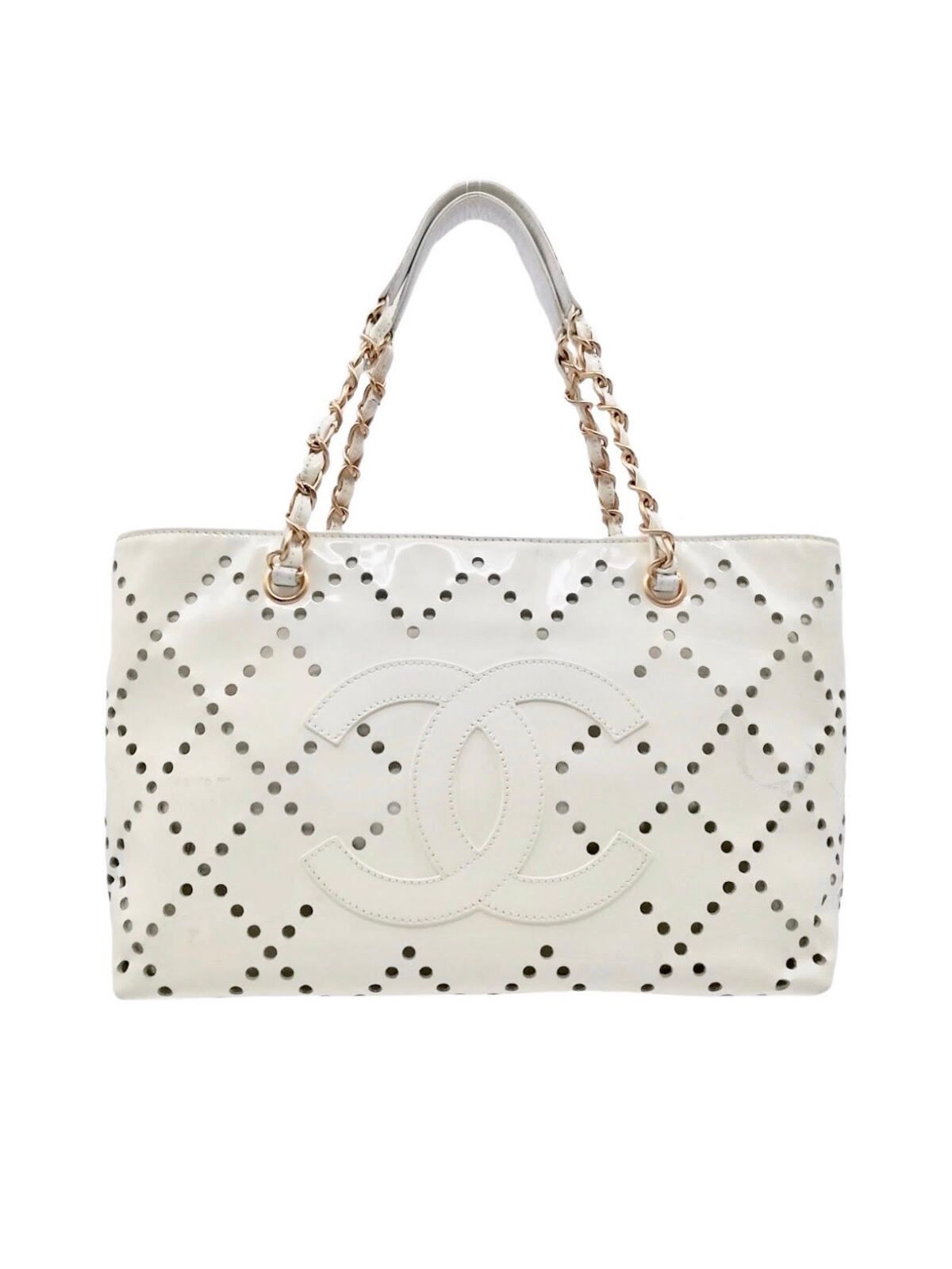 Shopper in pelle lucida bianca. Traforatura che imita la trapuntatura tipica Chanel, chiusura con bottone a pressione, etichetta Chanel Made in Italy all'interno, codice di autenticità 8887075. 2013/2014. Buone condizioni.