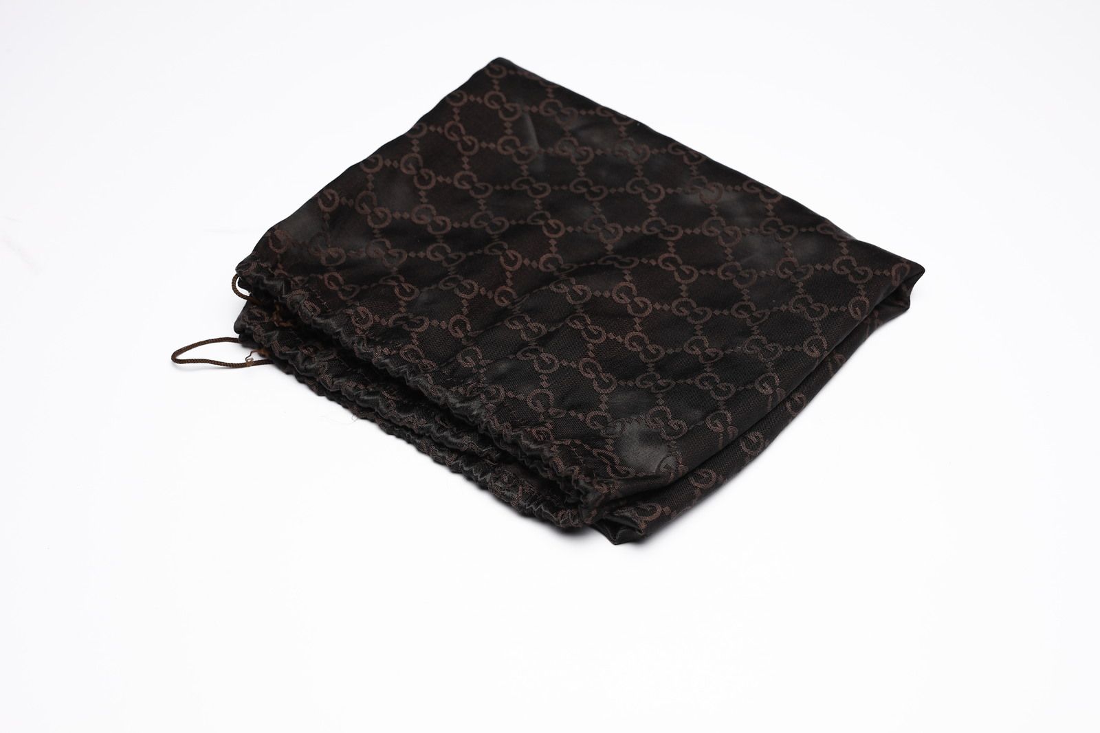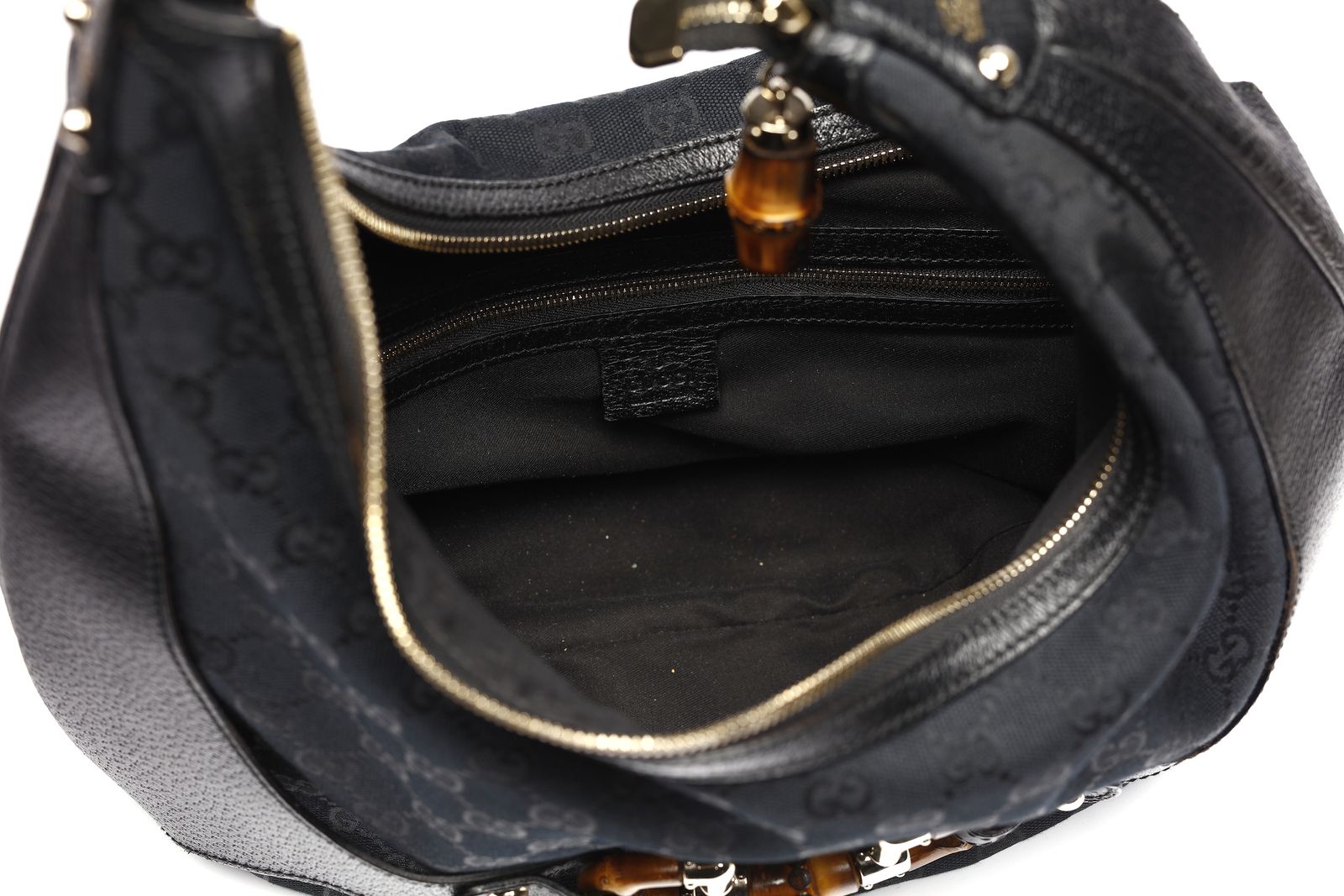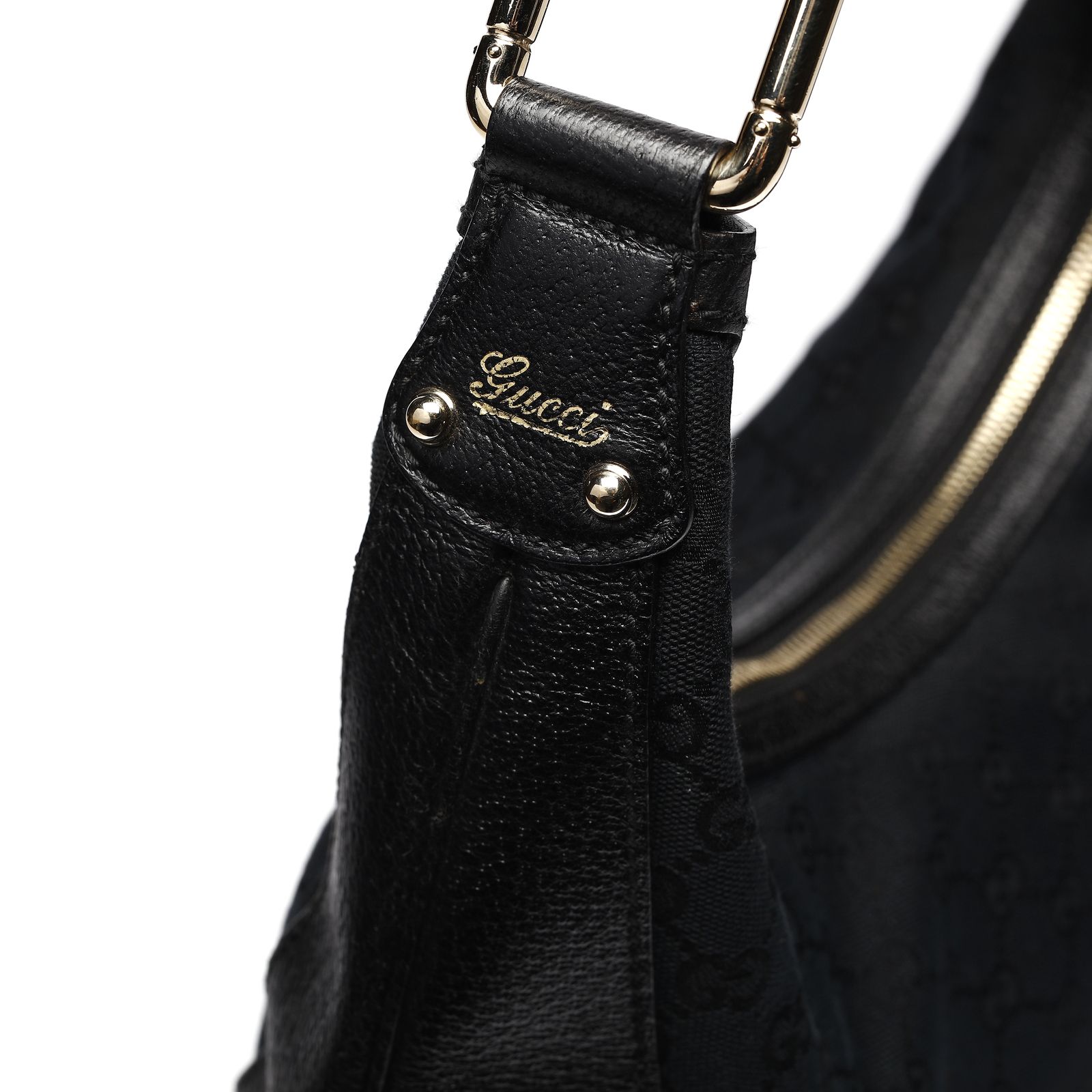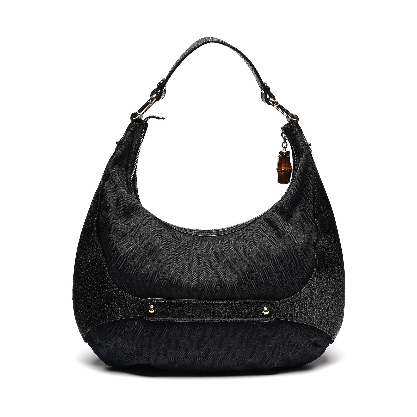 Borsa Gucci vintage, direzione creativa Frida Giannini, realizzata negli anni 2010, modello mezzaluna, tessuto logo GG nero, elementi in pelle martellata nera, dettagli hardware dorati, staffa ed elementi decorativi in bambù. Numero di serie 15246B 2684. Ottime condizioni vintage, completa di dustbag in tessuto logo nero.