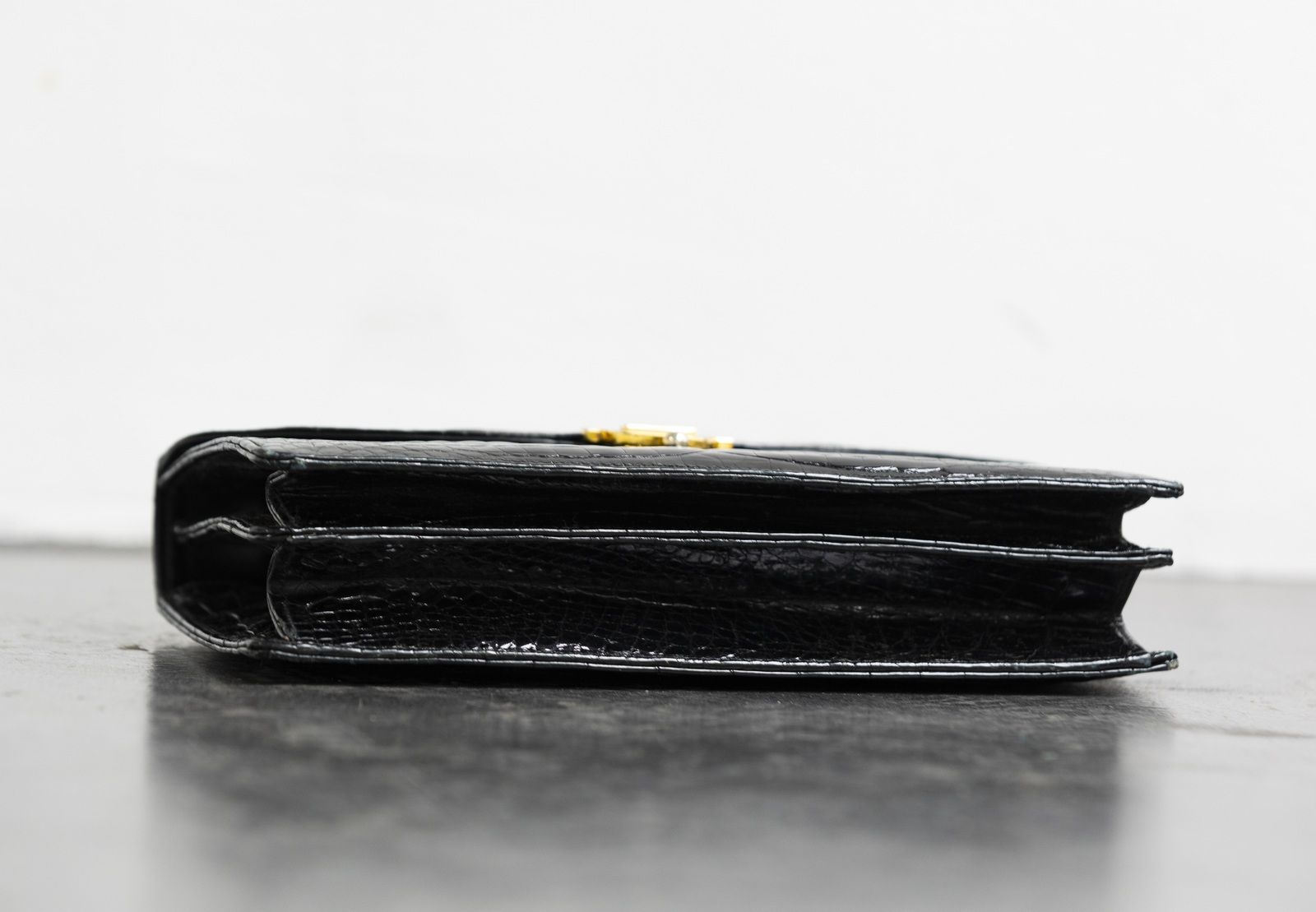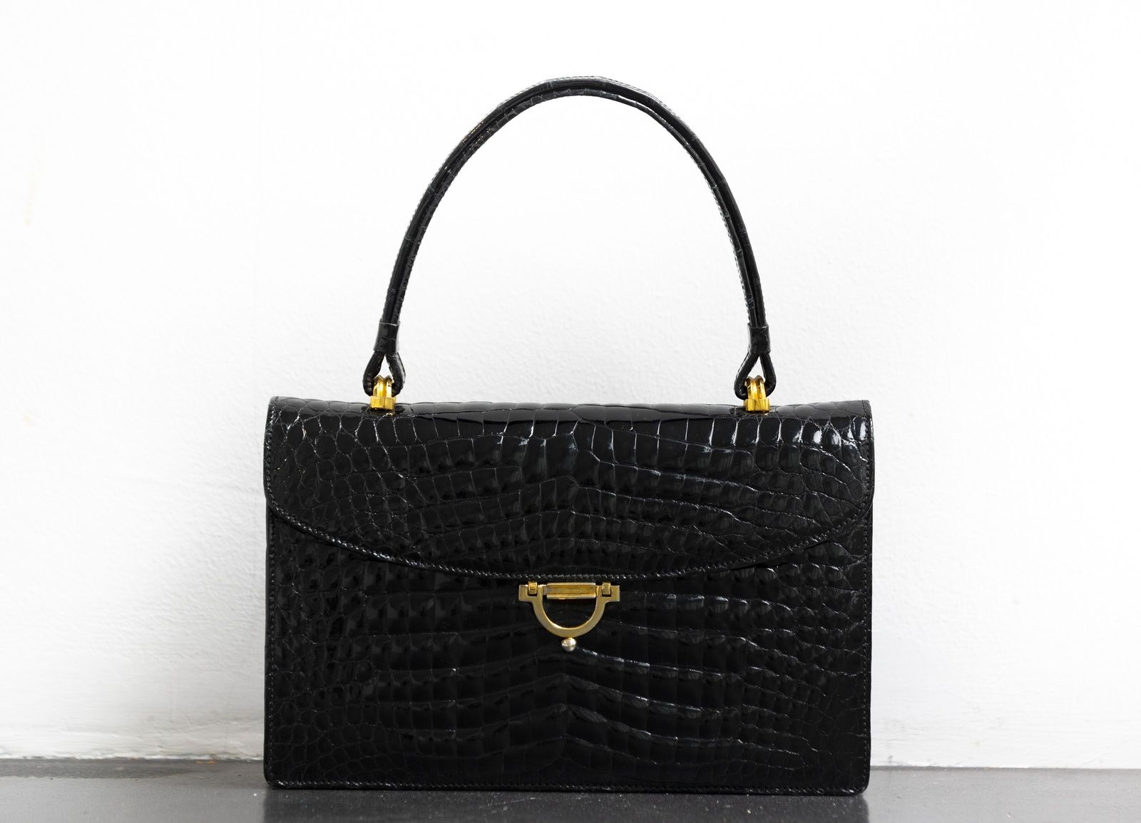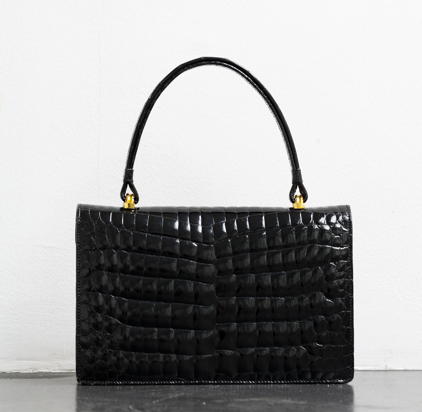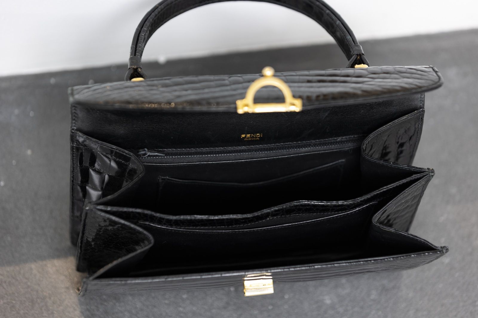 Elegante borsetta a mano Fendi vintage, modello rigido, in pelle stampa cocco nero lucida, manico rigido, firma Fendi stampata all'interno. Presente custodia originale.