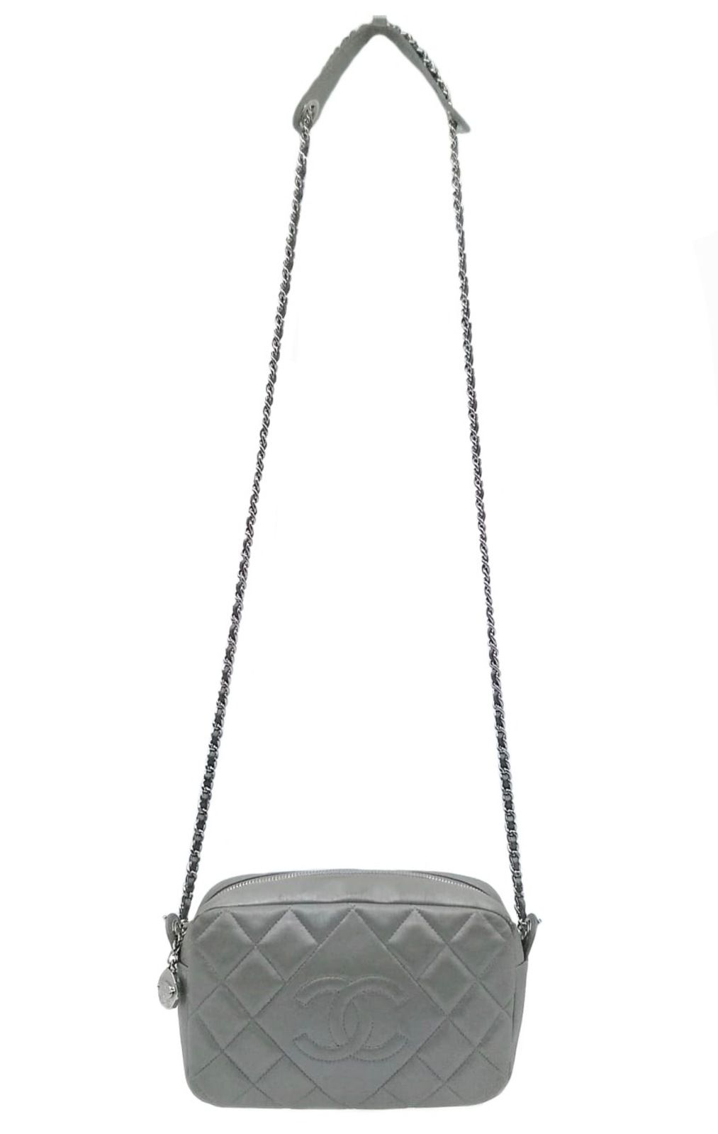 Camera Bag in pelle di agnello argentata. Made in Italy, 2014. In caratteristica pelle trapuntata, logo CC sul fronte, manico in catena e pelle intrecciata, zip con estremità logo, codice all'interno 19470476.