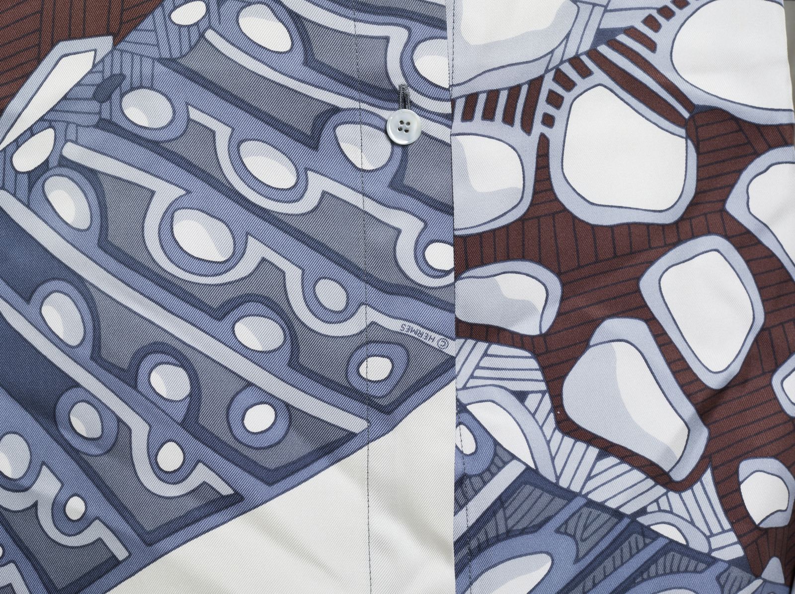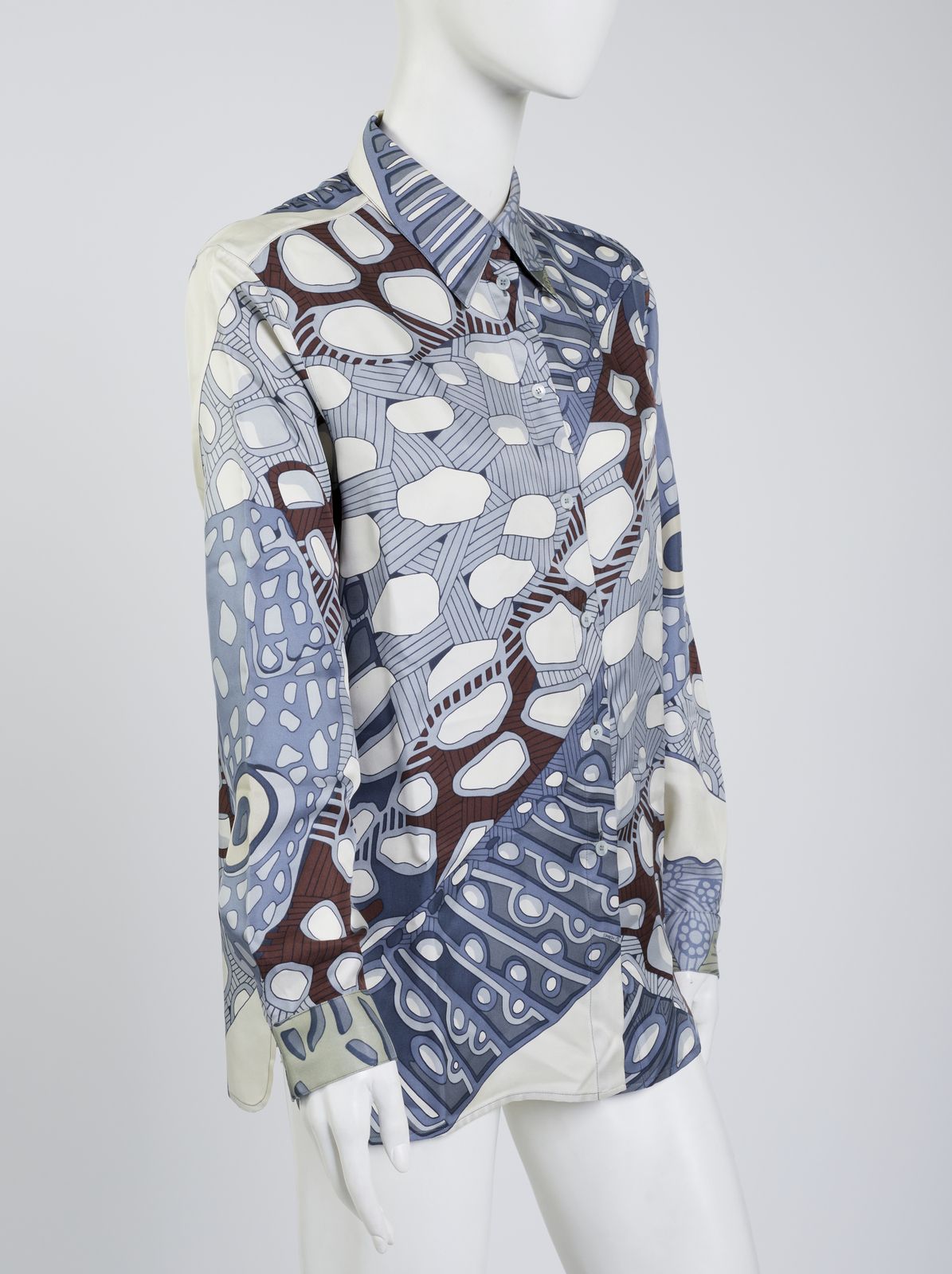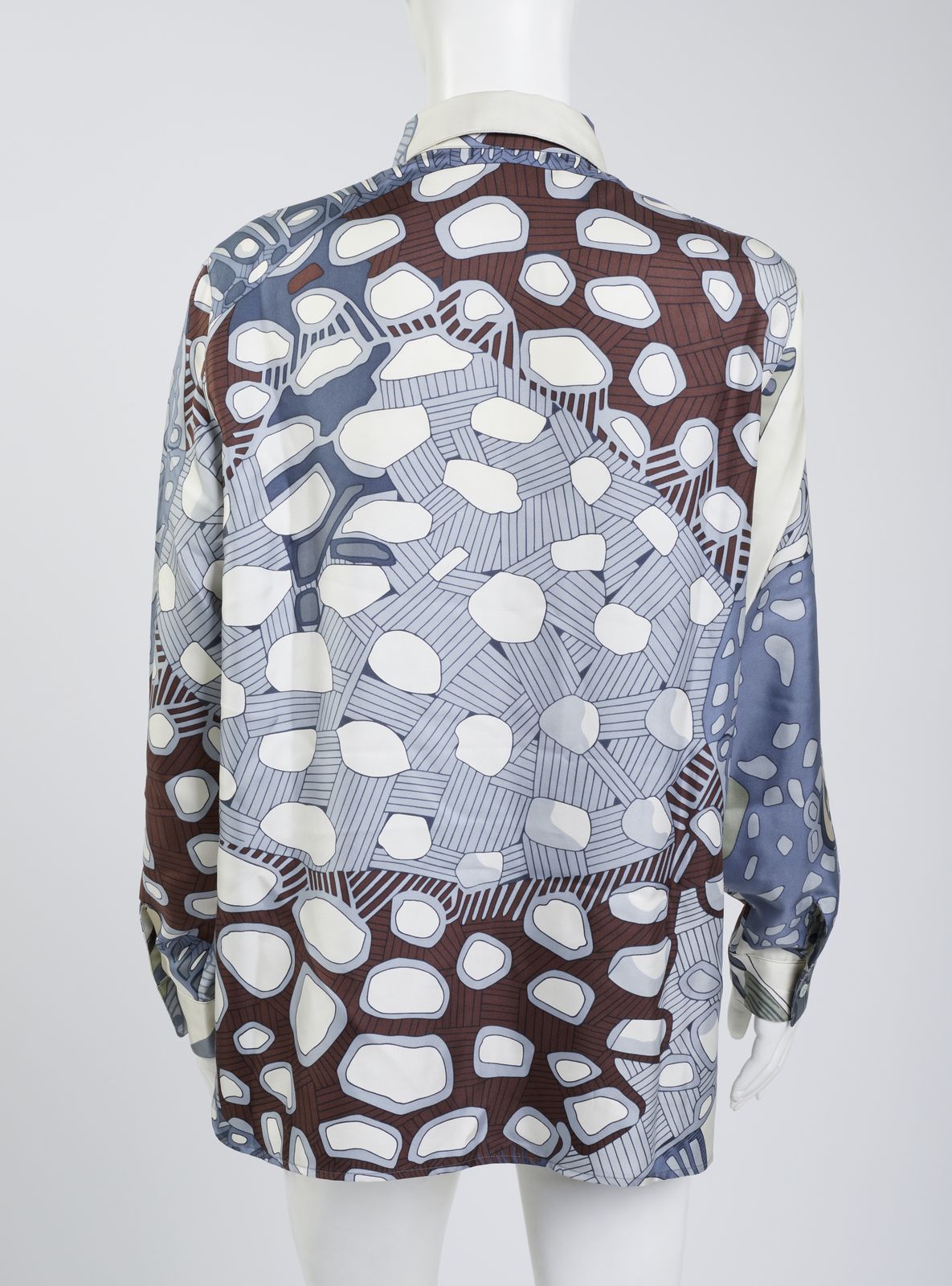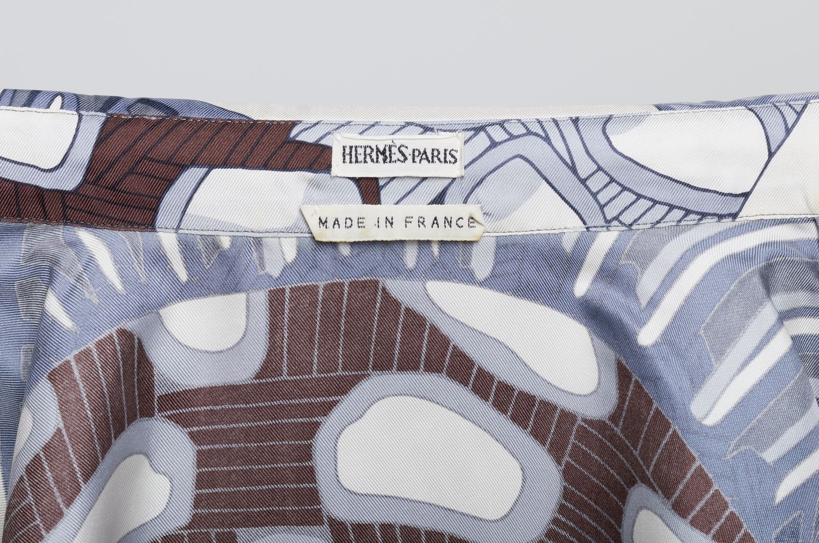 Camicia Hermès a maniche lunghe stampata con motivo astratto, nei toni del grigio, azzurro, marrone, bianco. Etichetta Hermès-Paris. Etichetta tessile 80% polyamide 20% lycra. Taglia 40 FR, IT 44.