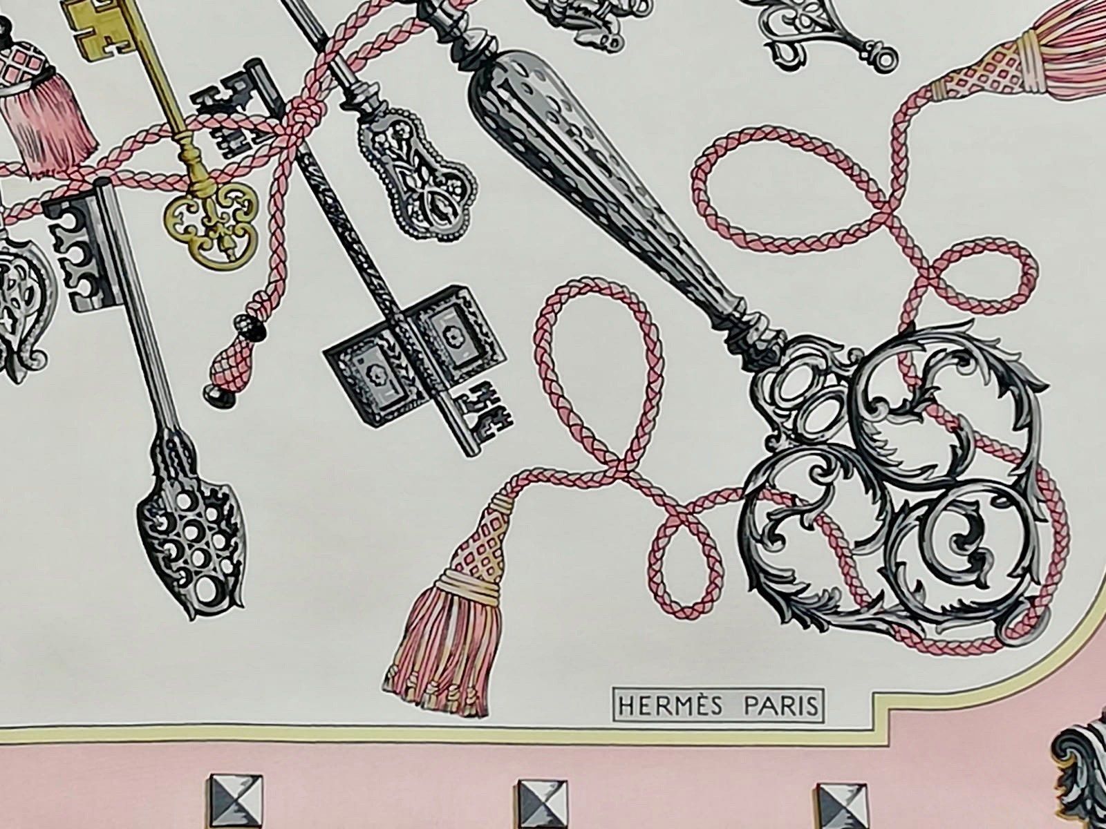 Foulard in seta 100%. Vintage, nei colori bianco/rosa/nero. Progettato da Cathy Lathman nel 1965. Ottime condizioni, due lievi segni come da fotografia. Firmato. Copyright, Orlo arrotolato a mano. Made in France.