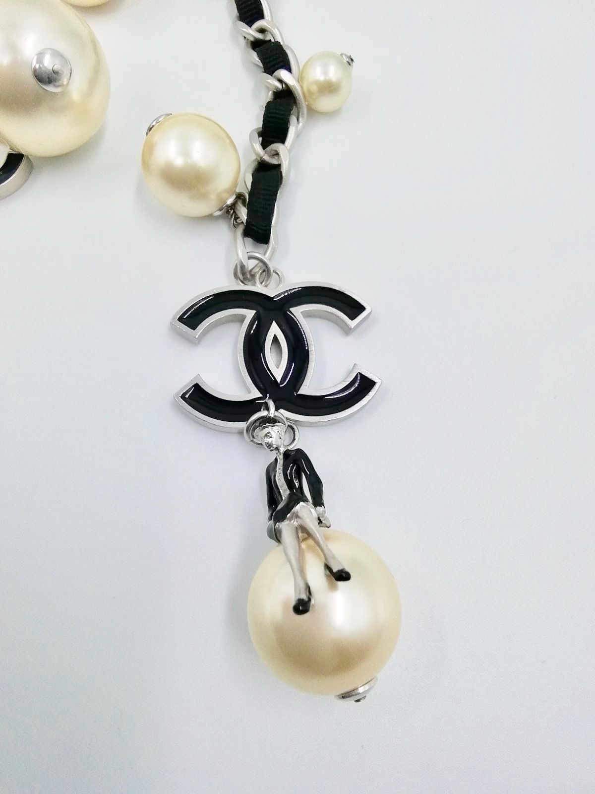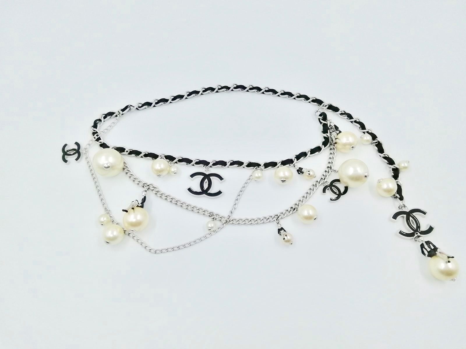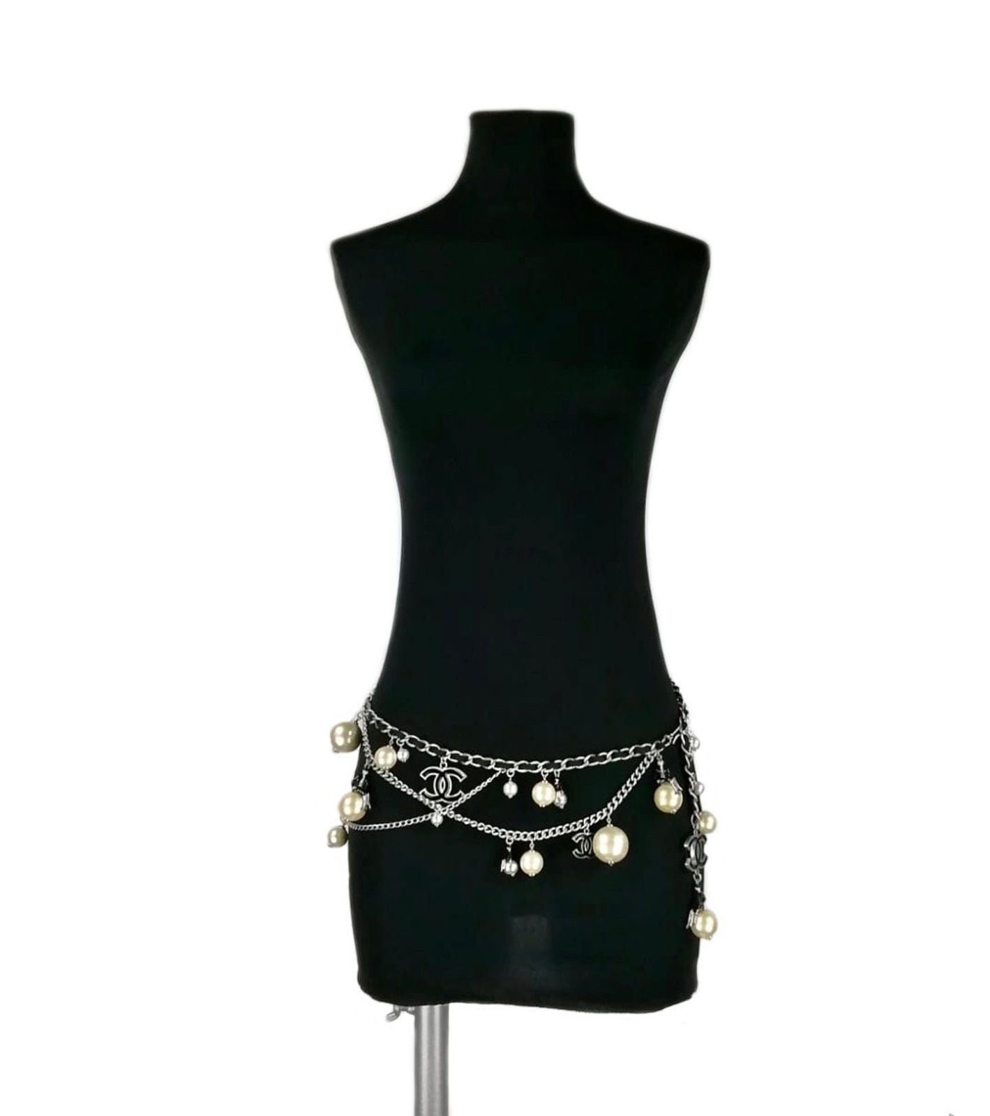 Cintura con catene, perle, perle con silhouette. Collezione Autunno/Inverno 2004. Lunghezza cm 84 + ciondolo cm 9. Condizioni eccellenti.