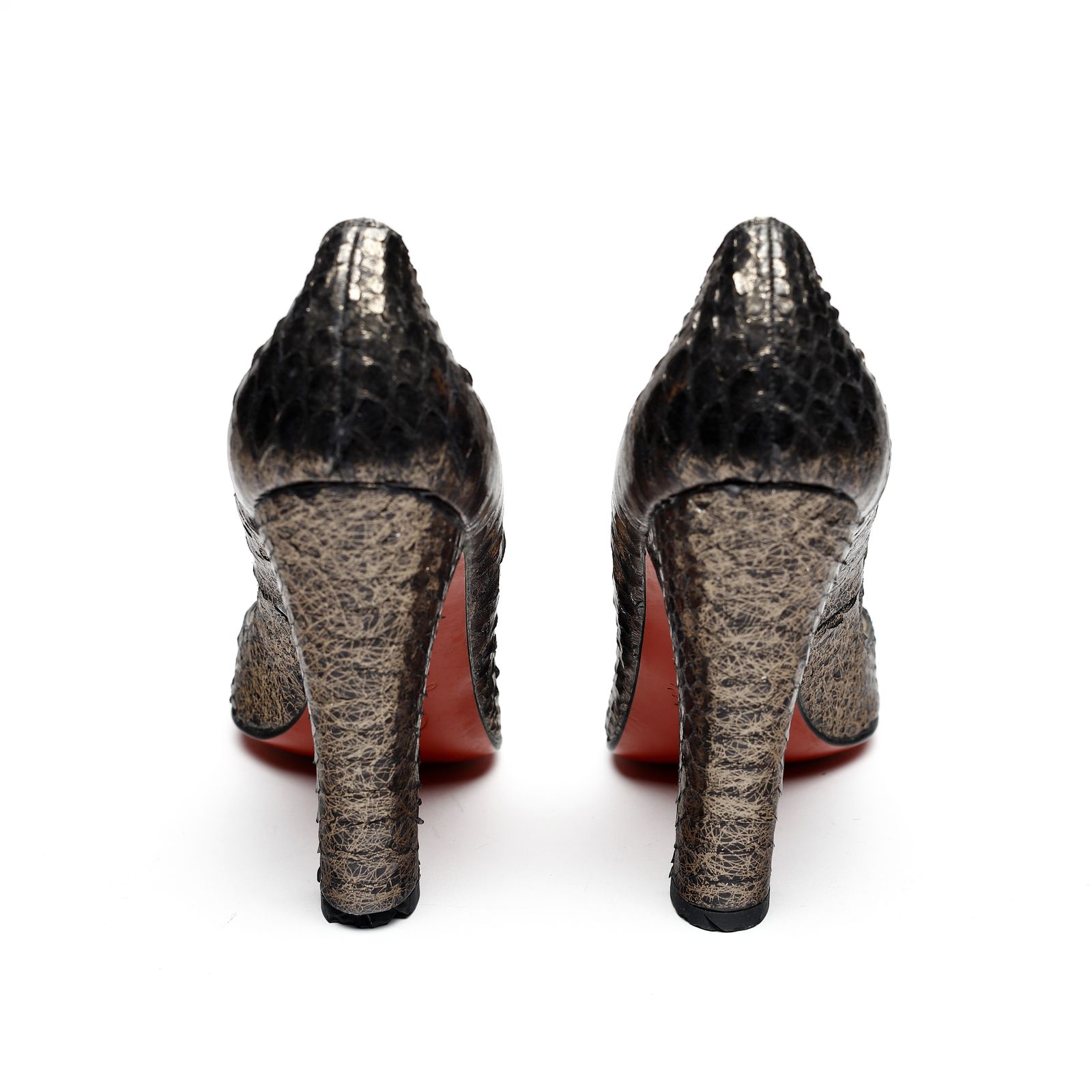 Tacco 12 cm. IT 37. Logo all'interno, caratteristica suola rosso ciliegia. Perfette condizioni, In pelle stampa effetto pitone in marrone scuro lievemente iridiscente.