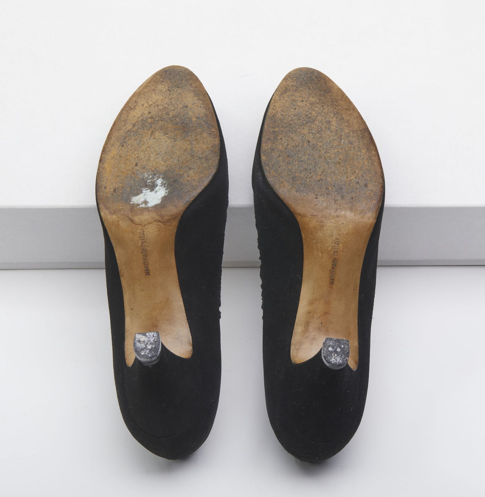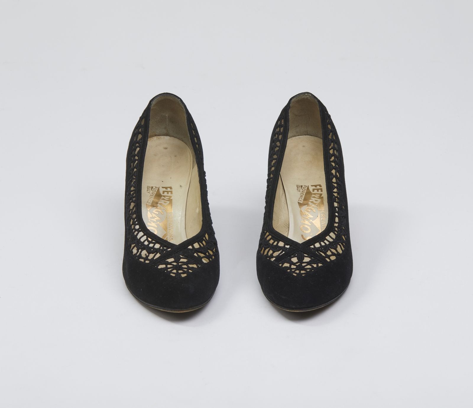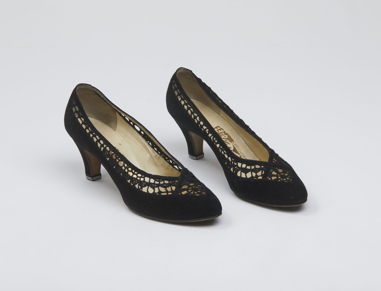Tacco 6.7 cm. In velluto nero e traforature in pizzo macramé nero. Taglia circa 37. 1960 circa. Eccellenti condizioni, valore museale, da archivio.