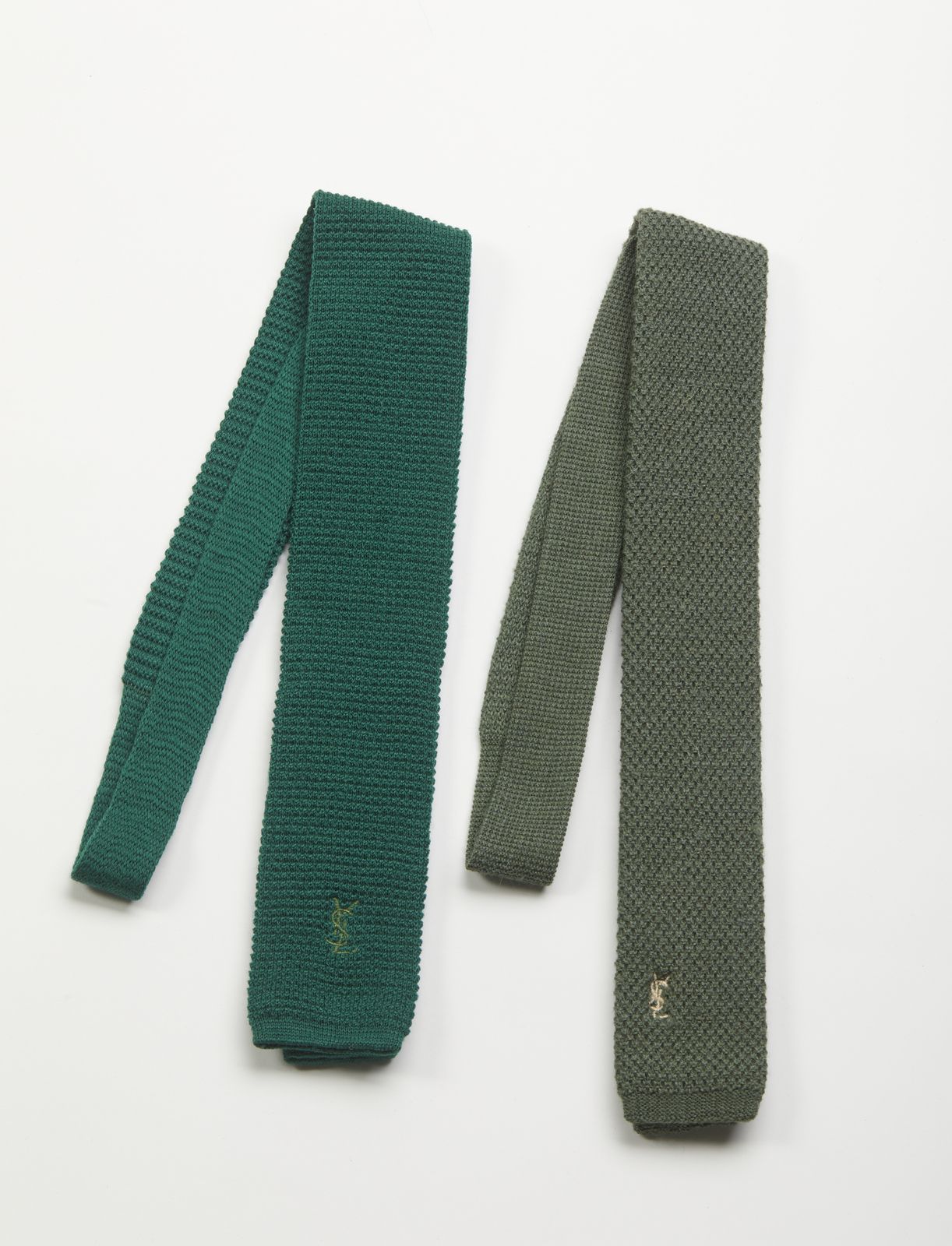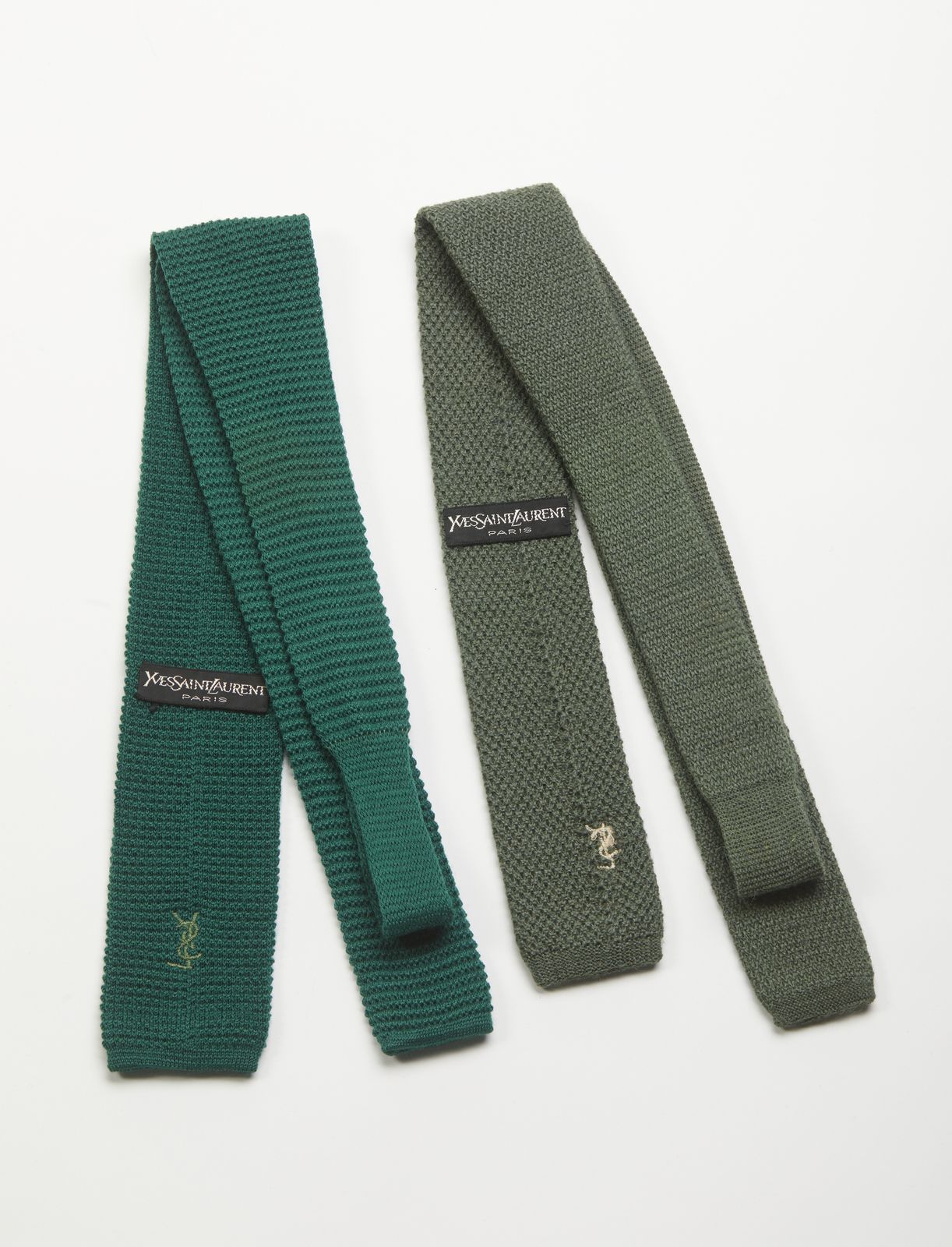 Una cravatta in maglia operataverde salvia, lunghezza piegata a metà 64 cm, larghezza 5 cm, etichetta tessile 30% alpaca, 70% lana, logo YSL ricamato ton sur ton. una cravatta in maglia operata verde smeraldo, lunghezza piegata a metà 65 cm, larghezza 6 cm, logo YSL ricamato ton sur ton.