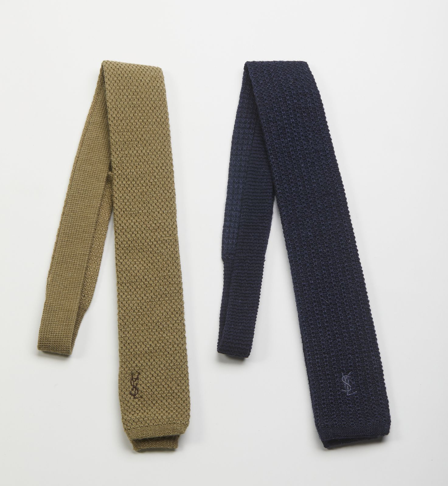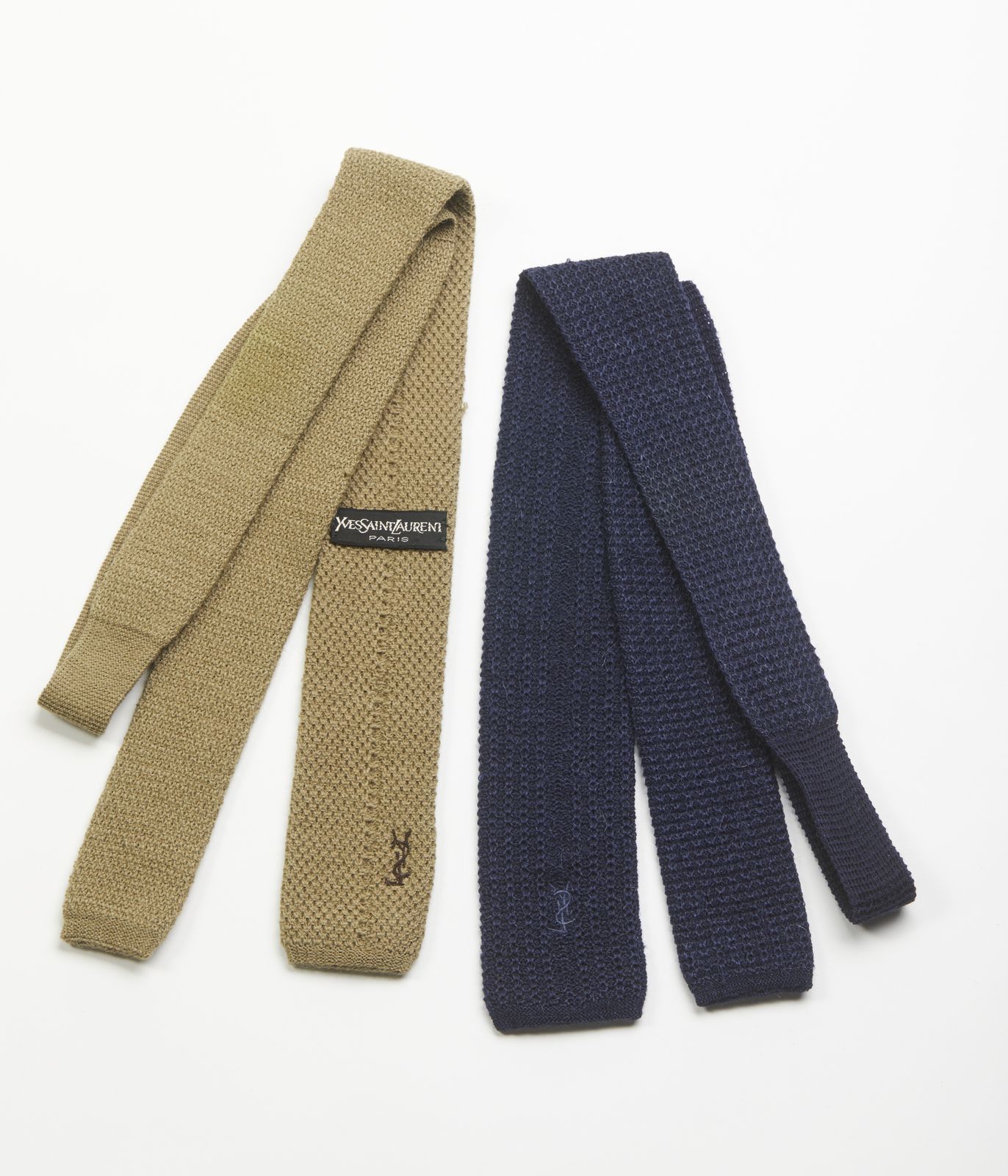 Una cravatta in maglia operata ecrù, lunghezza piegata a metà 64 cm, larghezza 5,5 cm, etichetta tessile 30% alpaca, 70% lana, logo YSL ricamato ton sur ton. una cravatta in maglia operata blu navy, lunghezza piegata a metà 64 cm, larghezza 6 cm, logo YSL ricamato ton sur ton.