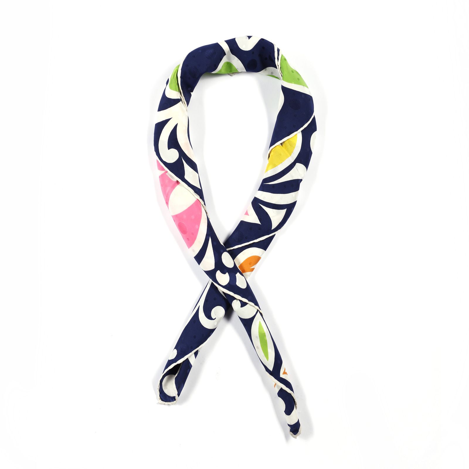 Foulard blu, decoro floreale multicolore.