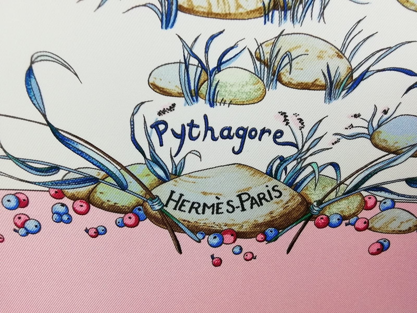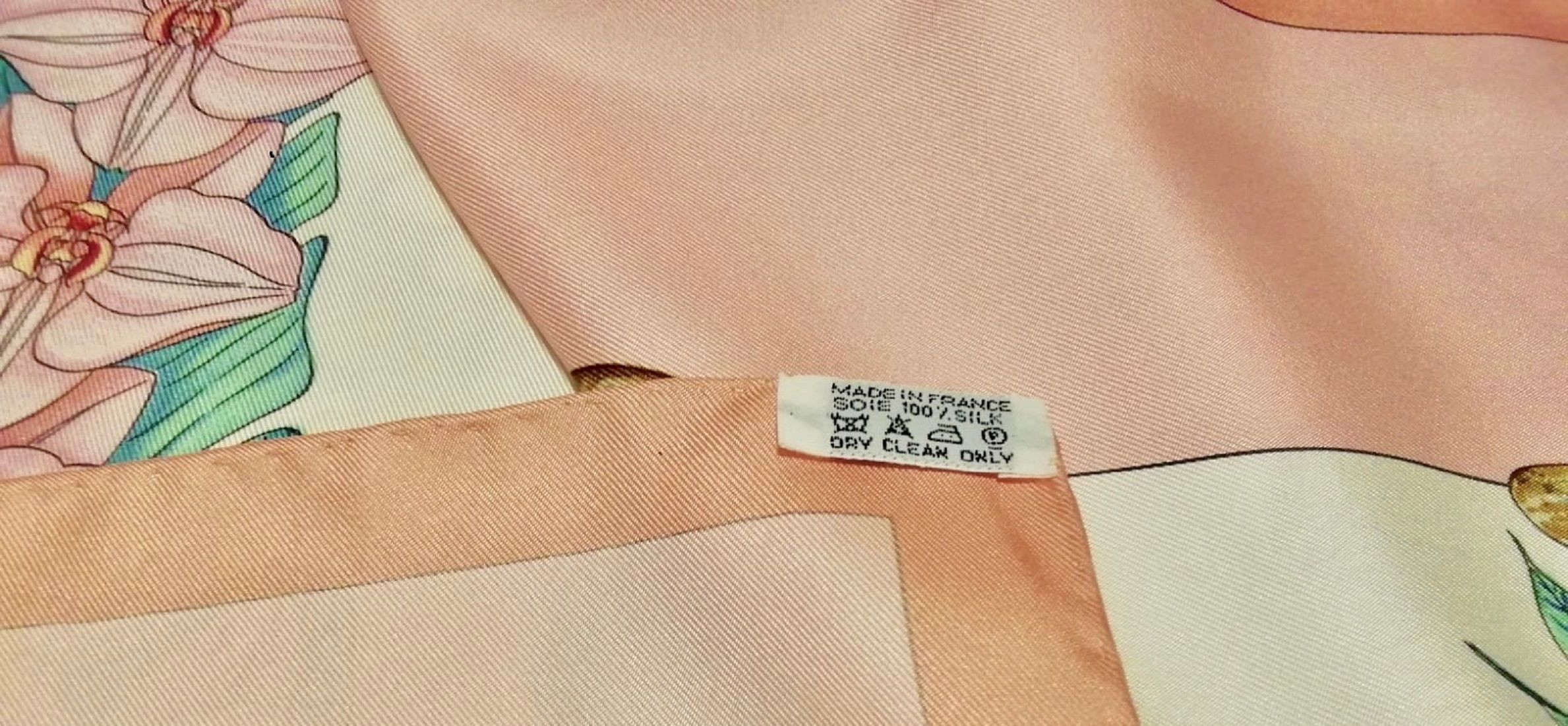 Foulard carré in seta 100% nei colori del rosa, bianco, multicolor. Disegnato da Zoe Pauwels nel 1999. Firmato Etichetta. Copyright. Made in France. Orlo arrotolato a mano. Condizioni eccellenti.