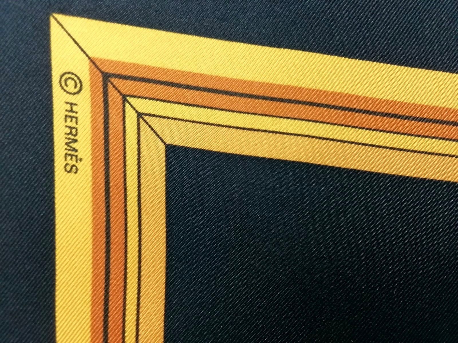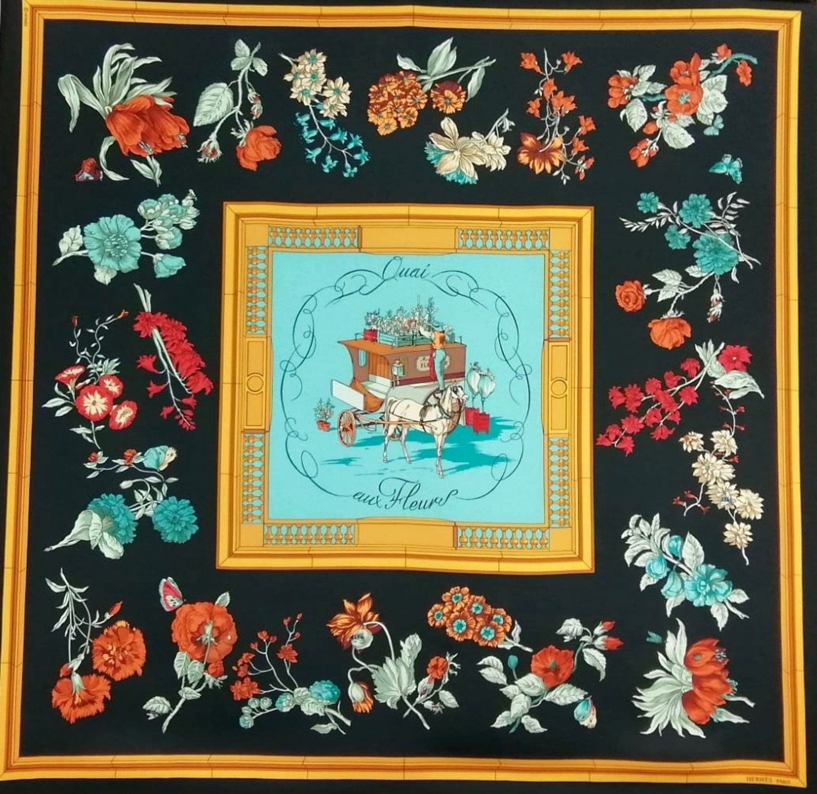Foulard carré in seta 100% nei colori del nero, oro, turchese, multicolor.Vintage. Disegnato da Hugo Grygkar nel 1952. Firmato, Etichetta, Copyright. Made in France. Orlo arrotolato a mano. Condizioni eccellenti.