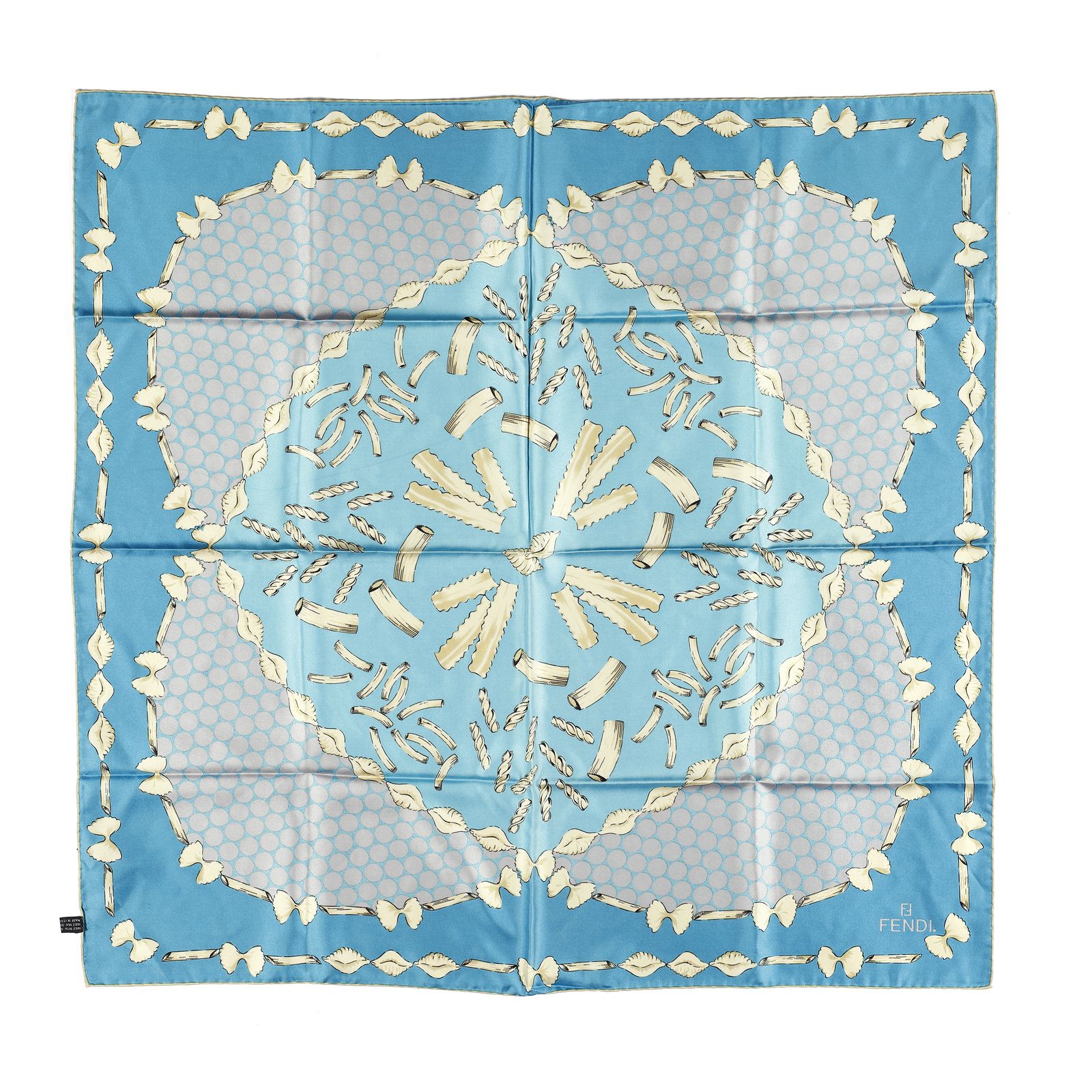 Foulard in seta fantasia 'La Pasta' su fondo azzurro.