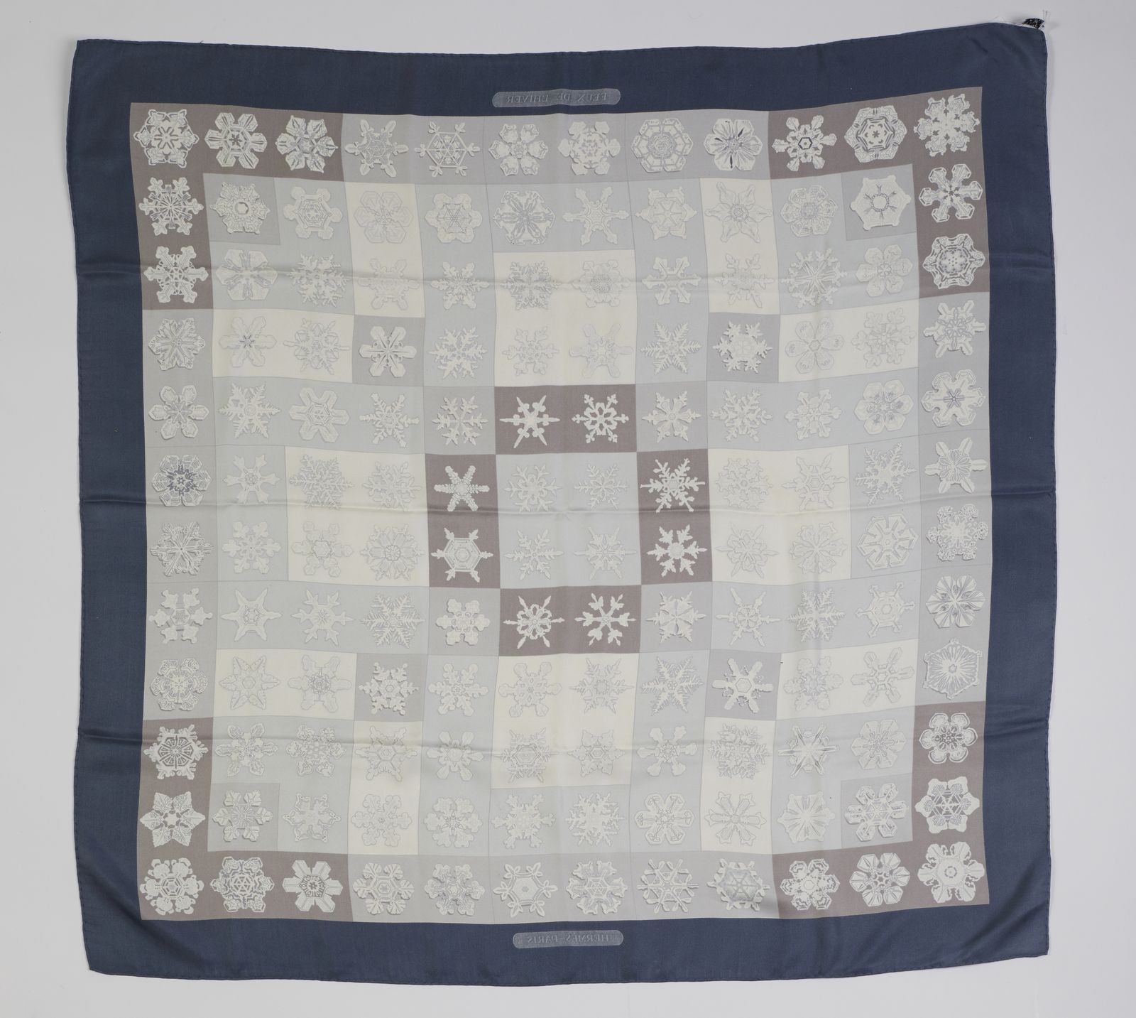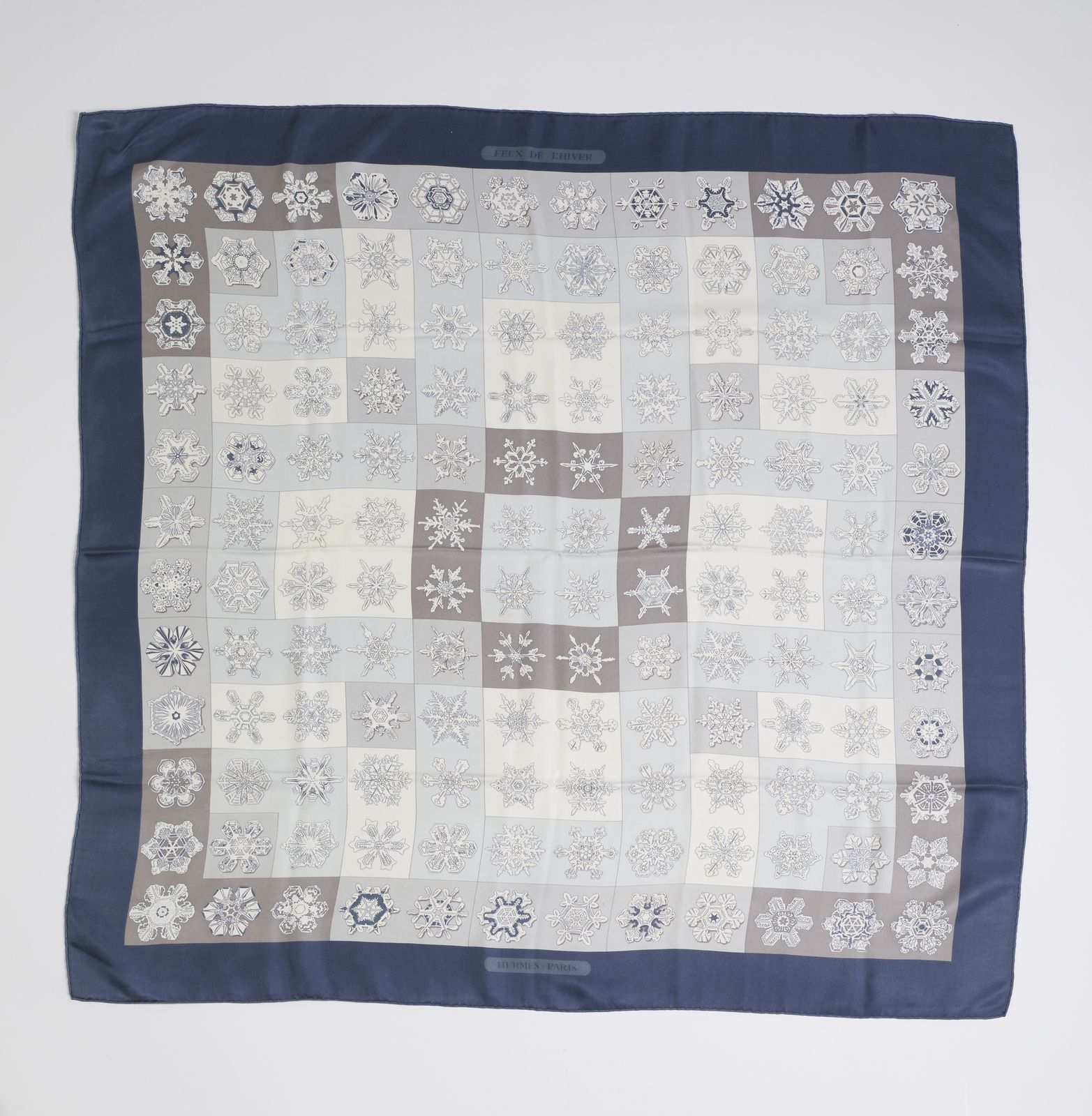 Foulard Hermès in seta stampata con fantasia nei toni del grigio, bianco, tortora e bordo blu scuro'Feux de l'Hiver', disegnata da Christiane Vauzelles nel 1981.