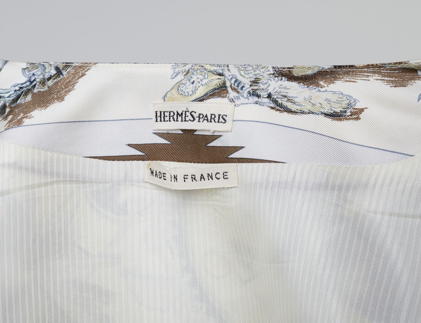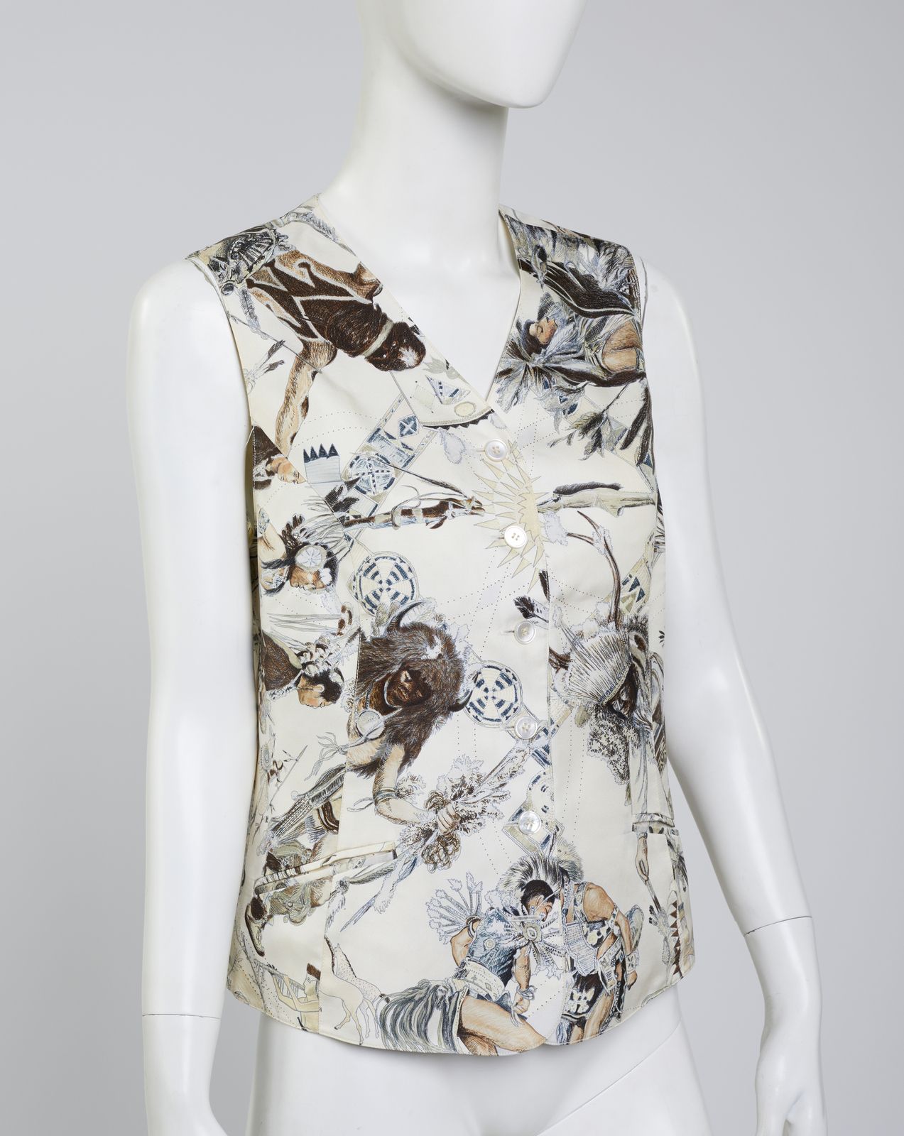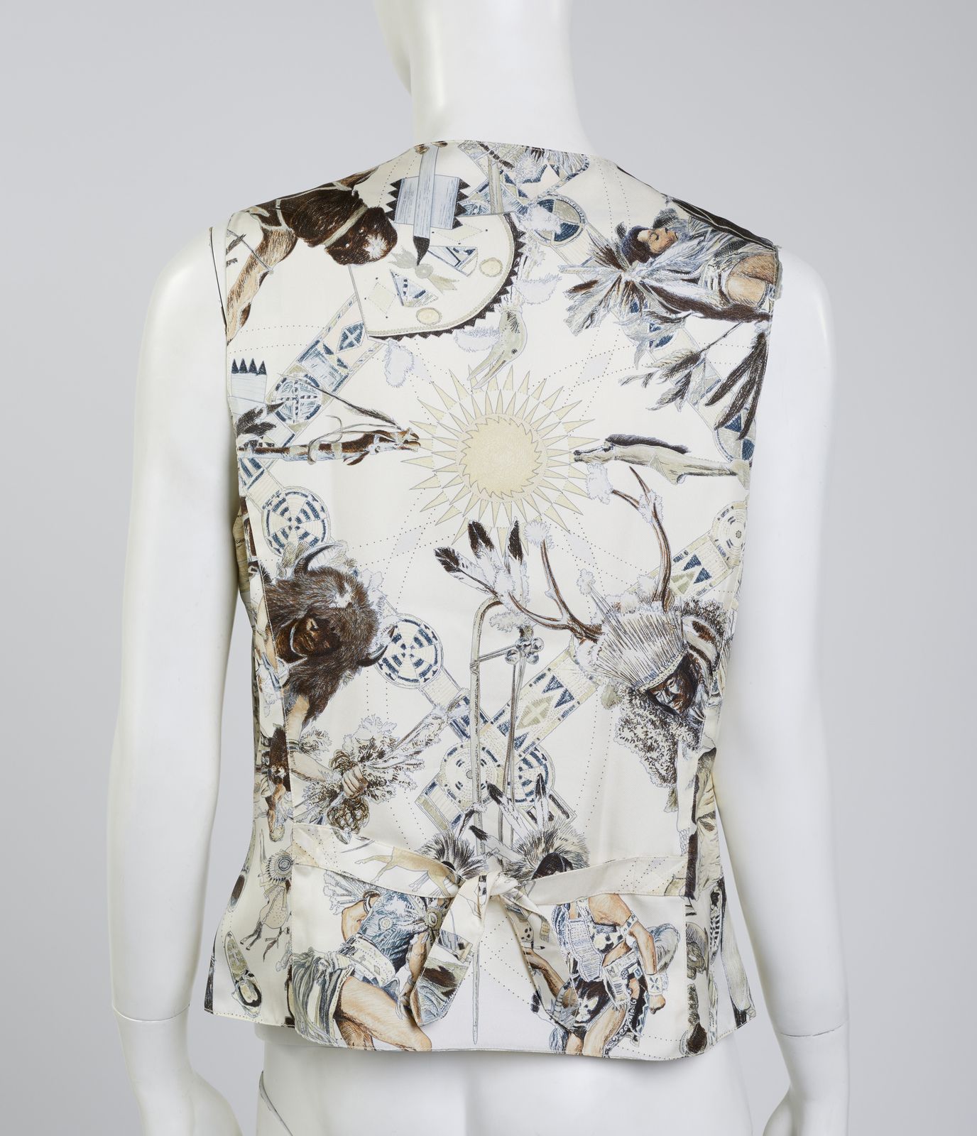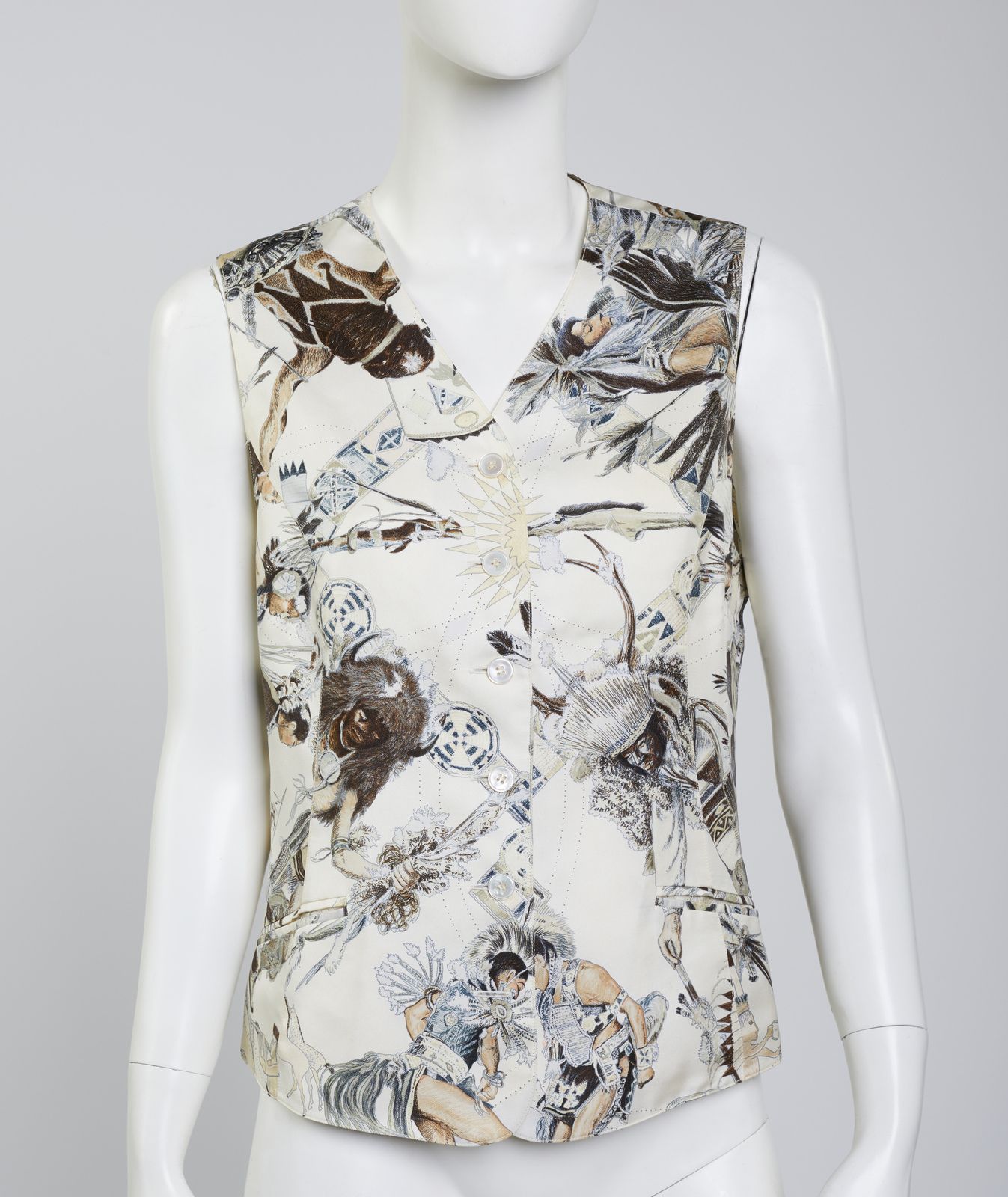 Gilet Hermès in 100% seta, made in France, stampata con motivo'Les Danses des Indiens', realizzato da Kermit Oliver dal 1999, nei toni prevalenti del bianco, beige, grigio e nero. Spalla 34 cm , vita 44 cm.