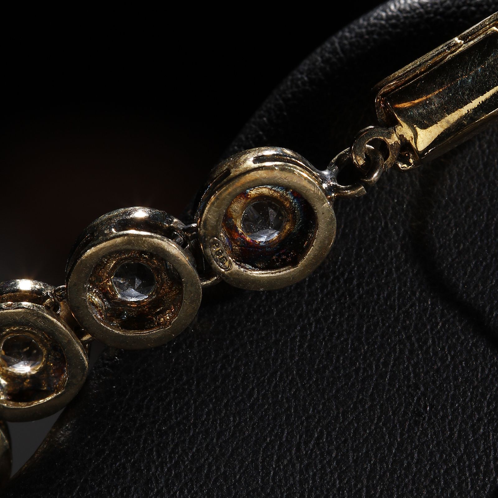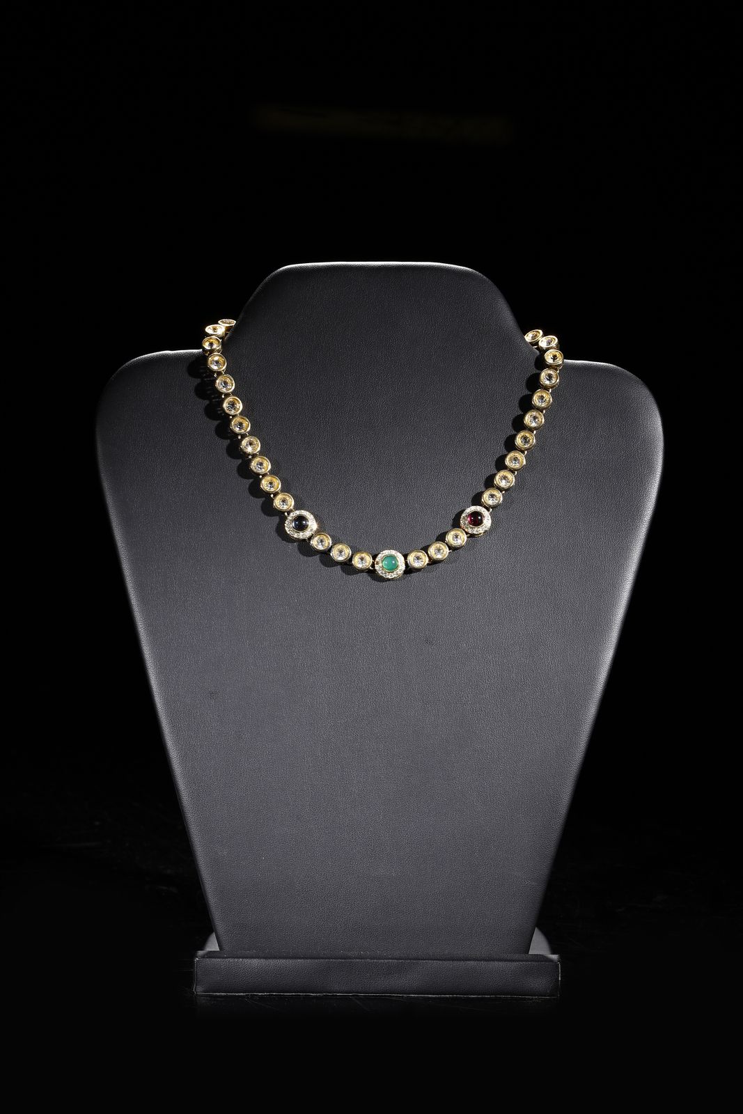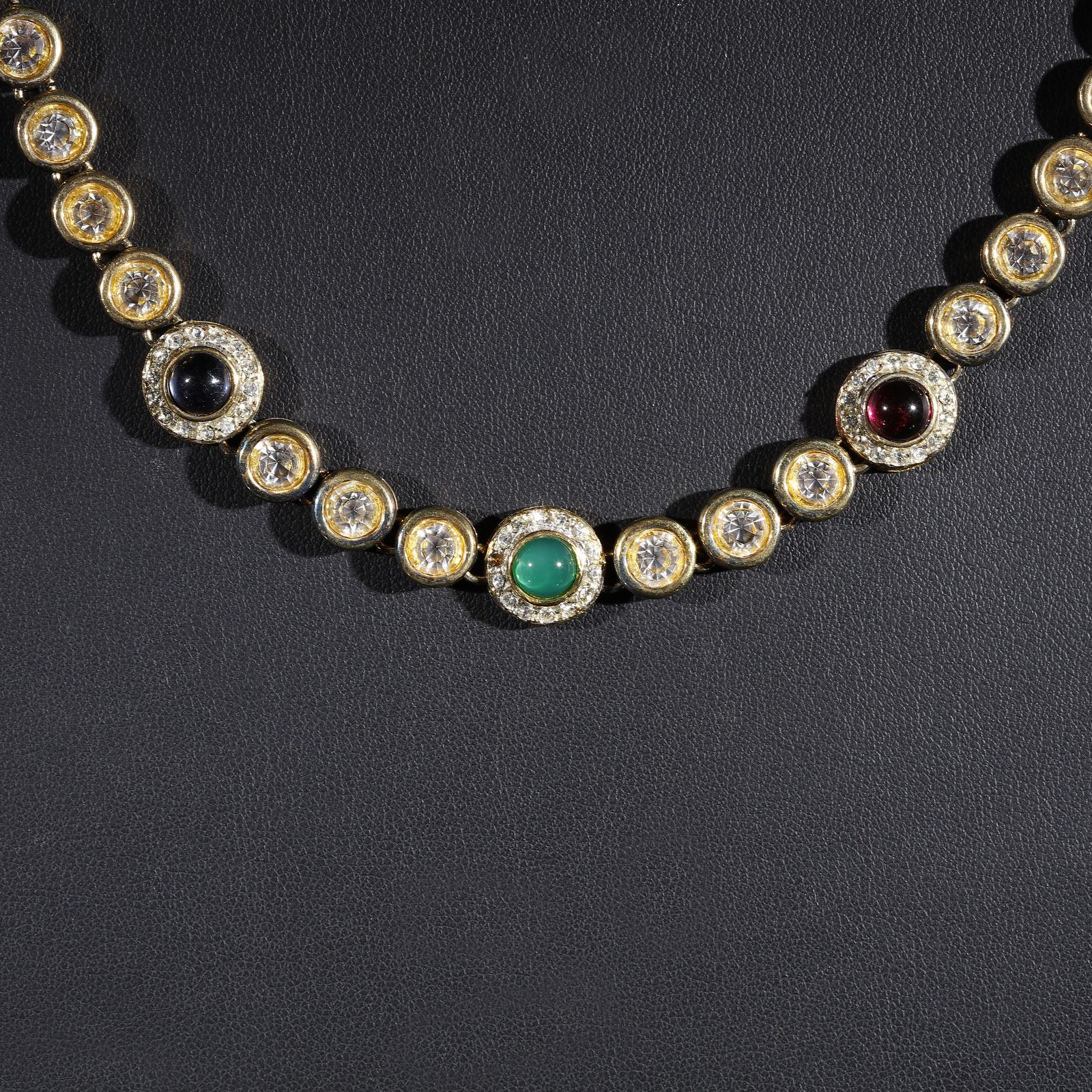 Girocollo modello tennis con strass a montatura 'cipollina', strass colorati cabochon effetto zaffiro, smeraldo, rubino. Metallo dorato della montatura, etichetta presente.