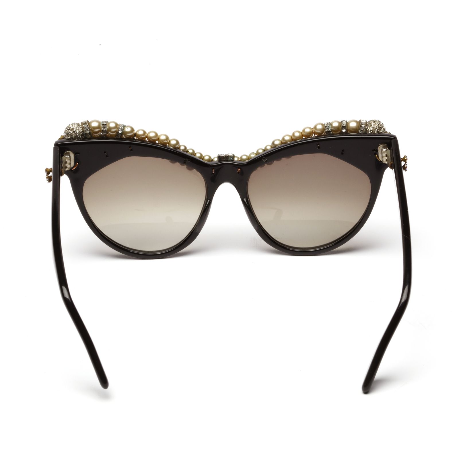 Importanti occhiali da sole, montatura nera, con decoro di perle e strass.