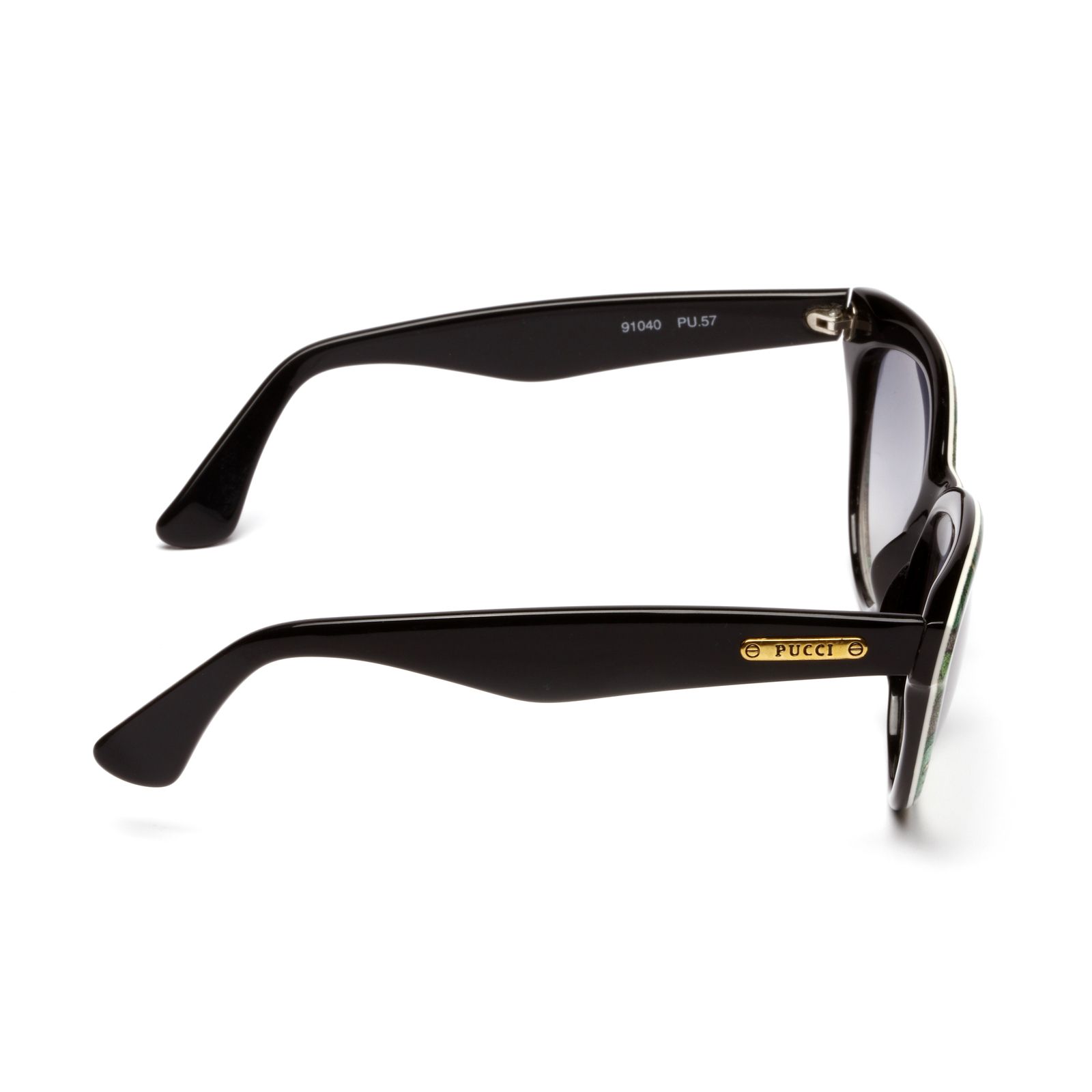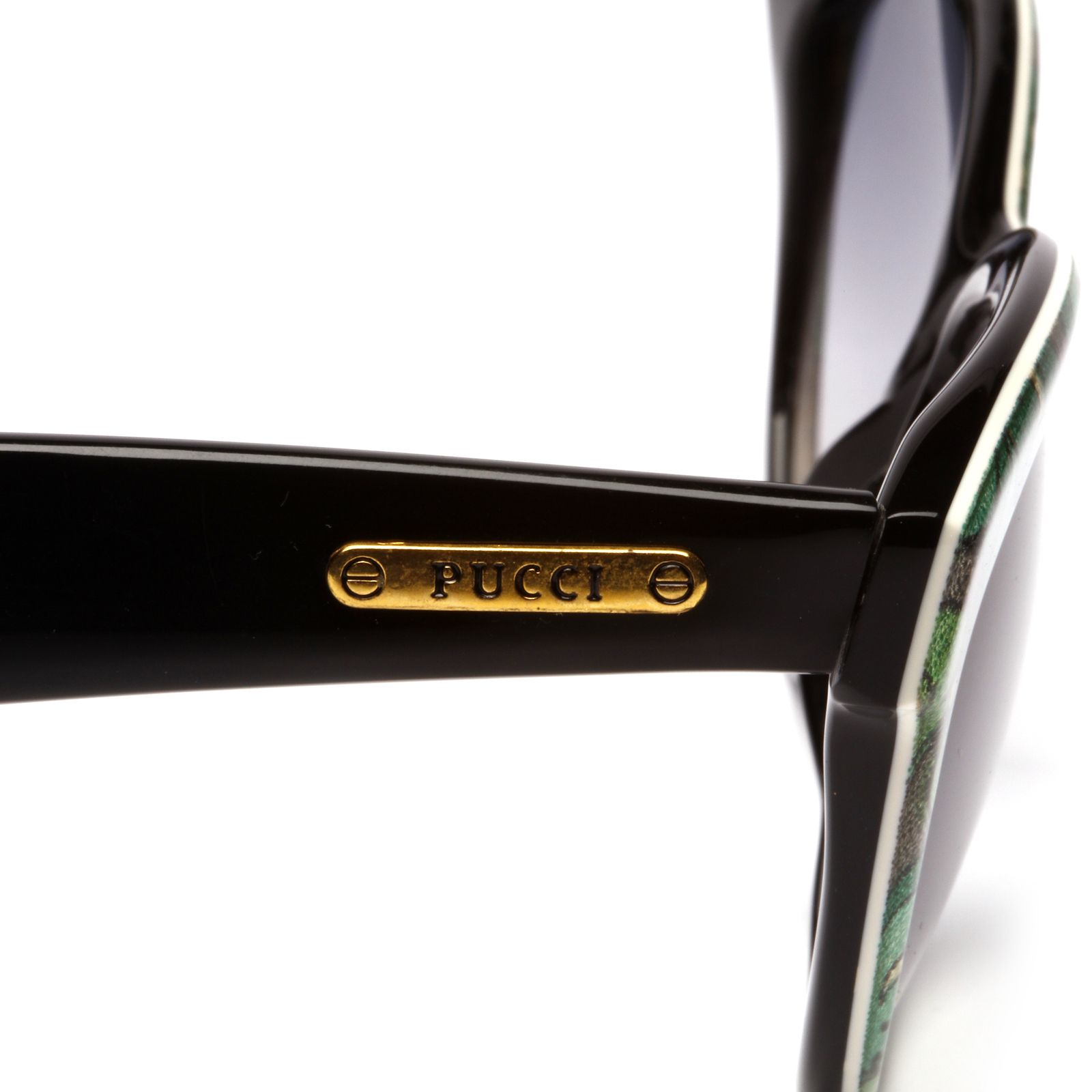 Occhiali da sole Pucci, modello PU57 con inserti in stoffa fantasia Pucci in colore verde.