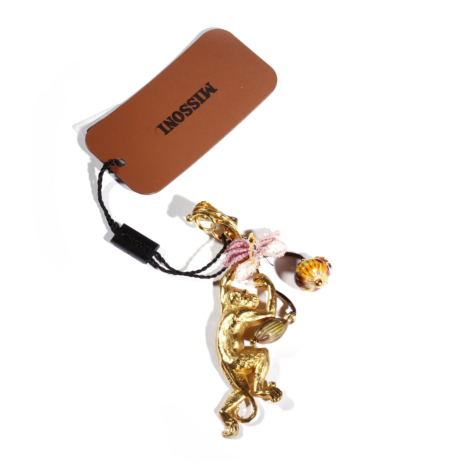 Orecchino singolo lungo a clip Missoni, raffigurante una scimmietta, in metalllo dorato, perline e fiocchetto in tessuto. Etichetta e scatola originale.