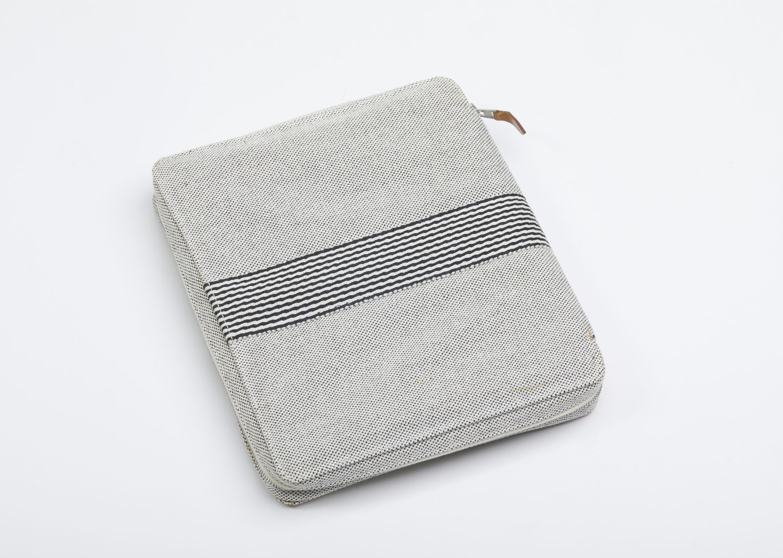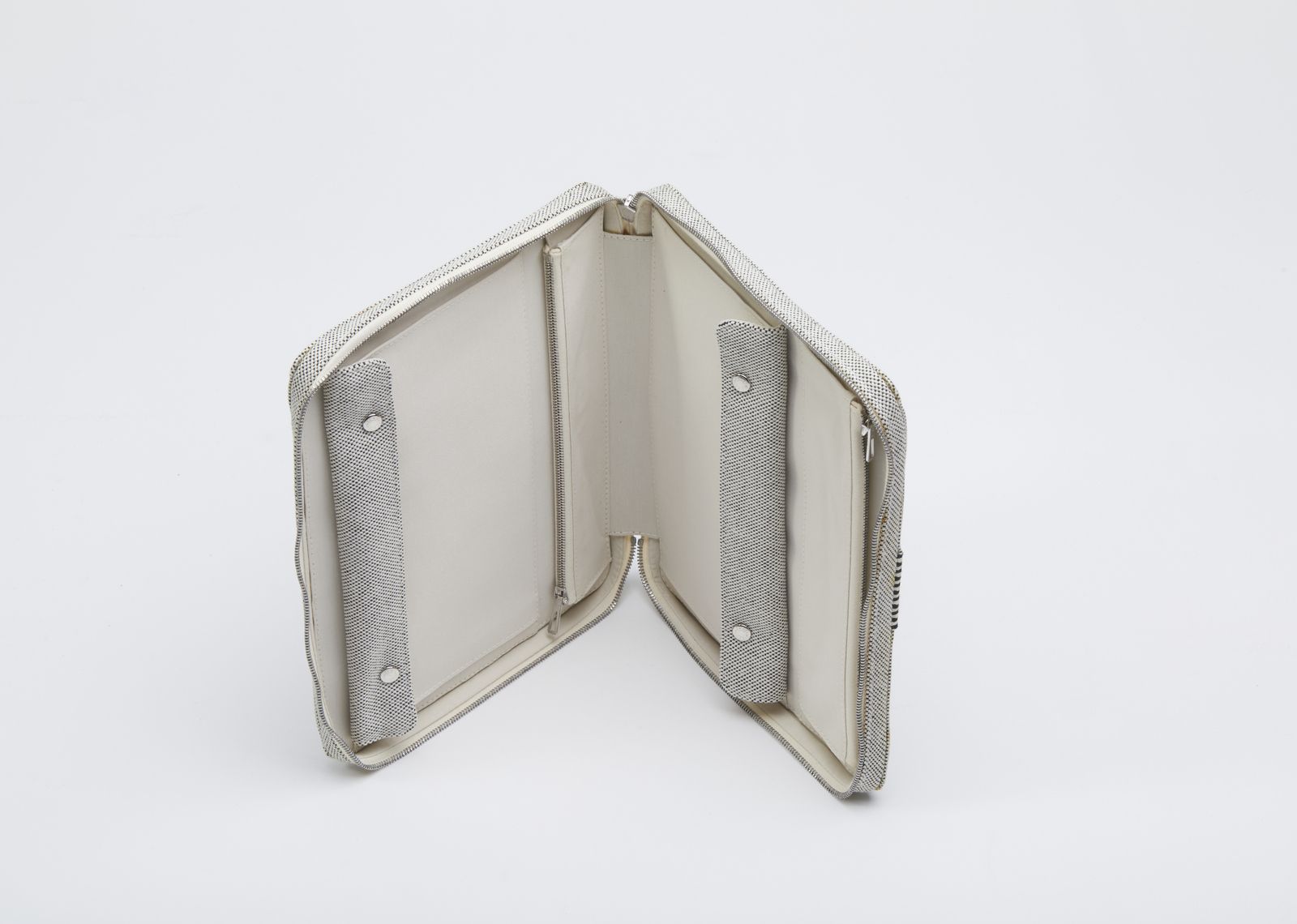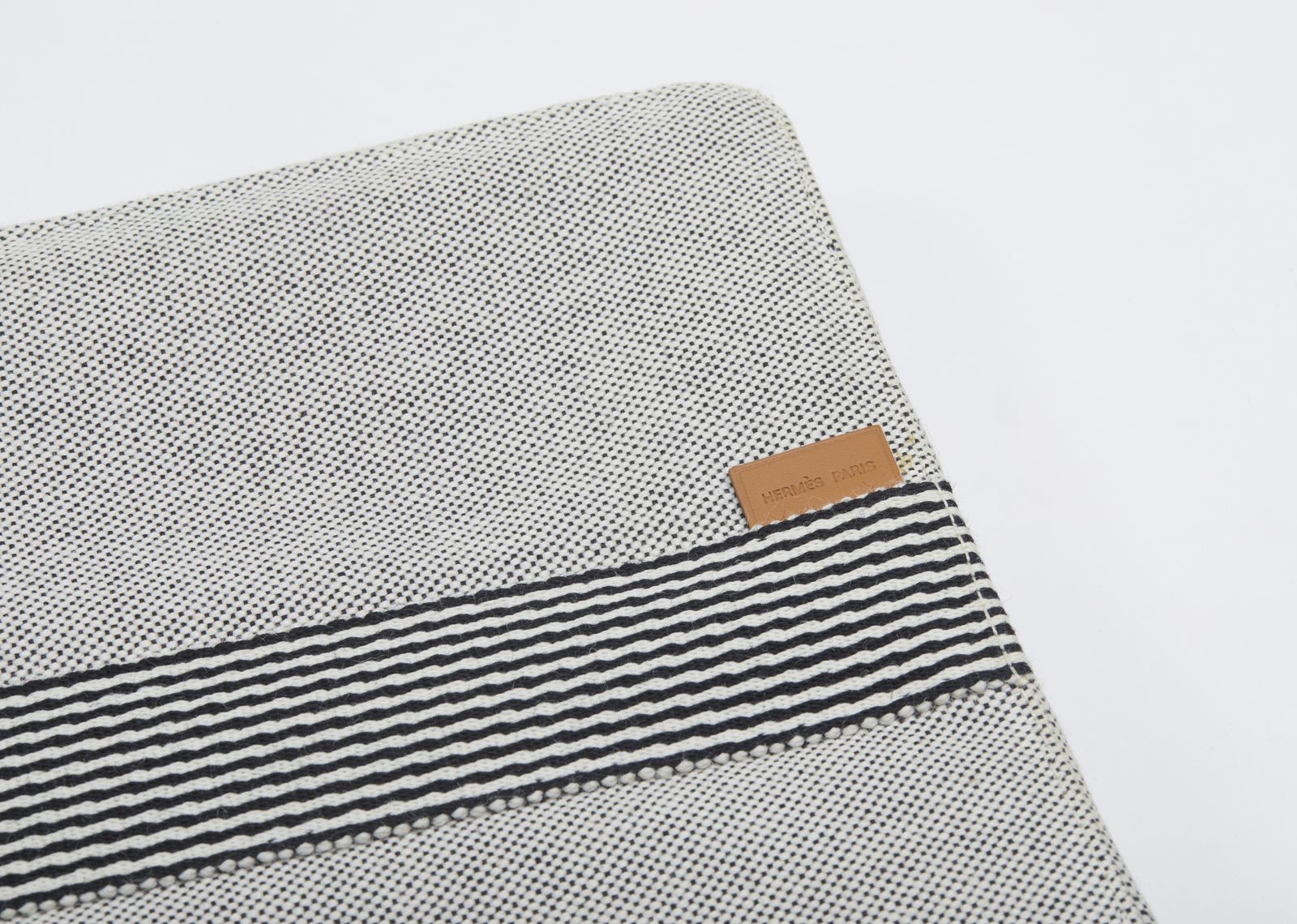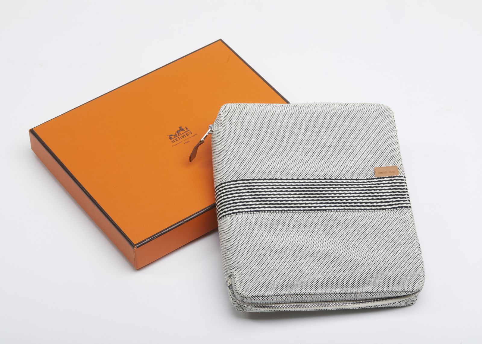Porta documenti in cotone grigio Hermès vintage, banda centrale con loghi Hermès H, collezione Herline, chiusura a zip, tasche interne in tessuto bianco chiuse con bottoni a pressione, una tasca interna chiusa da zip. Scatola originale.