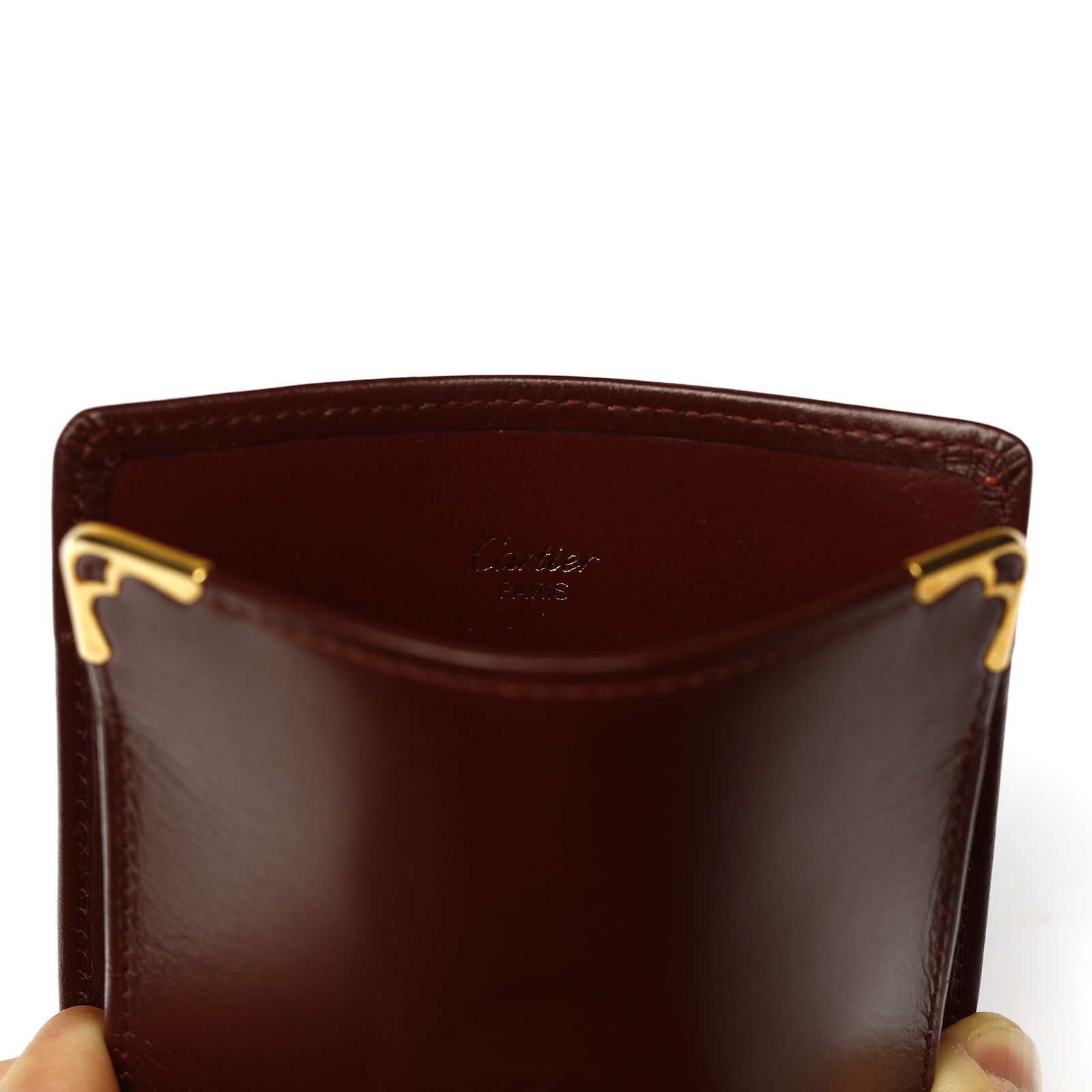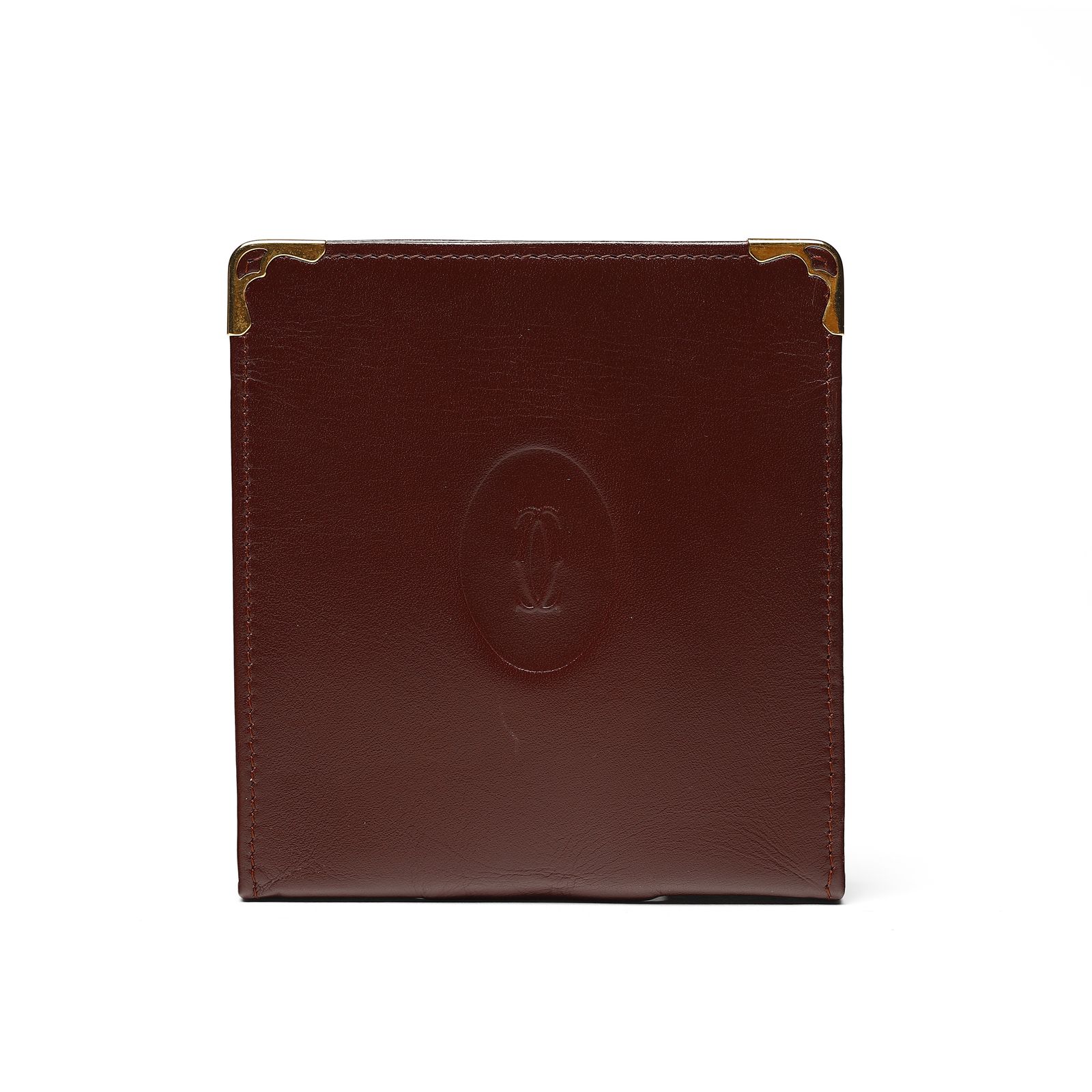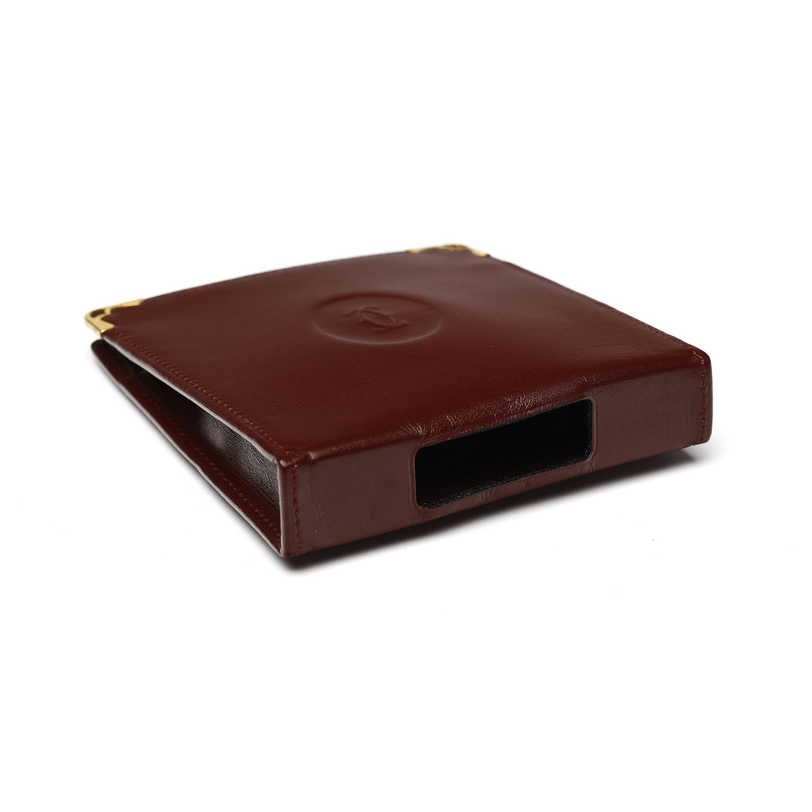 Porta sigarette color bordeaux, agli angoli hardware dorato e logo impresso. Certificato di autenticità presente.