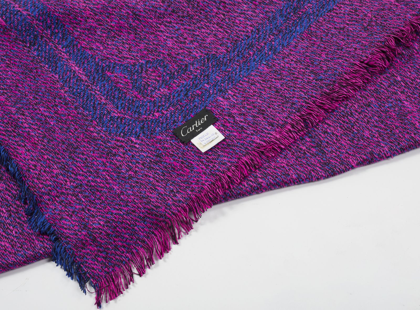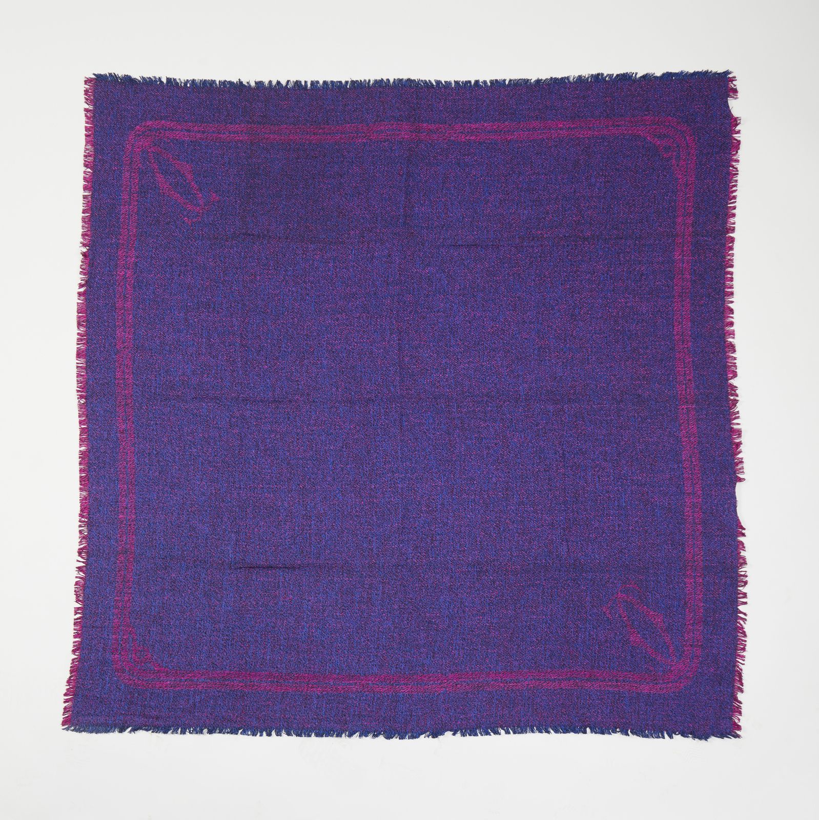 Importante scialle in tweed di seta, nei toni del blu elettrico e fucsia, logo nella tessitura agli angoli.
