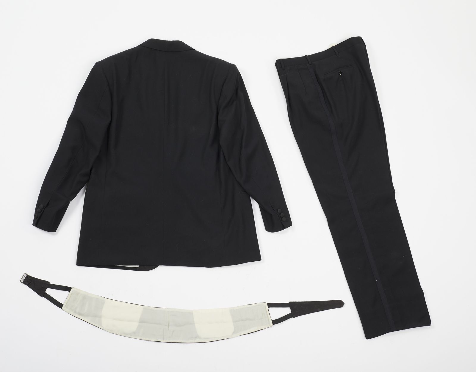 Classico smoking da uomo composto da giacca, pantalone e fascia. Spalla 47 cm, lunghezza giacca 82 cm, lunghezza fascia 107 cm, Lunghezza pantalone 97, vita 41 cm.