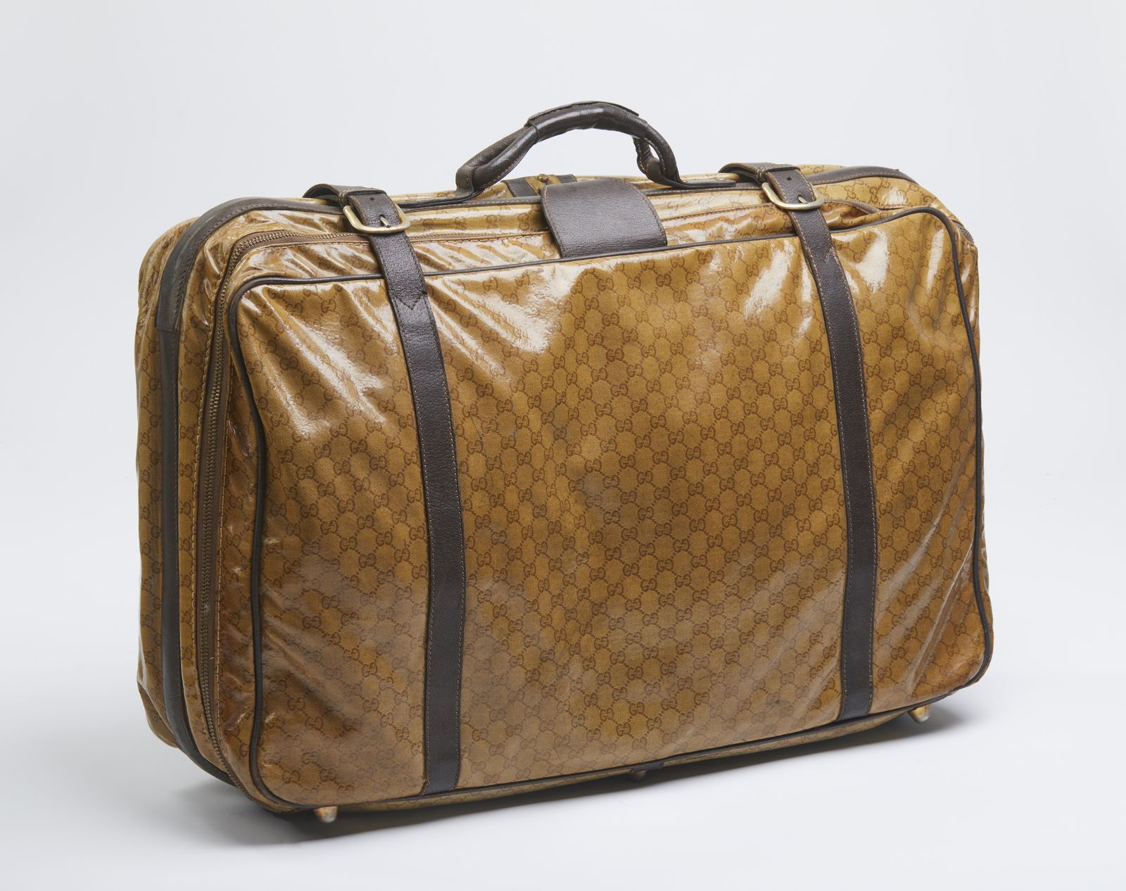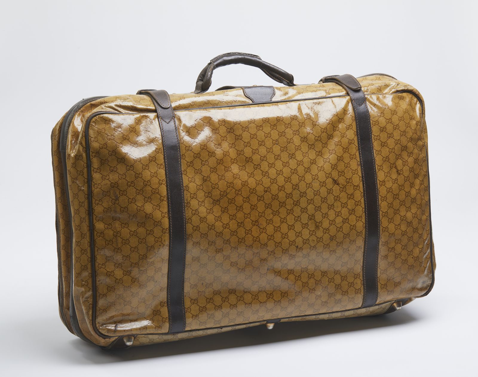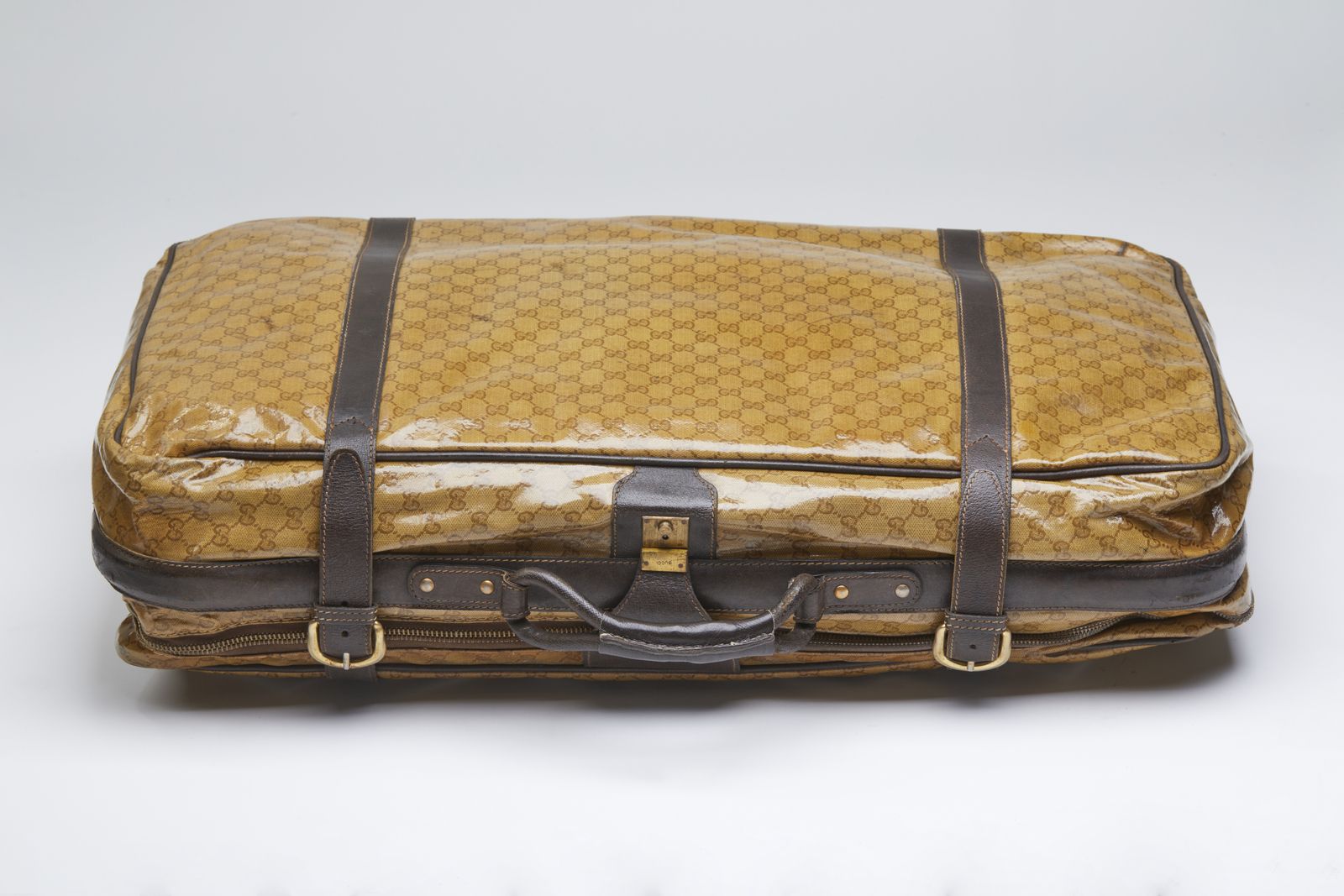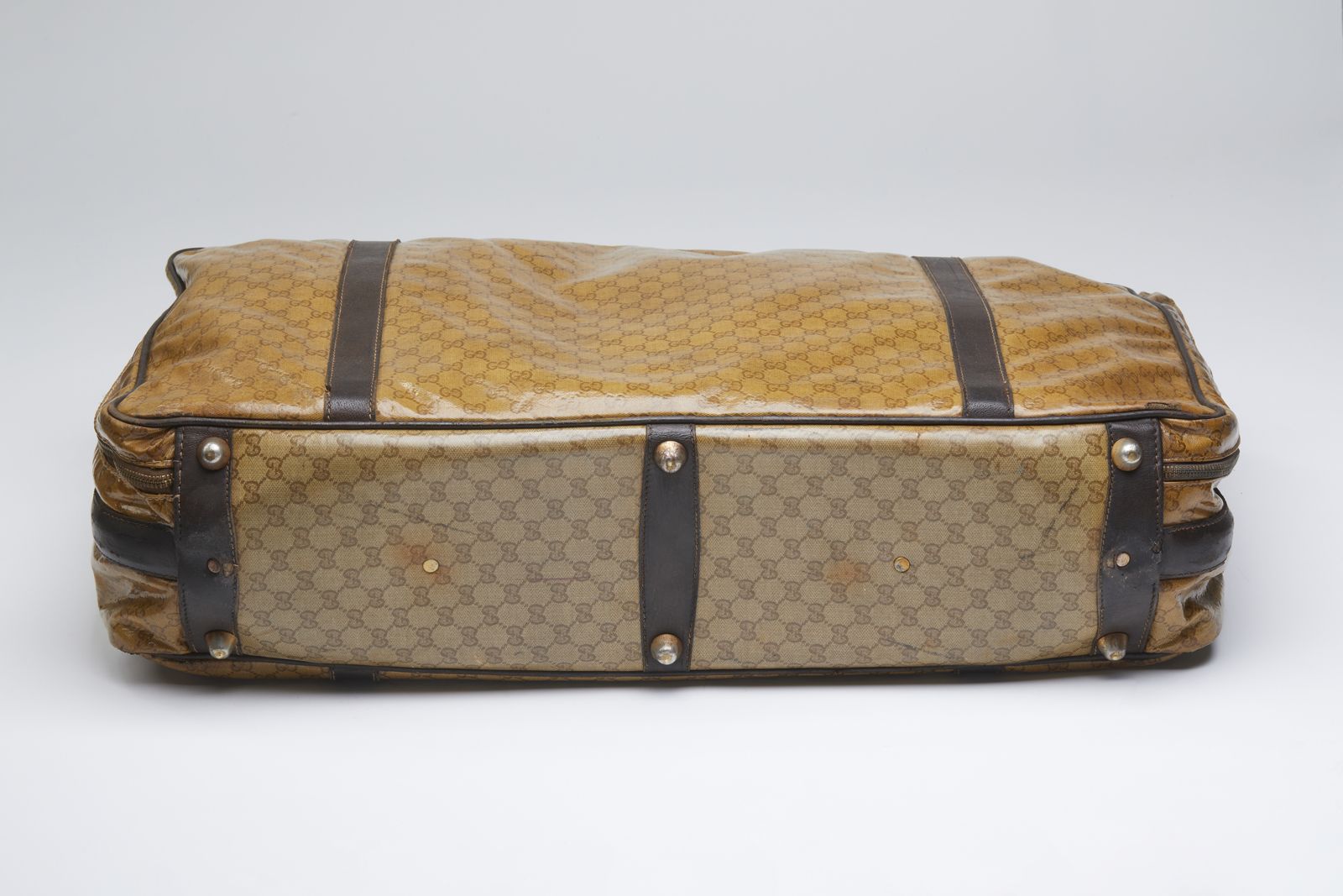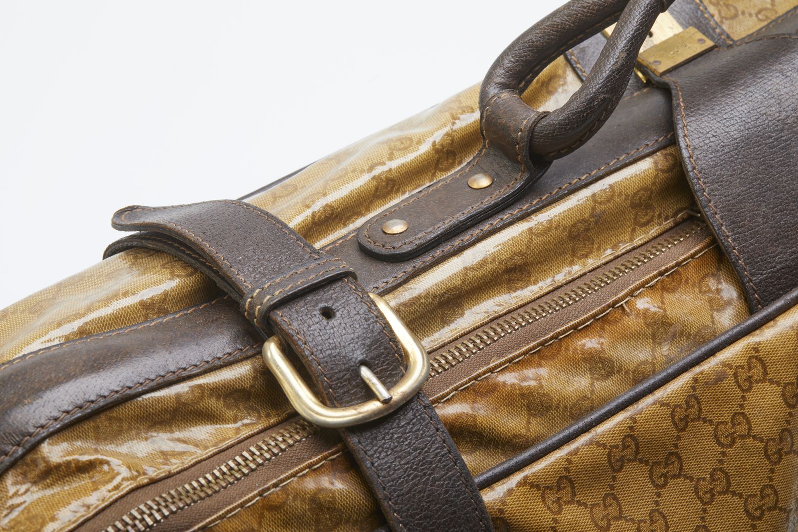 Valigia Gucci vintage in tessuto monogram GG Guccissima lucido con finiture, manico e doppia cinghia in pelle marrone scuro. Chiusura con zip, funzionante. Firma Made in Italy by Gucci all'interno, stampato Gucci sulla chiusura, interni in tessuto ocra. Sei piedini alla base. Lievi segni del tempo.