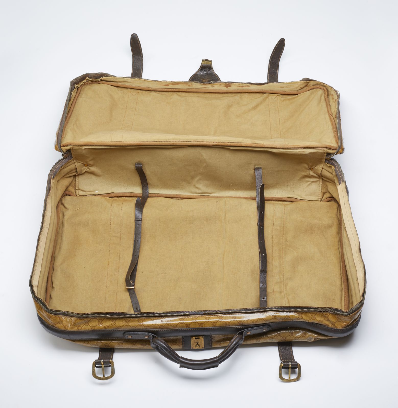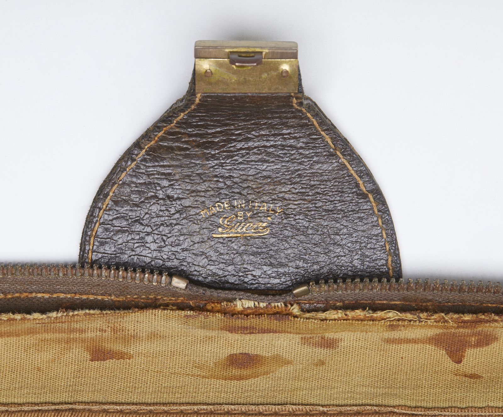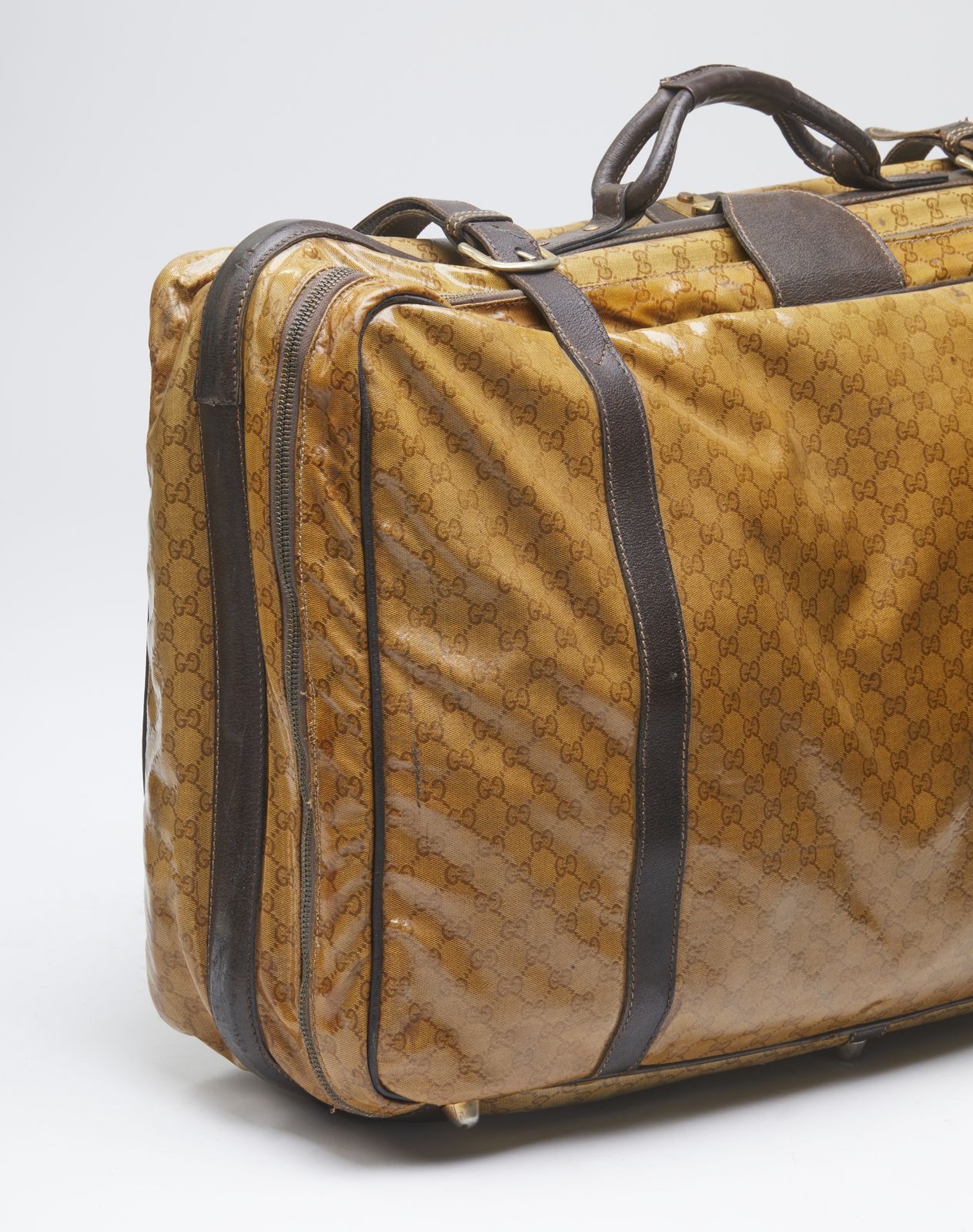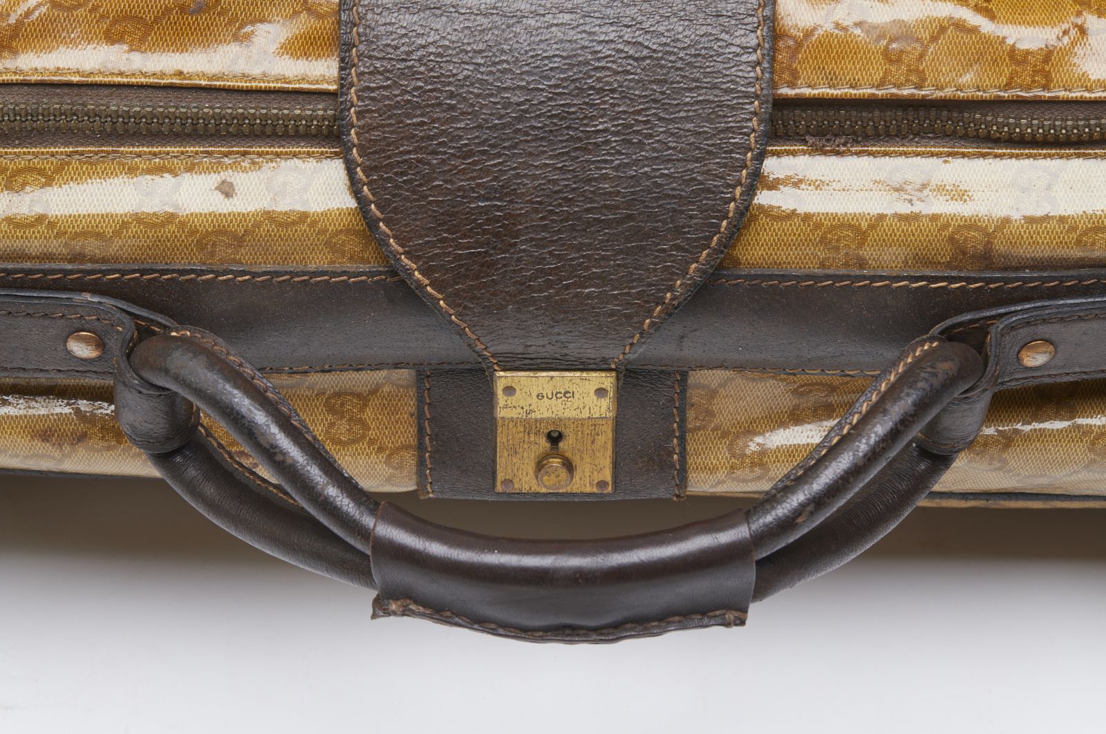 Valigia Gucci vintage in tessuto monogram GG Micro Guccissima lucido con finiture, manico e doppia cinghia in pelle marrone scuro. Chiusura con zip, funzionante. Firma Made in Italy by Gucci all'interno, stampato Gucci sulla chiusura, interni in tessuto ocra. Sei piedini alla base. Lievi segni del tempo, patina, piccole scuciture sulla parte superiore vicino alla zip.