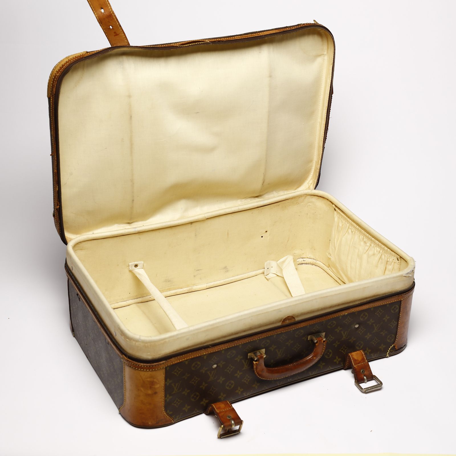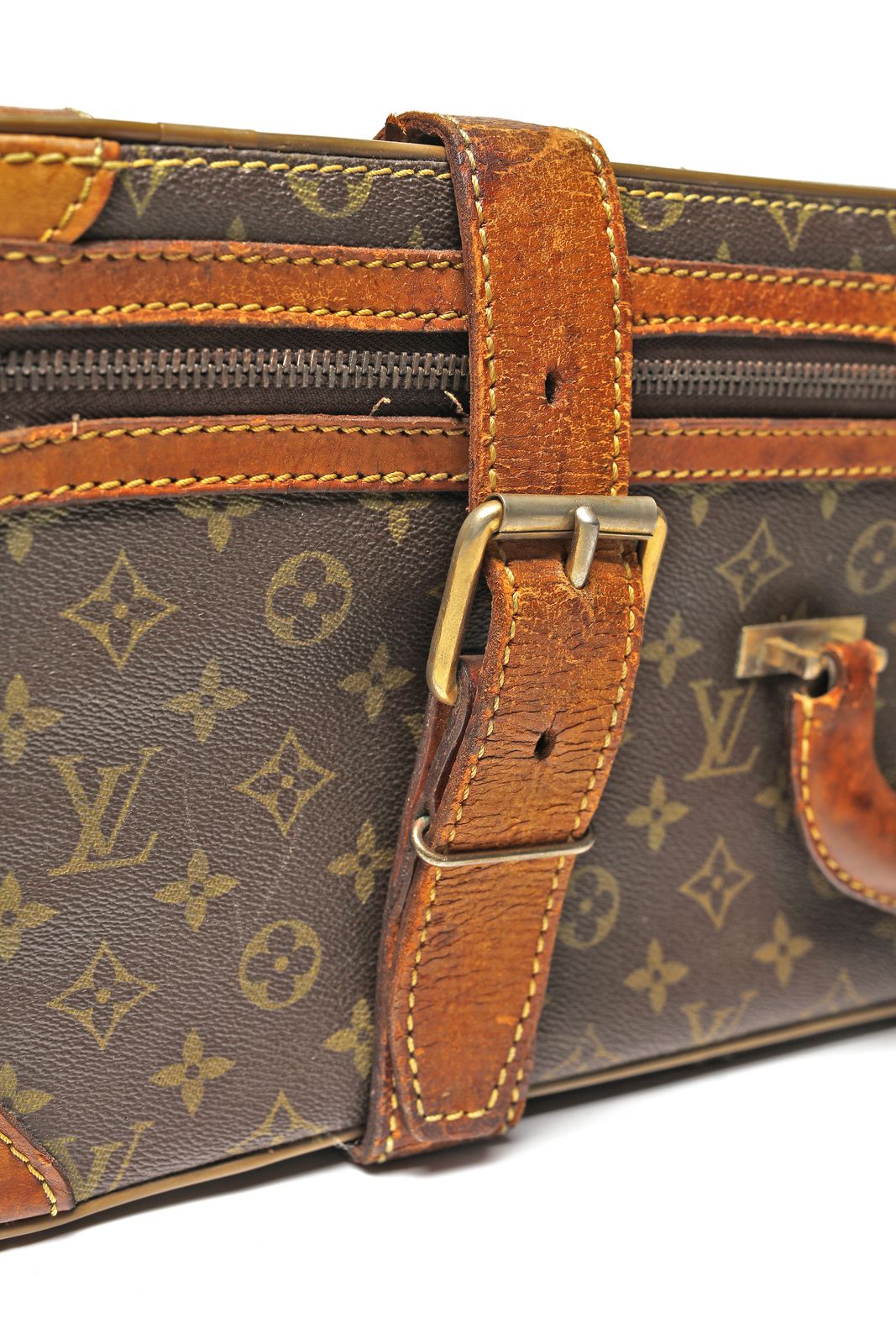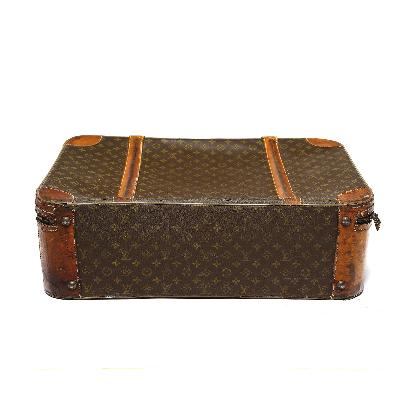 Grande valigia rigida Louis Vuitton vintage, chiusura a zip, in pelle monogram con dettagli ed angoli in vacchetta. Difetti presenti, patina, segni del tempo.