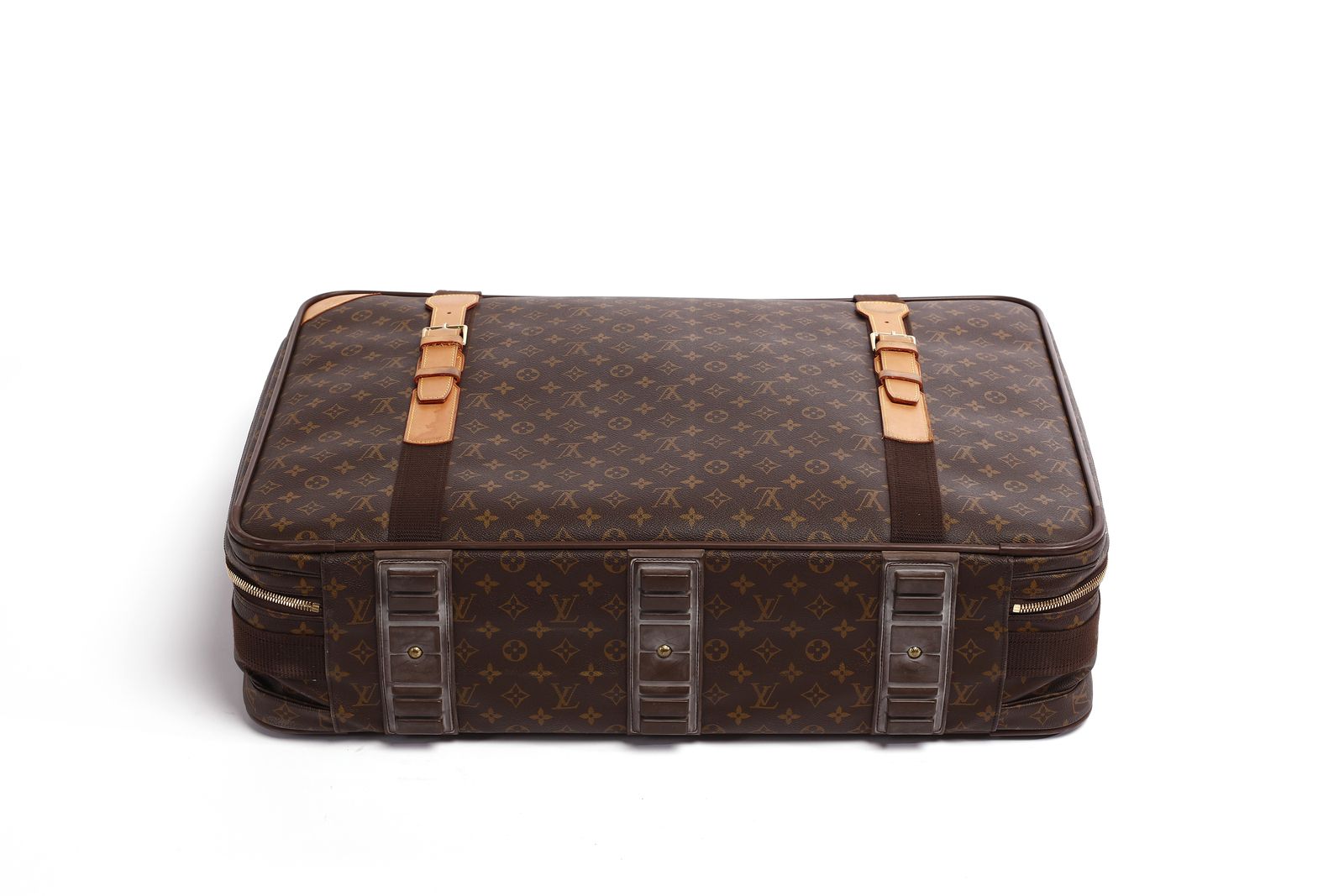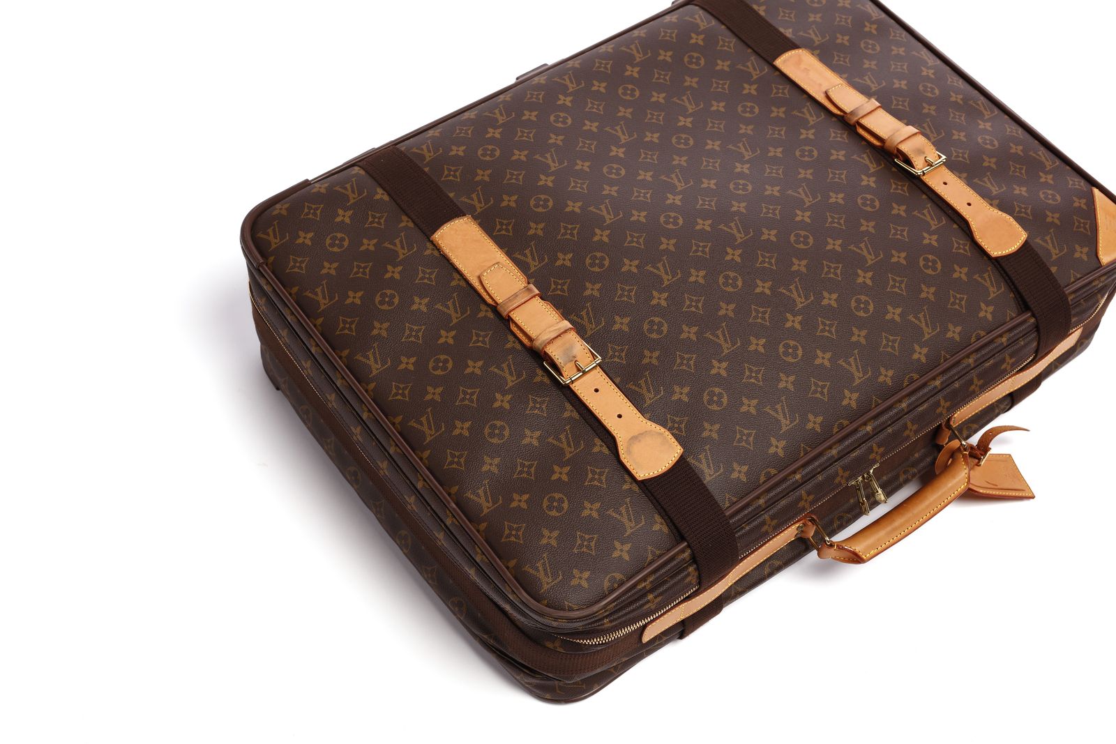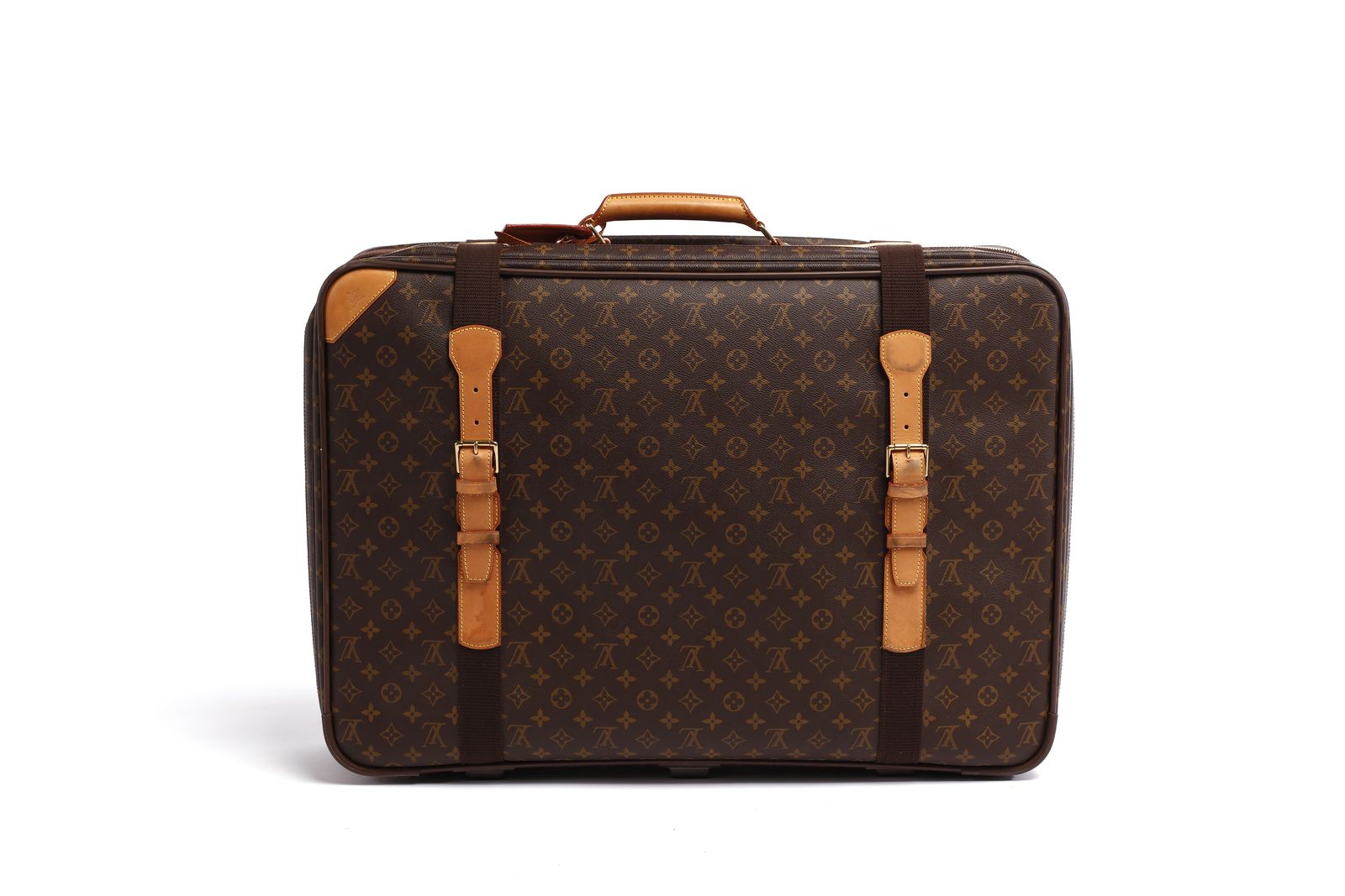 Valigia Sirius 65 semi rigida, due passanti con fibbie, tessuto logo monogram, dettagli in vacchetta, angolo superiore con logo impresso, interno in tela beige, Presente lucchetto e chiave.
