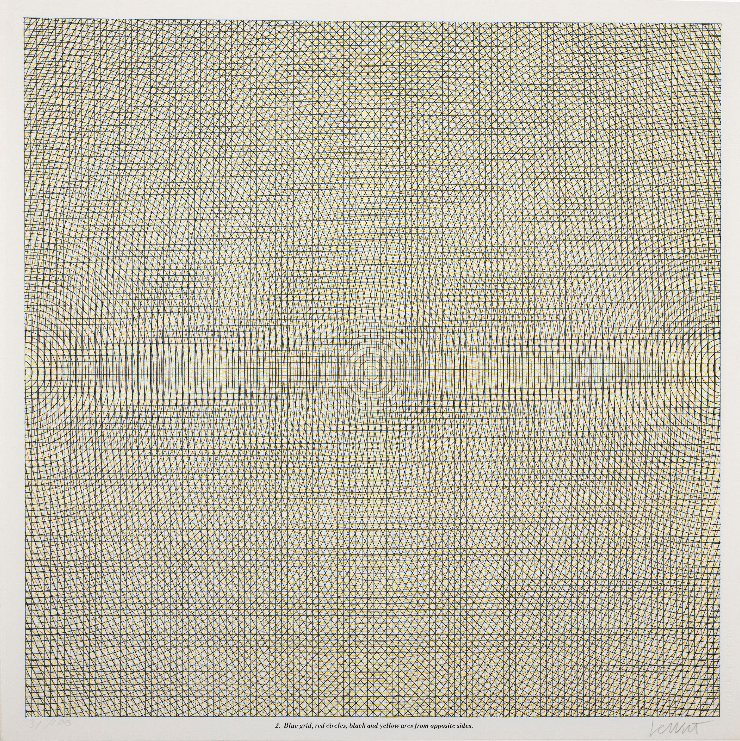 serigrafia a colori, es. 31/100, cm 38 x 38 (misure del foglio), (sc) 1972 Firma a matita in basso a destra Tavola n°2 dalla cartella Arcs from sides or corners grids circles In basso a destra timbro a secco dell'editore Artestudio, Macerata