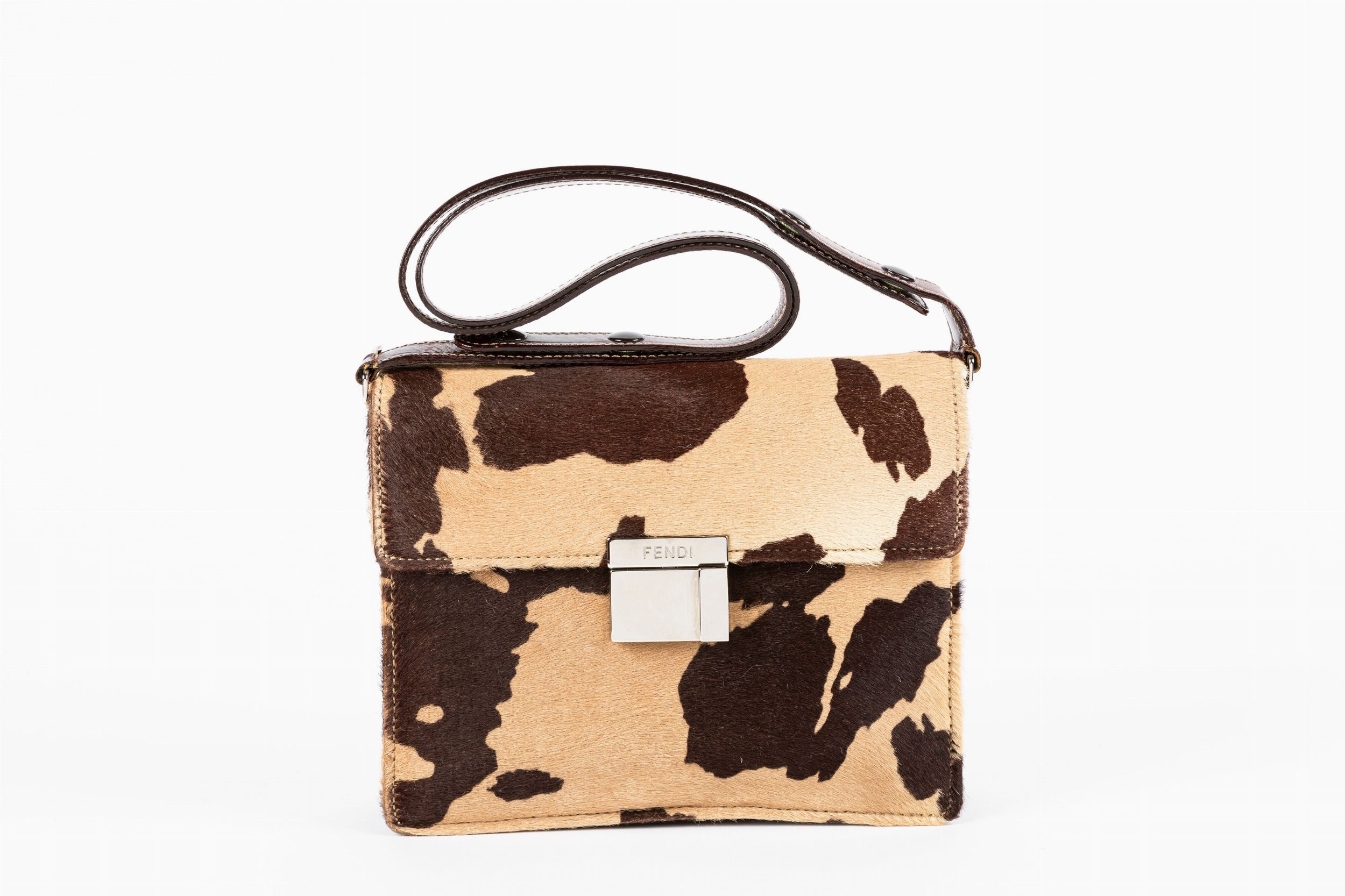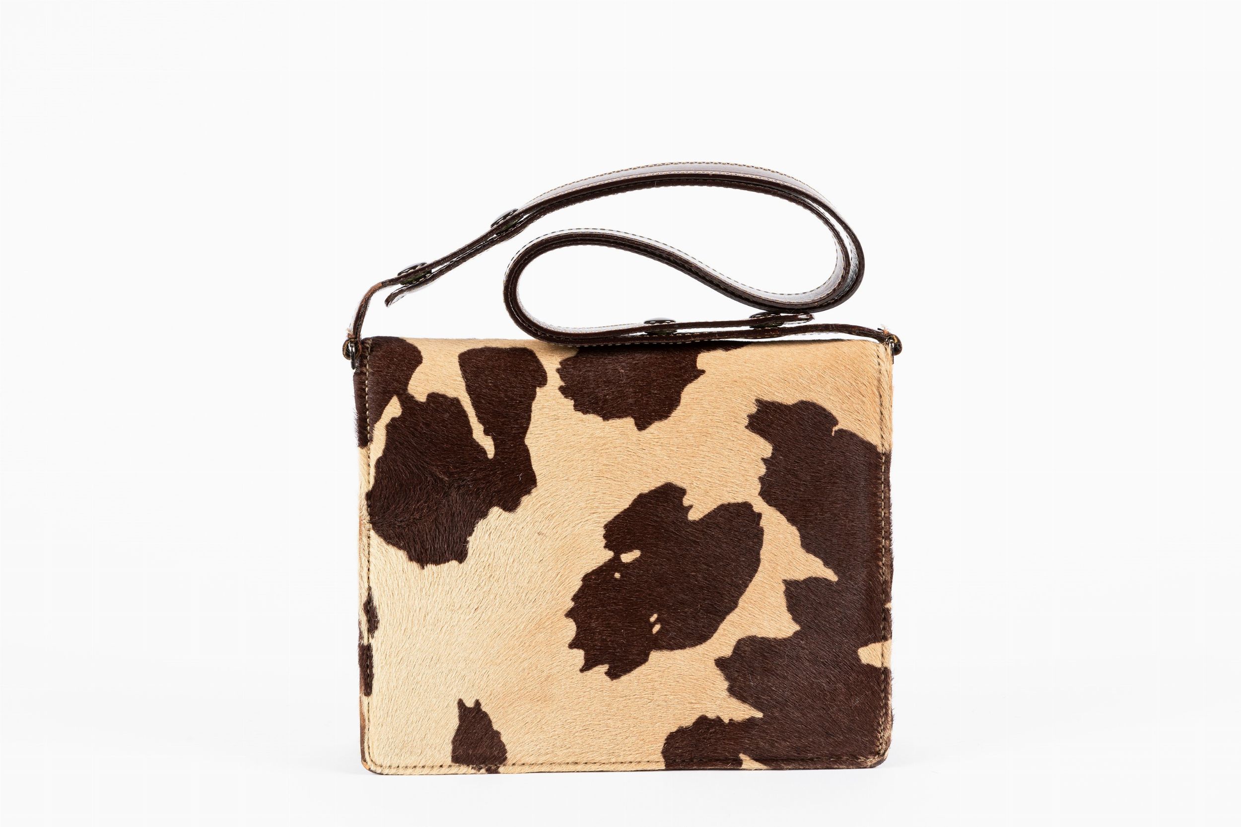 in pelle di cavallino bicolore, tracolla in pelle allungabile, dettagli in metallo, con sacchetto (lievissimi difetti)