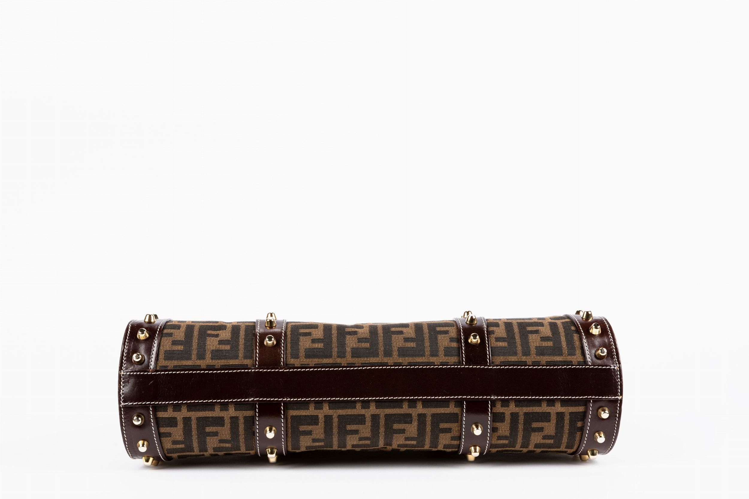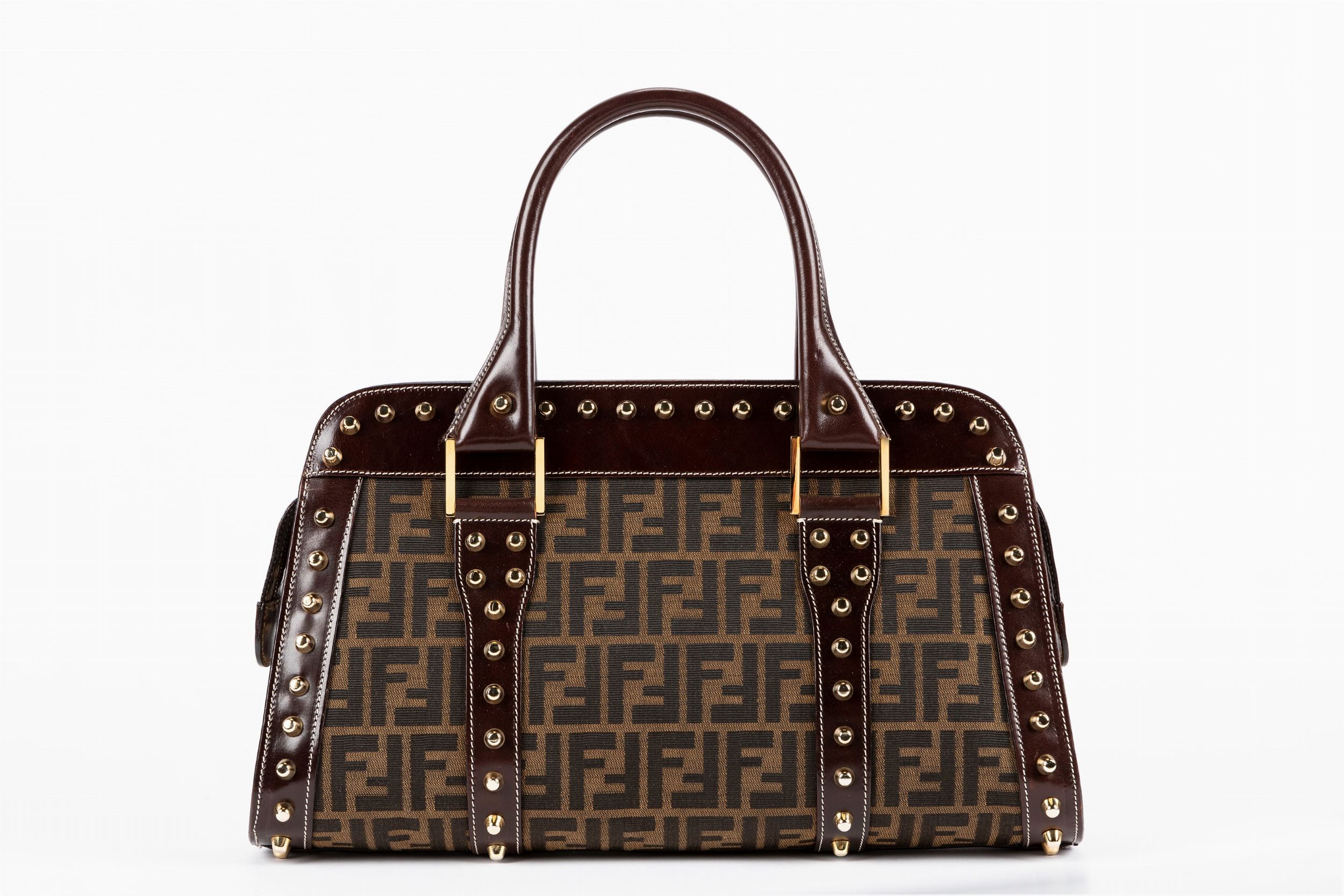 in tela Zucca, profili e manici in pelle color marrone, con borchie dorate, chiusura zip, cm 43