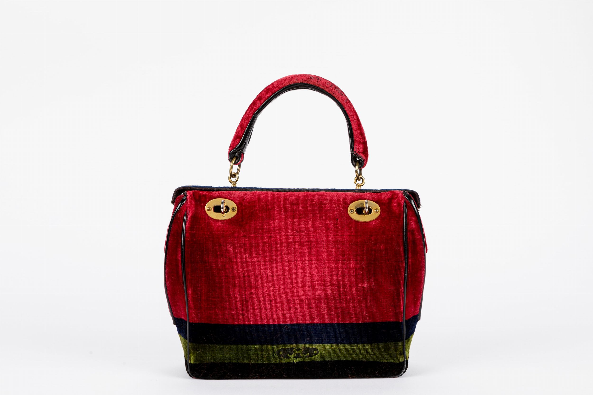 in velluto color rosso, verde e blu, dettagli in metallo dorato, cm 21 (difetti)