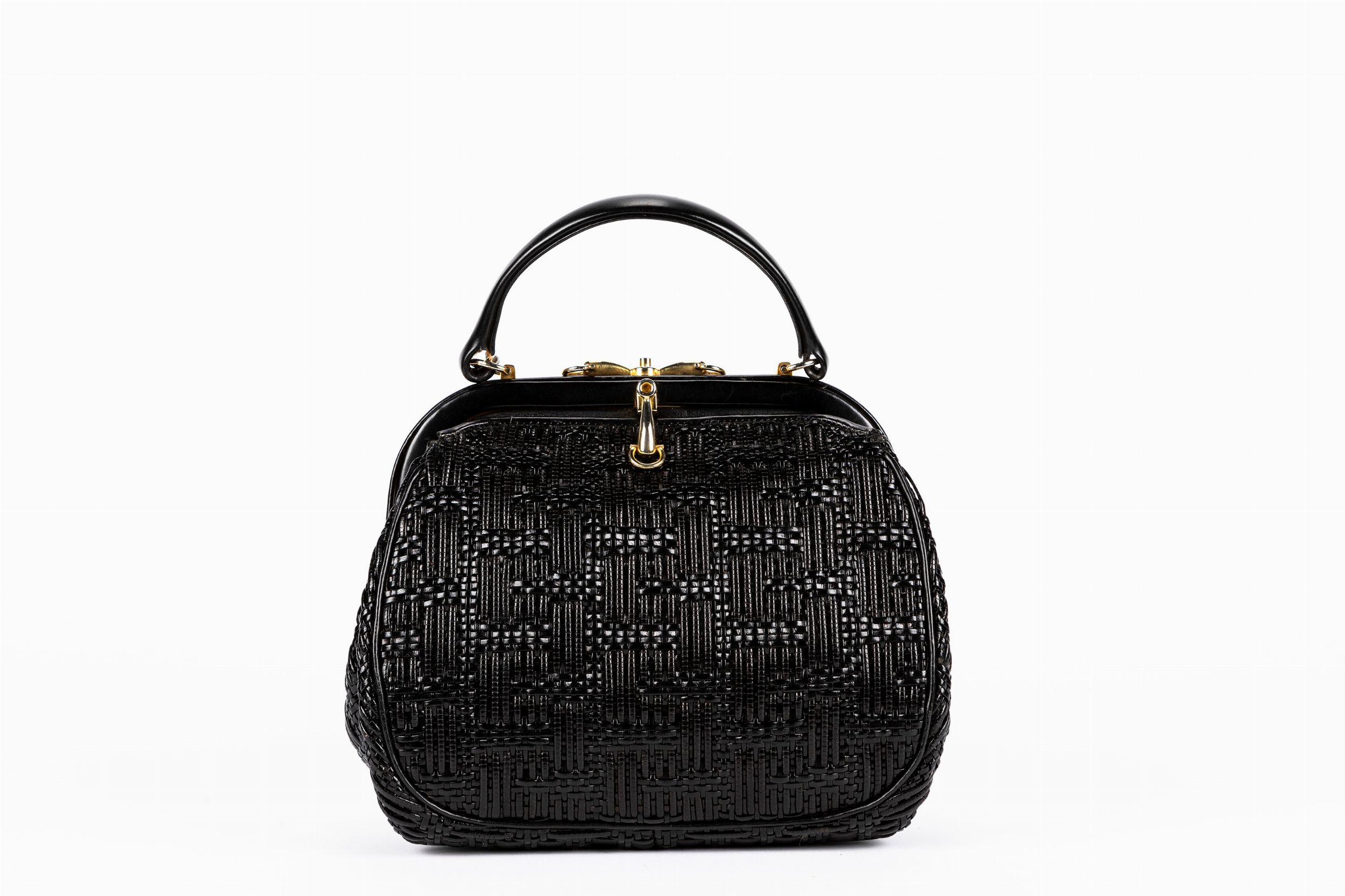 in pelle intrecciata color nero, manico standato, dettagli in metallo dorato, tasca frontale, cm 23 (difetti)