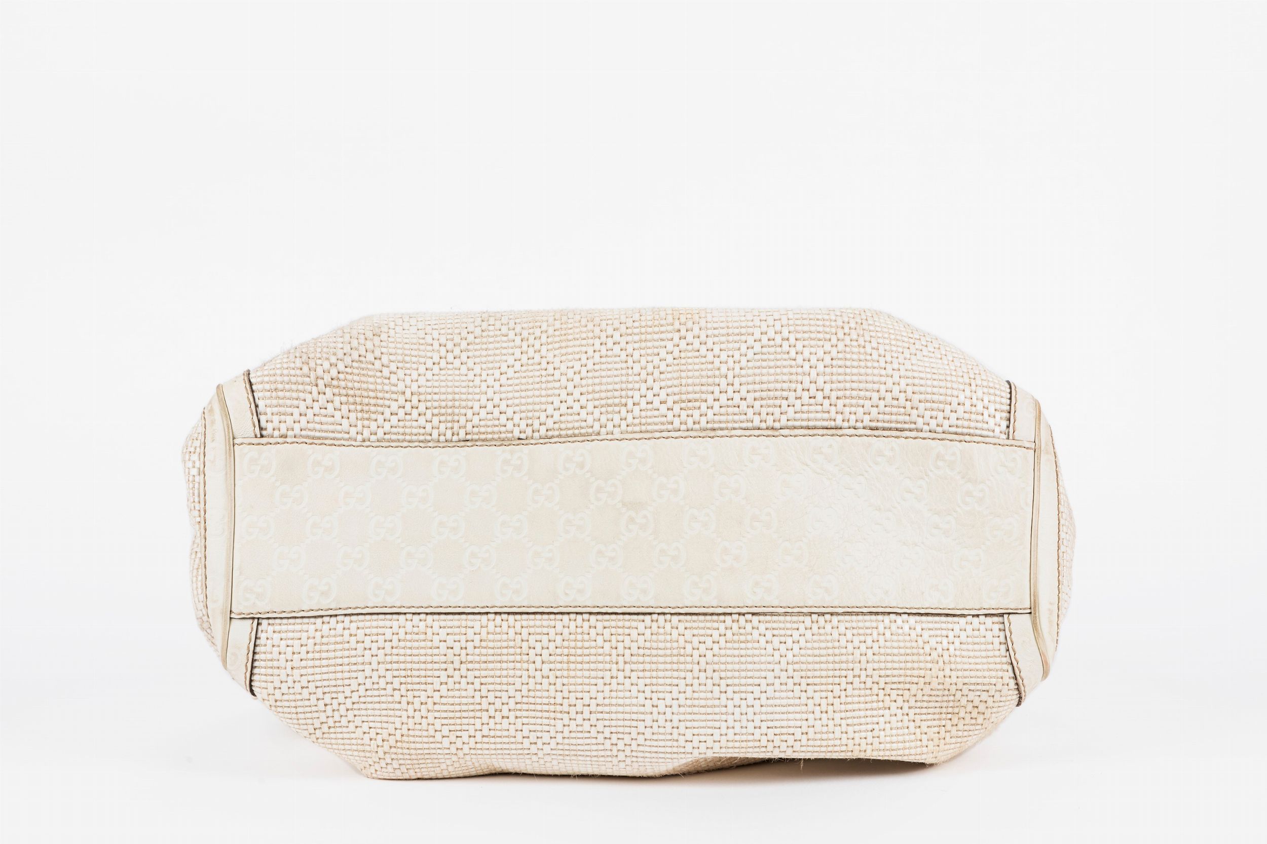 in rafia lavorato a motivo geometrico color panna, profili e doppi manici in pelle logata, dettagli in metallo, cm 42 (difetti)